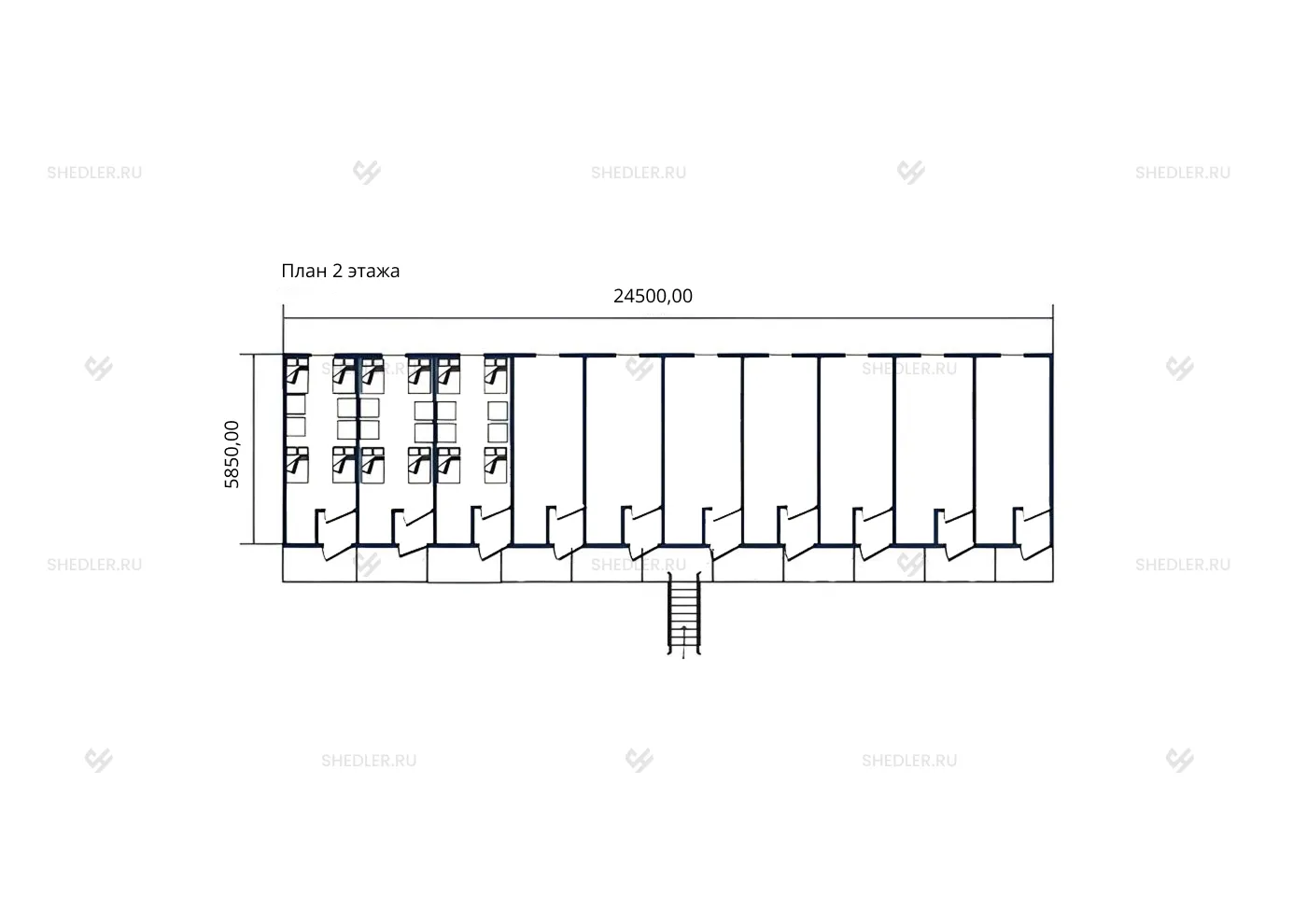 Двухэтажное сооружение размером 24,5 x 5,85 х 5,9 м имеет площадь 286,65 кв.м. Перемещение между этажами обеспечивает прямая лестница с площадкой, а естественное освещение и вентиляцию помещений – 20 ПВХ-окон размером 1,0 х 0,8 м с поворотно-откидным механизмом открывания. Еще 2 окна размером 0,5 x 0,5 м находятся в сантехнических помещениях.