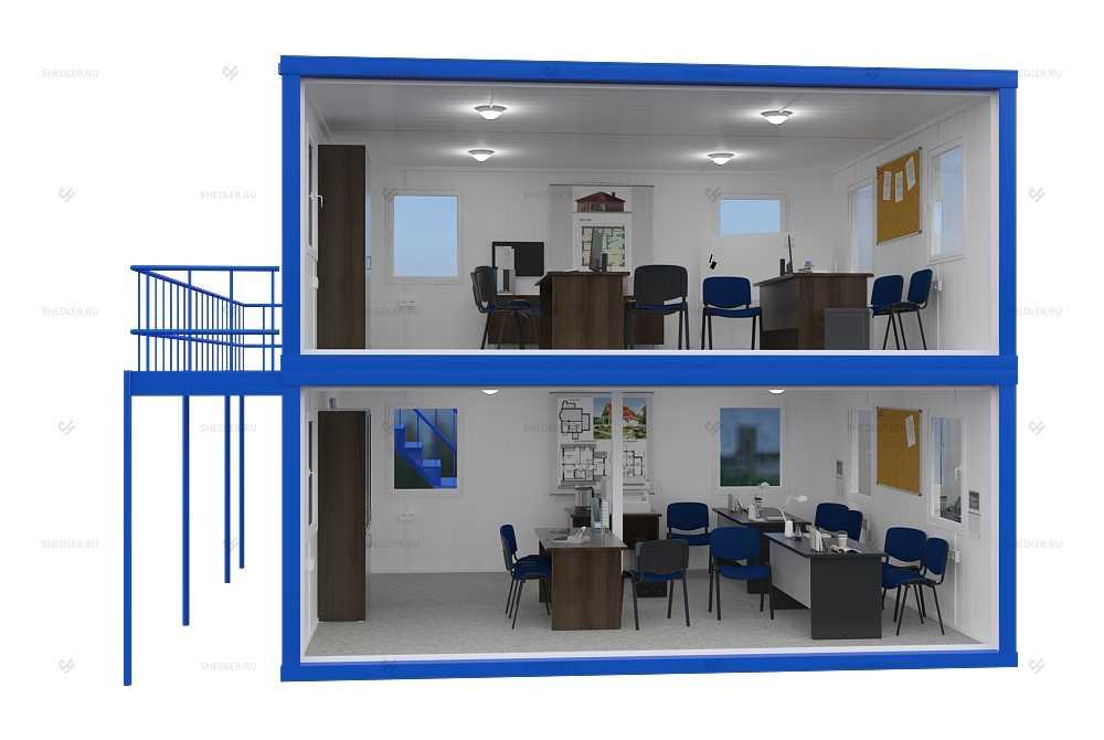 Благодаря габаритам 6,0 x 4,9 x 4,9 м модель можно установить даже на ограниченном пространстве, общей площади 29,4 кв.м достаточно для размещения людей, оборудования и другого имущества. Перемещение между этажами обеспечивает прямая лестница с площадкой, а естественное освещение и вентиляцию внутреннего пространства – 10 ПВХ-окон размером 0,8 x 1,0 м с поворотно-откидным механизмом открывания.