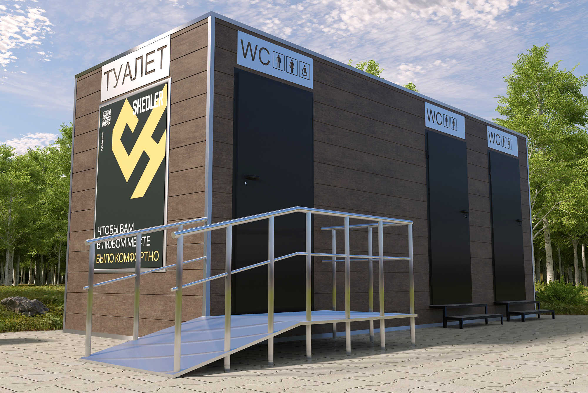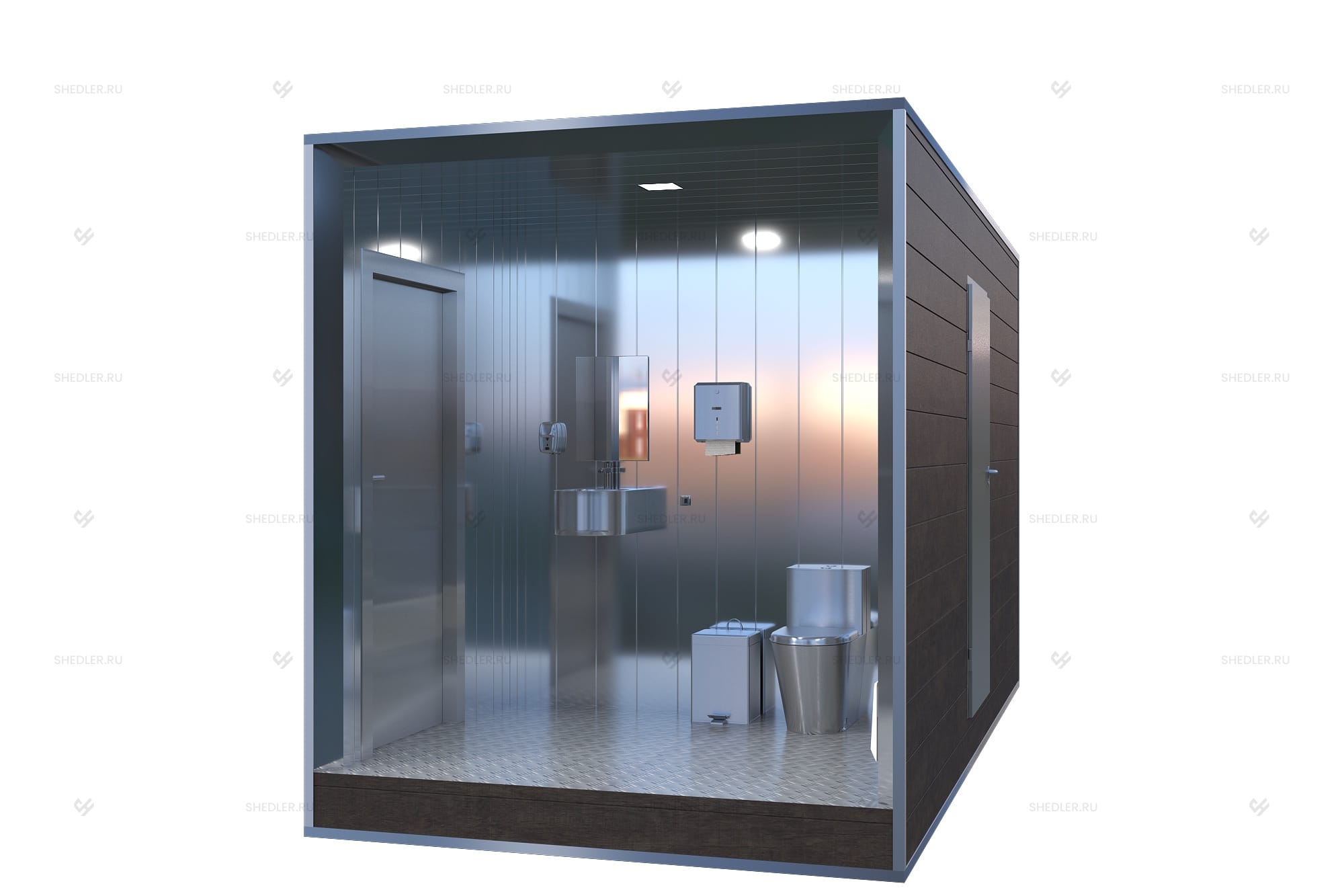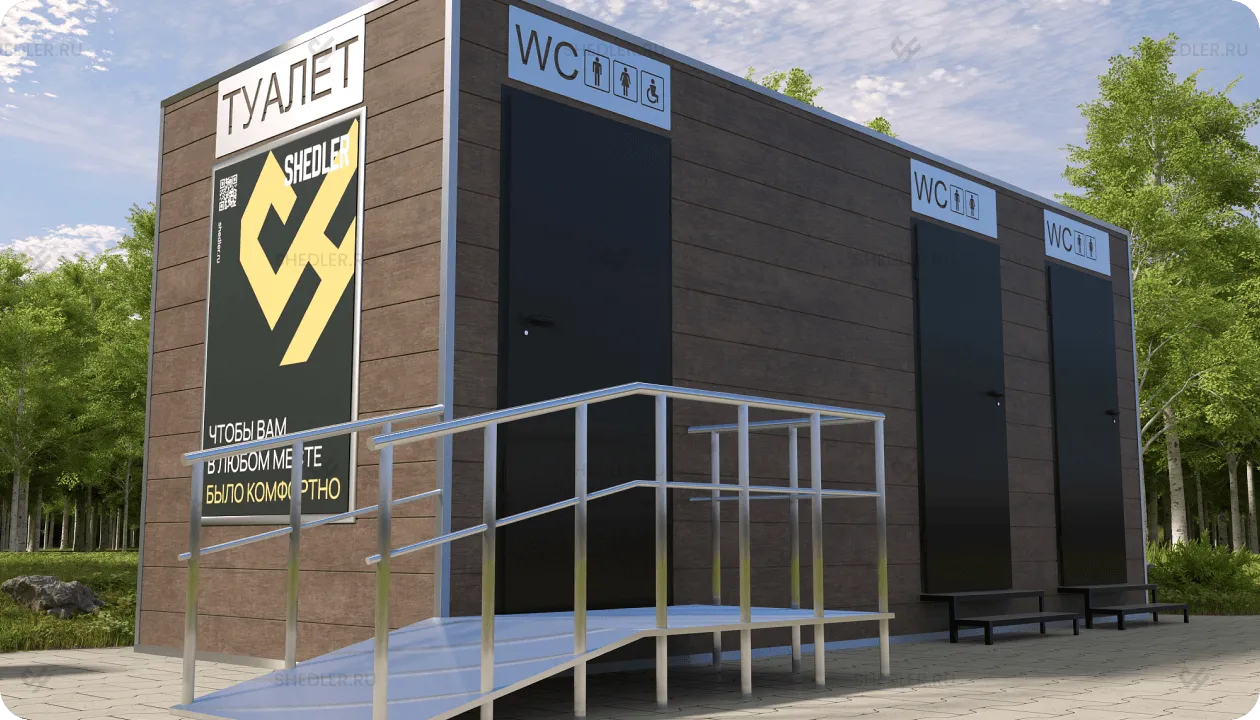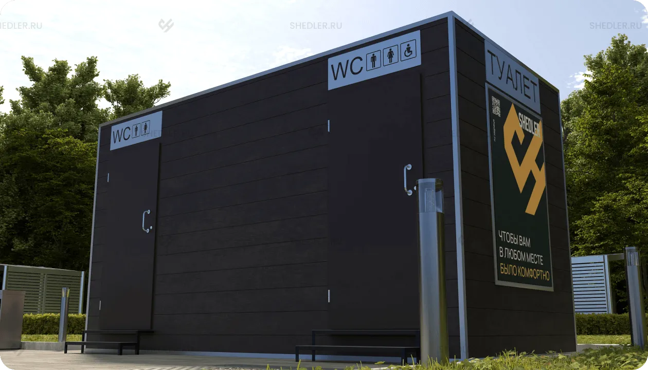 Конструктивно модульные туалеты SHEDLER – это уже готовое помещение из металлоконструкций: несущие функции выполняет металлокаркас, сваренный из швеллера и уголка, а огораживающие – фальцевая крыша из листового железа с обработкой соединительного шва битумной мастикой и фасад из трехслойных сэндвич-панелей или профлиста C8. Наружные поверхности утеплены обернутой в пароизоляцию негорючей базальтовой ватой, она уложена в стенах полу и в потолке. Такое решение обеспечивает прочность, герметичность и энергоэффективность.