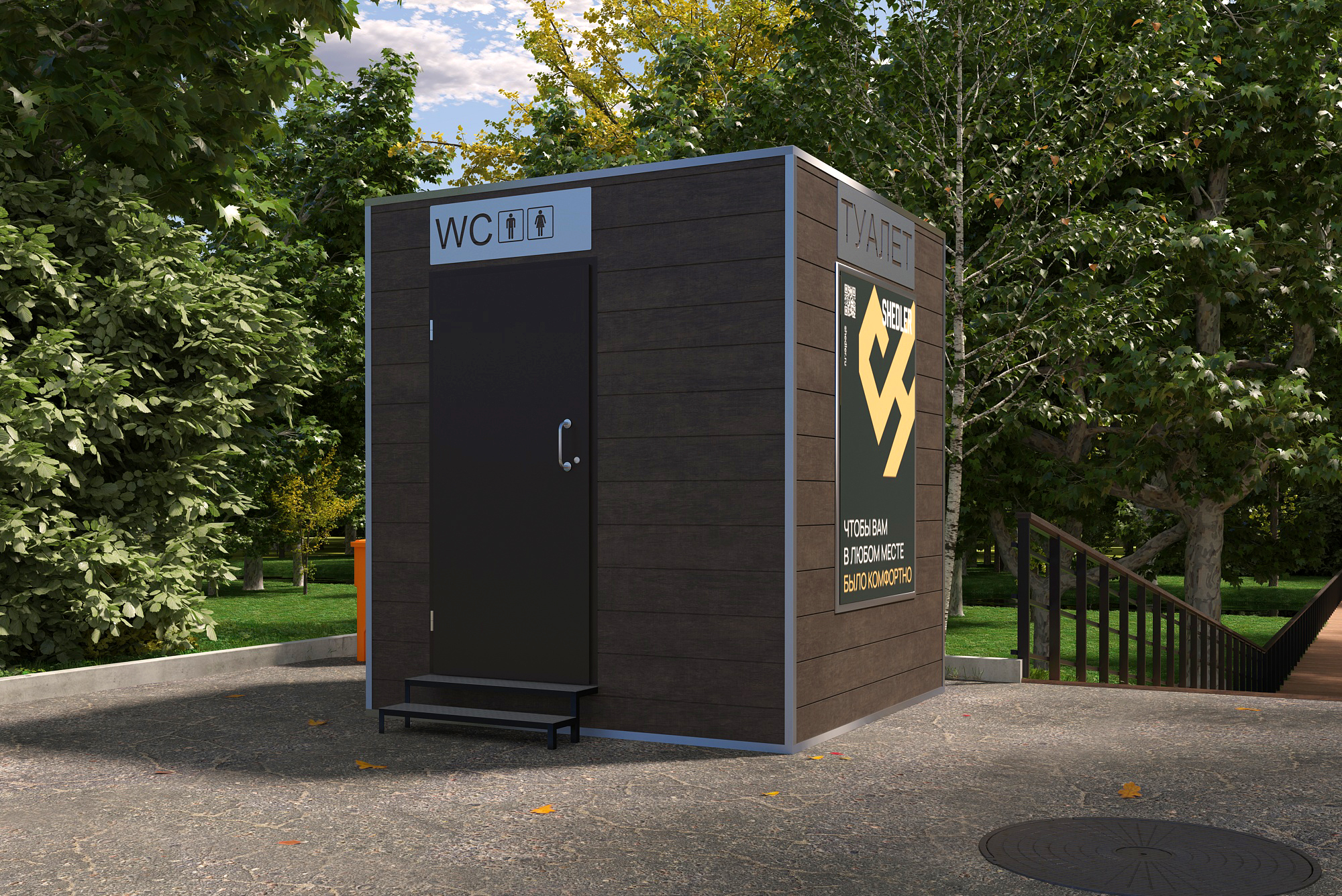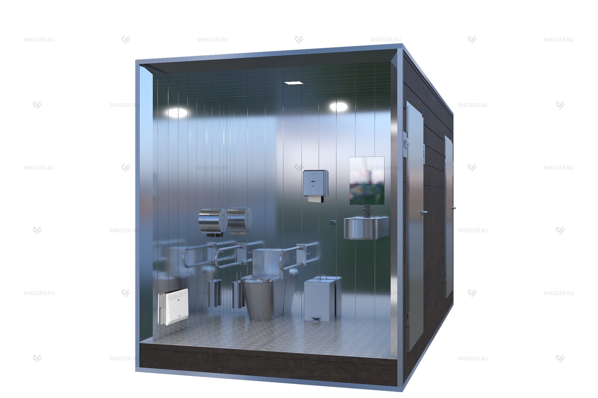 Модульные туалеты SHEDLER ломают устоявшиеся стереотипы об общественных санузлах: посещать их так же приятно, как собственный туалет. Этому ощущению способствует качественная отделка интерьера. На полу из ориентированно-стружечной плиты уложен линолеум, стены облицованы ПВХ-панелями, а потолок – пластиковой вагонкой. Способ отделки интерьера объясняется влагостойкостью материалов, грязеотталкивающими свойствами.