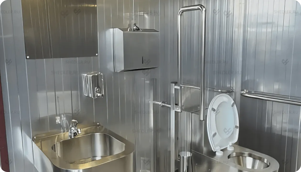 Удобство в эксплуатации обеспечивается и техническим оснащением объекта: помимо светодиодного освещения в модульных туалетах устанавливается полный набор сантехники – раковины, унитазы, смесители, писсуары, чаши Генуа. Если модульный туалет устанавливается в общественных местах, то используется антивандальная сантехника, для удобства маломобильных групп населения монтируются поручни, перила, в таких кабинках сантехника устанавливается на удобном для людей с ограниченными возможностями уровне.