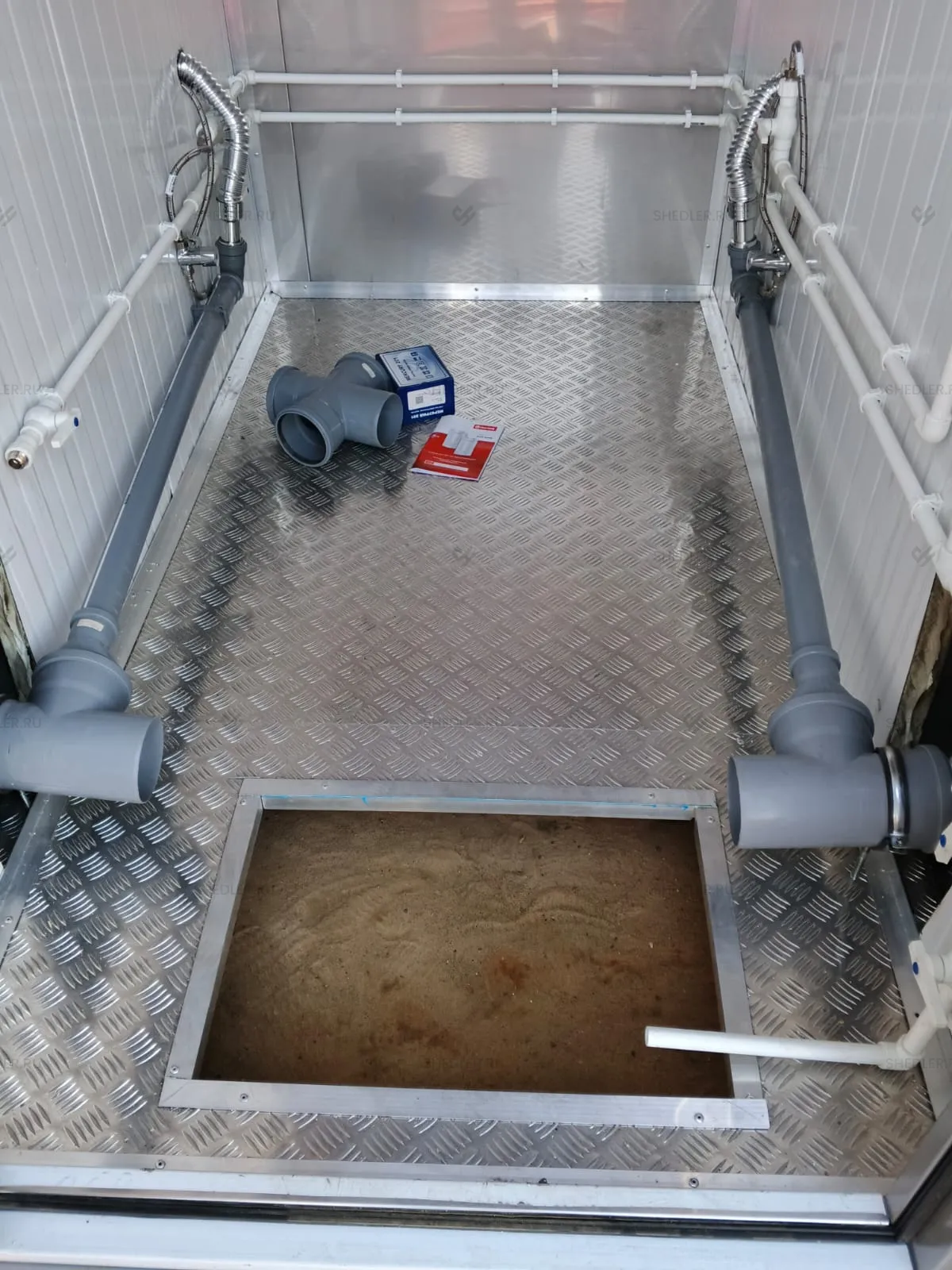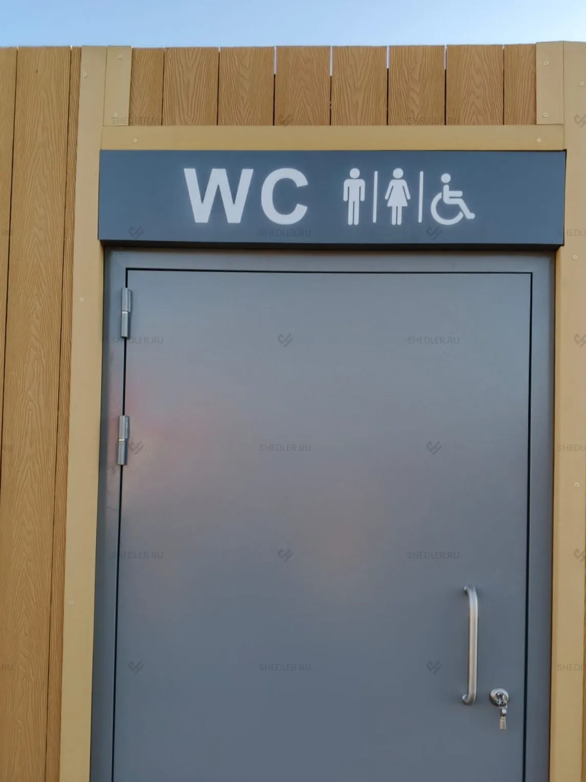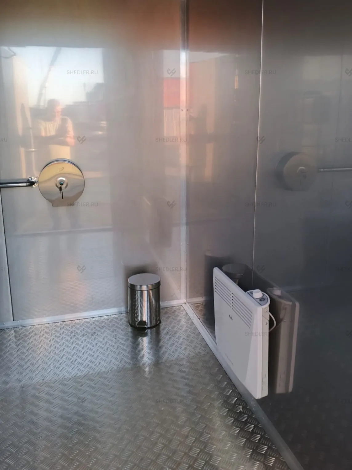 Конструкция полностью готова к использованию. Есть бак для воды и очистные сооружения. Установлены две металлические двери с врезными ручками и замками для входа в каждую кабинку. Также есть отдельный вход с сантехническую часть модульного здания.