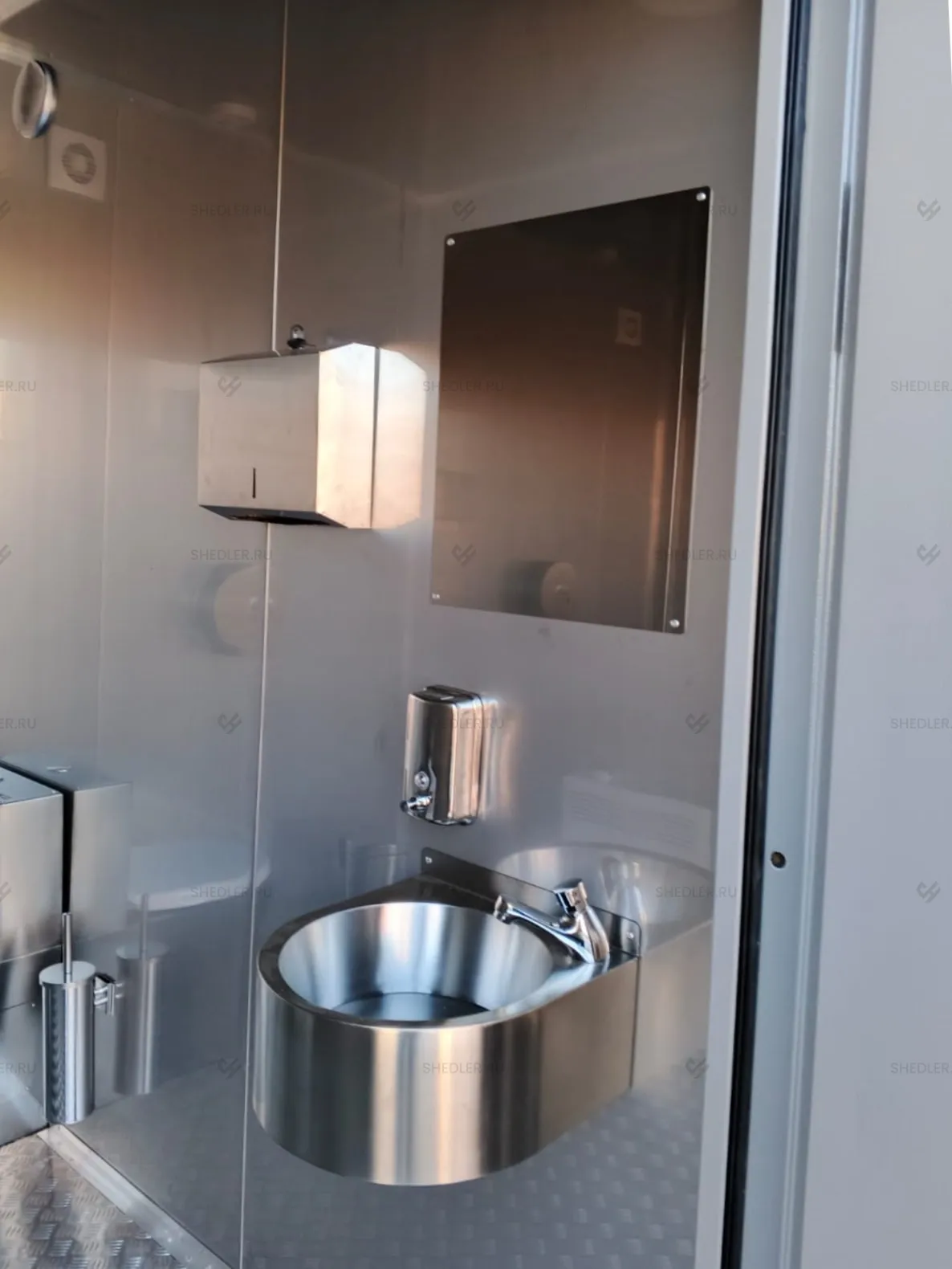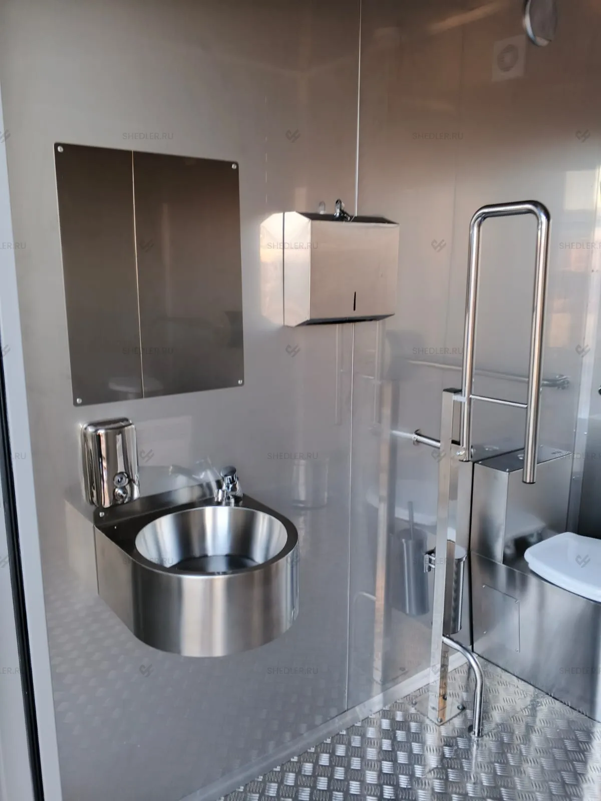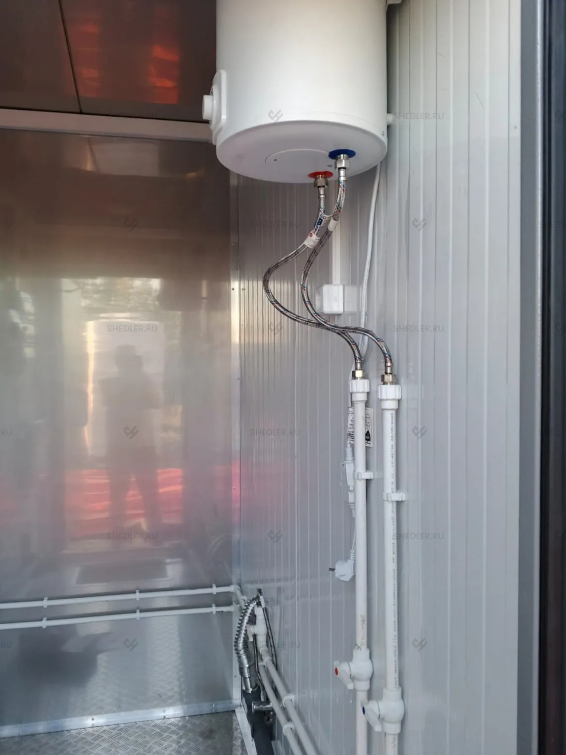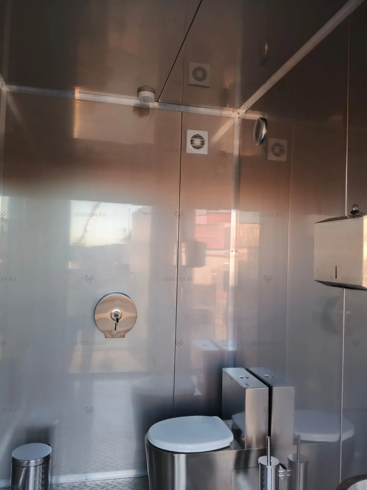 В каждом отделе стоит вытяжной вентилятор, унитаз, раковина. Подведена вся разводка для сантехники и электричества. В дополнении установлено все необходимое для комфортного использования туалета: сушилка, бойлер, зеркало, ведро.
