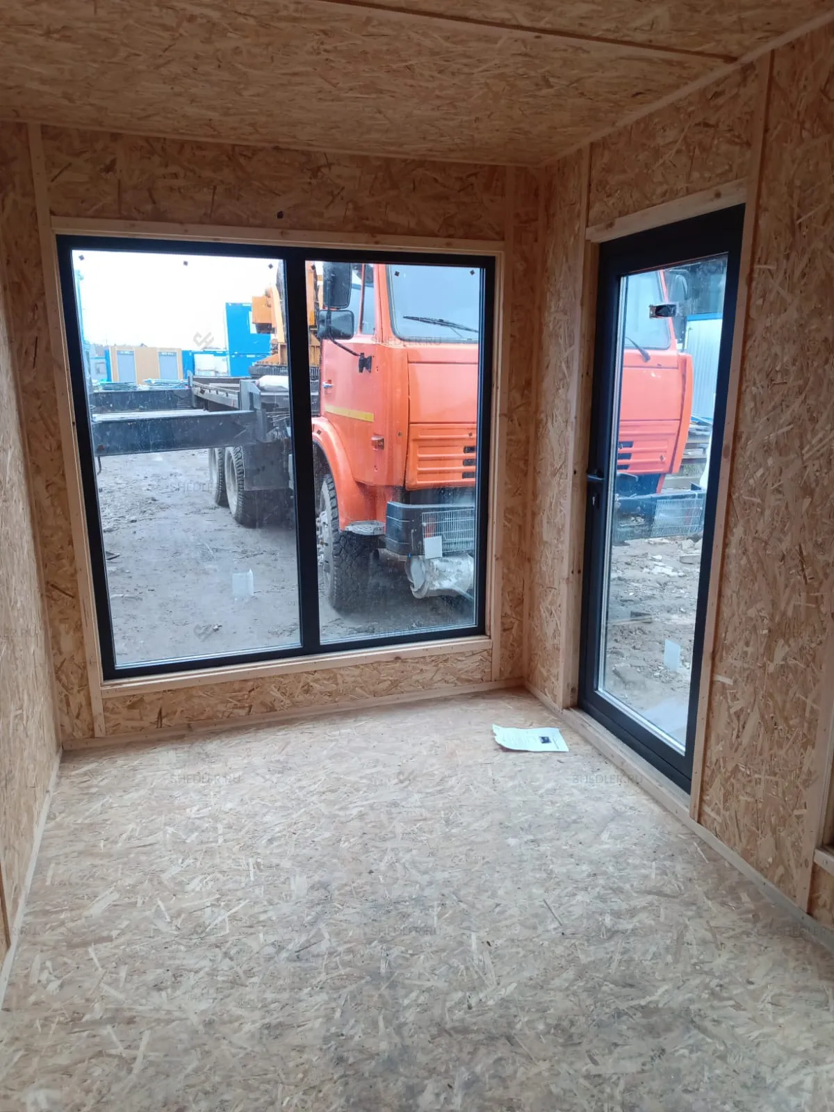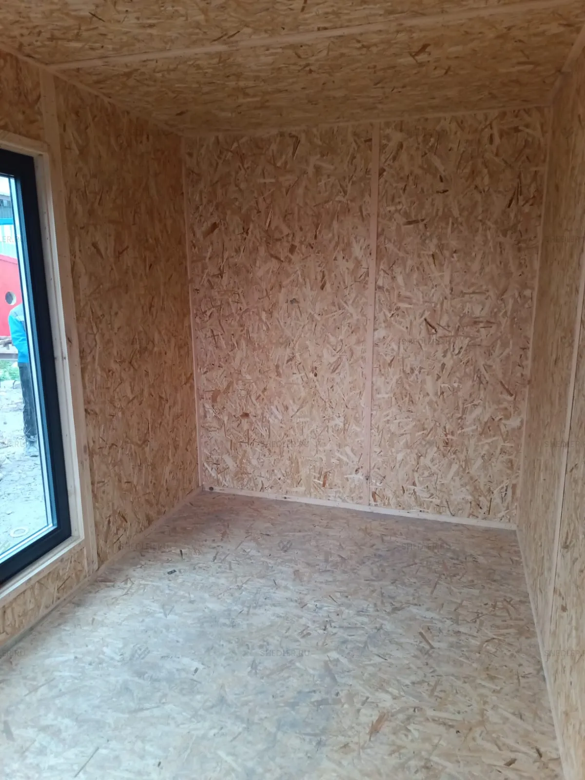 Для отделки интерьера использовались ориентированно-стружечные плиты – толщиной 9 мм для потолка и стен и 12 мм для пола. Они крепятся к внутренней обрешетке из деревянного бруса 100 х 40 мм естественной влажности. Конструкции из древесины имеют огнебиозащитную пропитку, они надежно защищены от поражения плесенью и грибком, риски возгораний также сведены к минимуму. В базовом исполнении быстровозводимого модуля не предусмотрена электропроводка и электрооборудование.