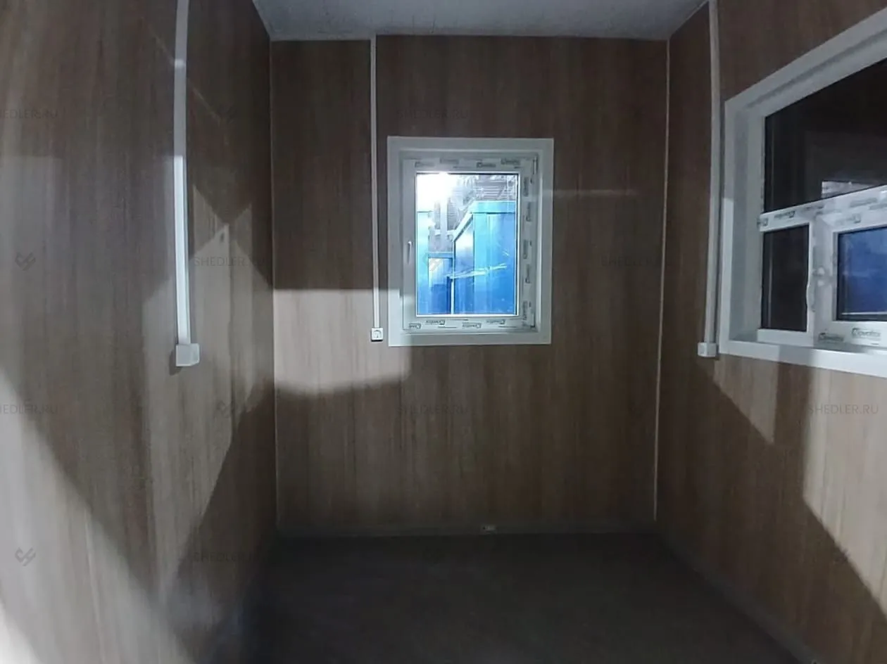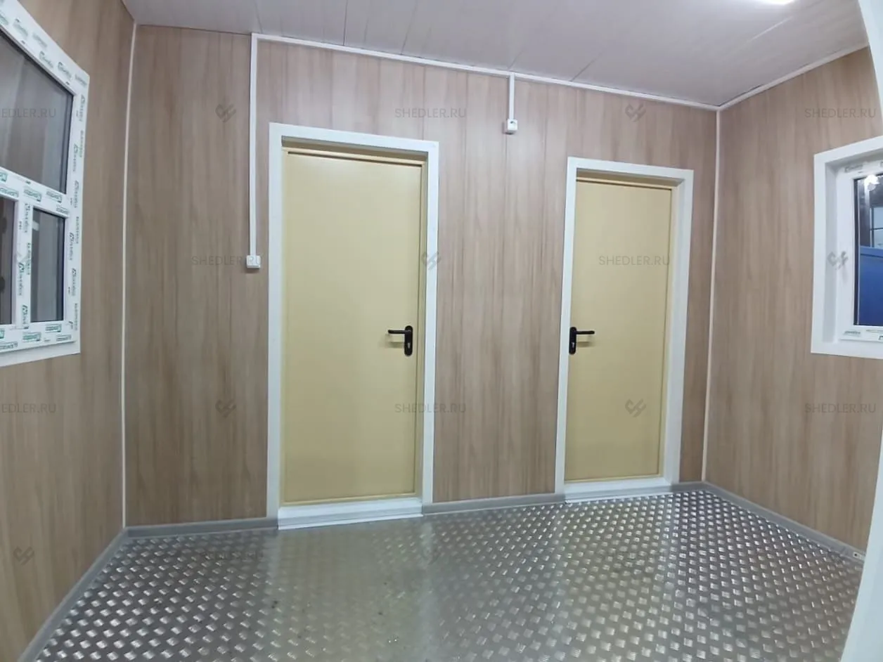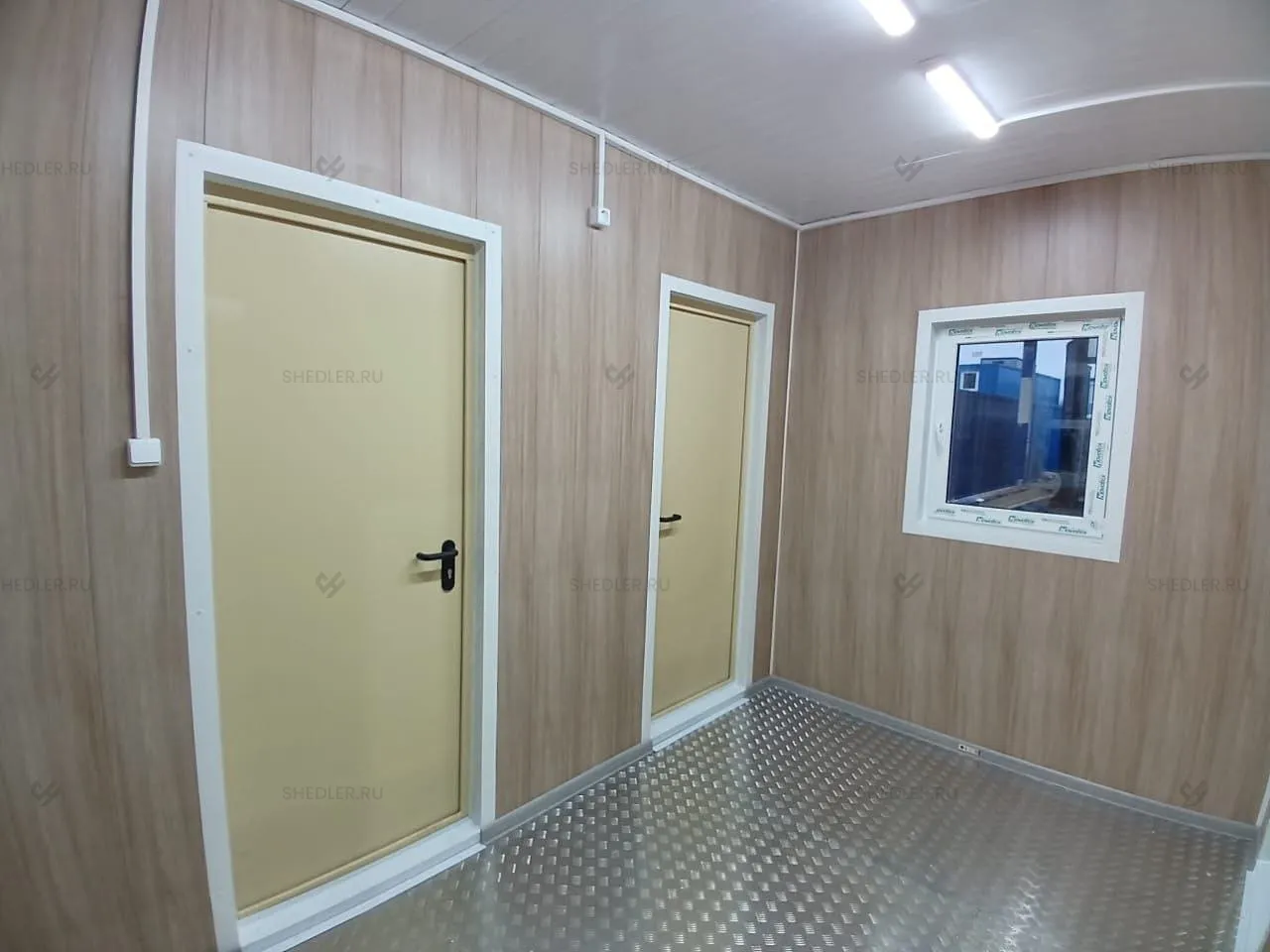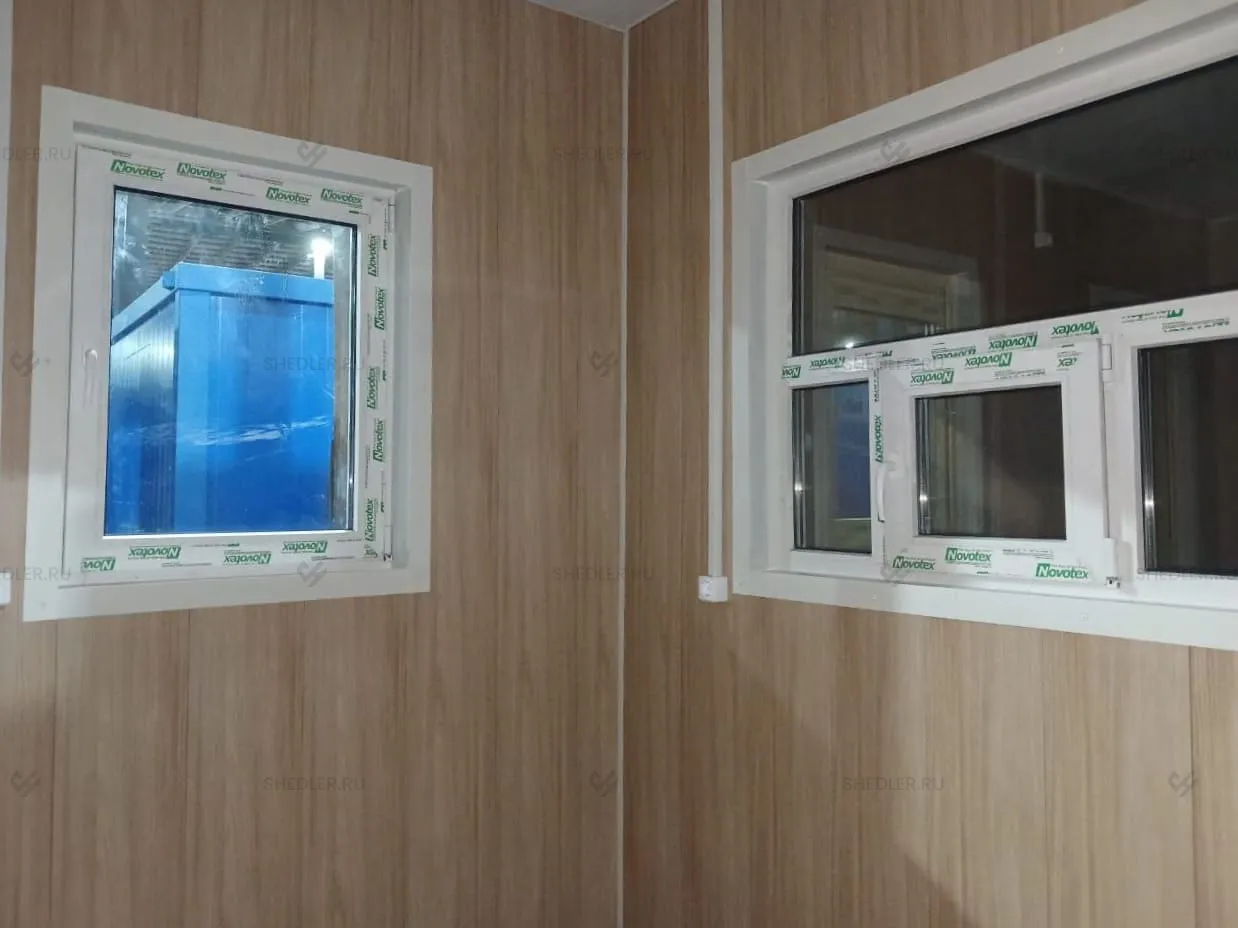 Благодаря утеплению пола и потолка минеральной ватой УРСА 100 мм с пароизоляцией Гидропроф Б блок-контейнер подходит для эксплуатации в суровых климатических условиях. Высокой энергоэффективности способствуют 5 утепленных металлических дверей на входе, взломостойкость которых гарантирована врезными замками и 3 ПВХ-окнами 0,8 х 1 м с поворотно-откидным открыванием. В конструкции есть еще пластиковое окно 1,2 х 1 м, но оно используется для контроля доступа (в центре имеется форточка для проверки документов).