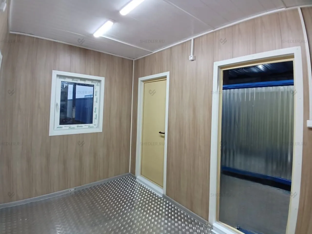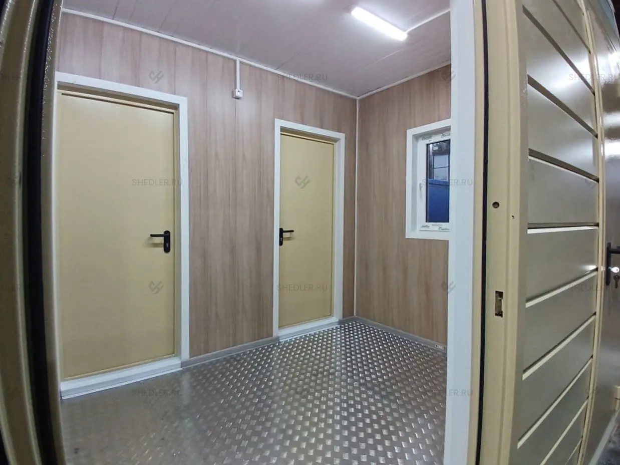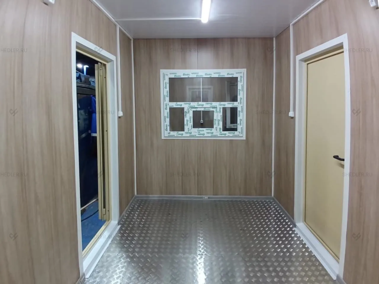 Благодаря утеплению пола и потолка минеральной ватой УРСА 100 мм с пароизоляцией Гидропроф Б блок-контейнер подходит для эксплуатации в суровых климатических условиях. Высокой энергоэффективности способствуют 5 утепленных металлических дверей на входе, взломостойкость которых гарантирована врезными замками и 3 ПВХ-окнами 0,8 х 1 м с поворотно-откидным открыванием. В конструкции есть еще пластиковое окно 1,2 х 1 м, но оно используется для контроля доступа (в центре имеется форточка для проверки документов).