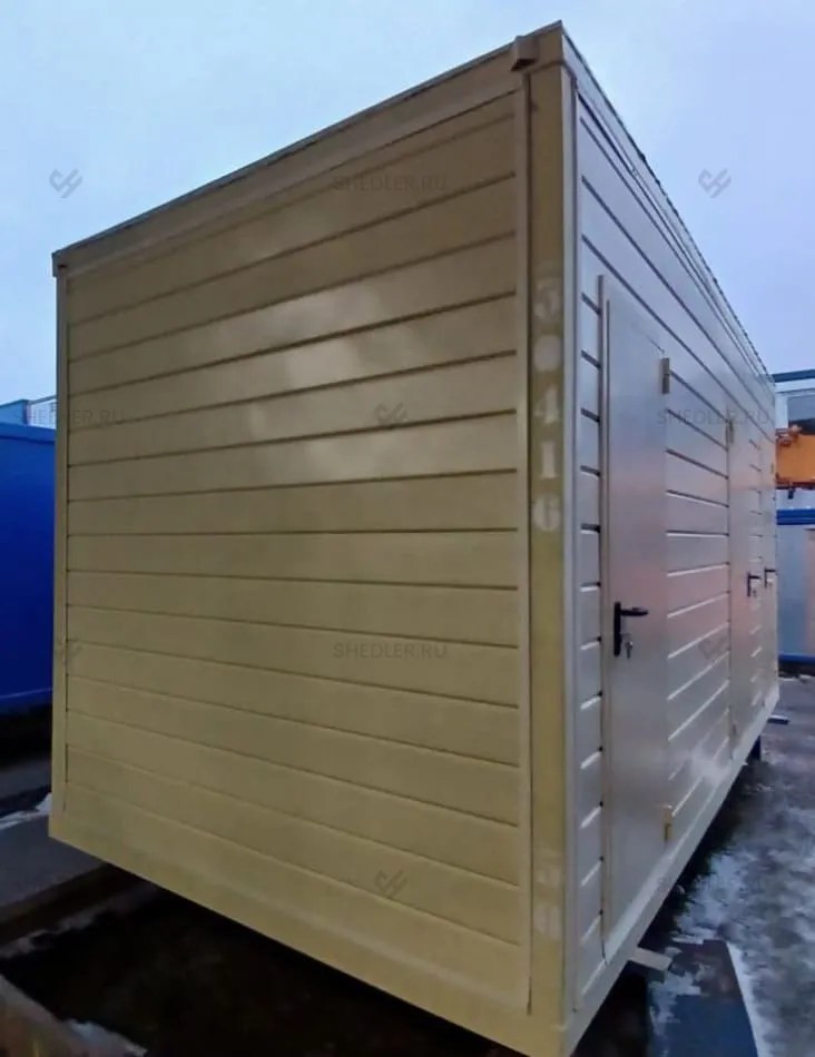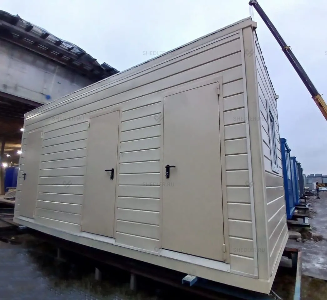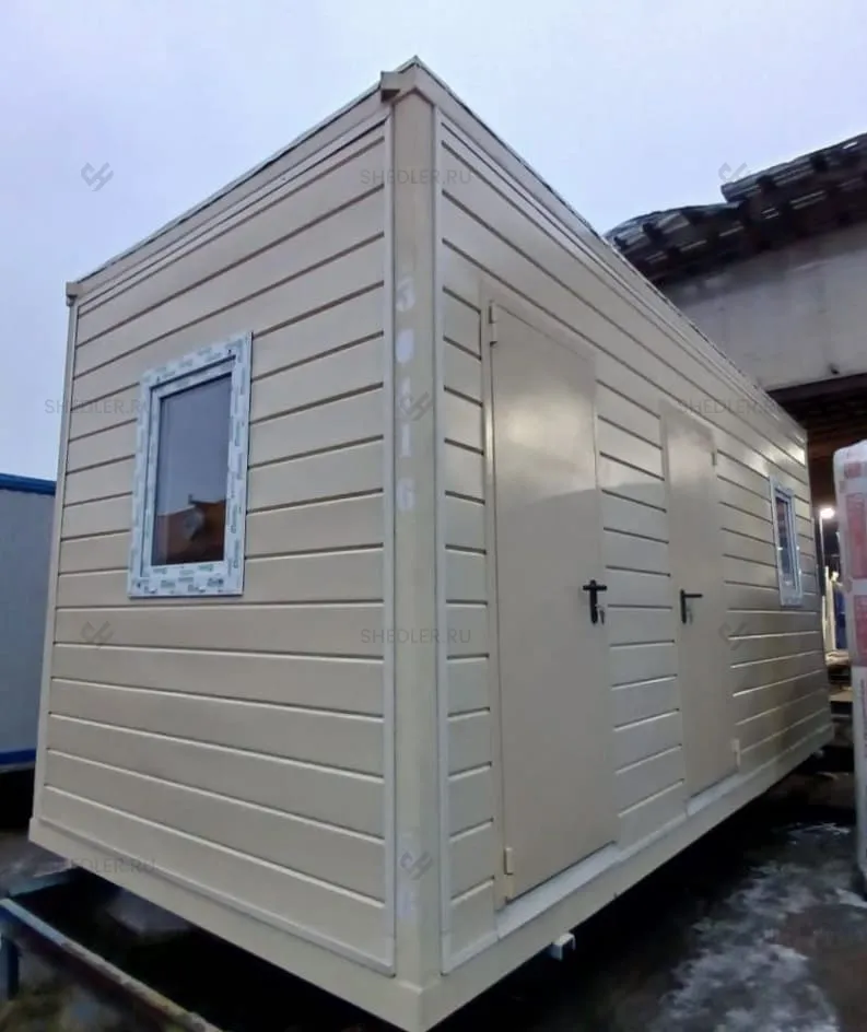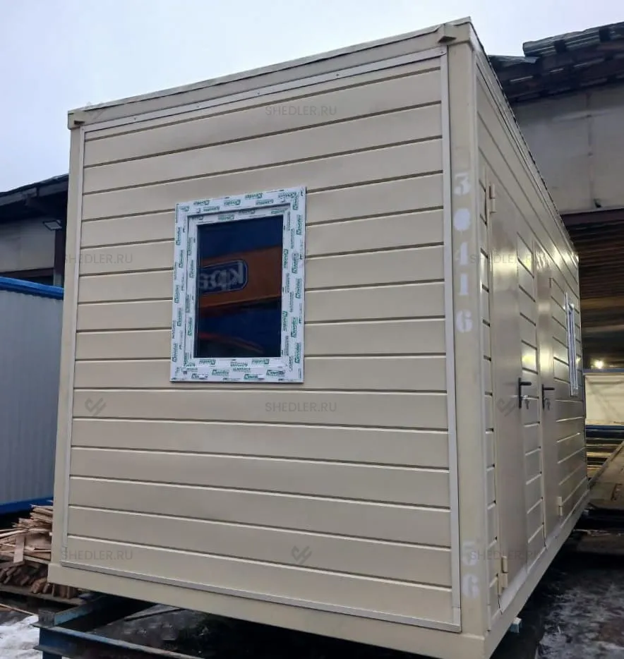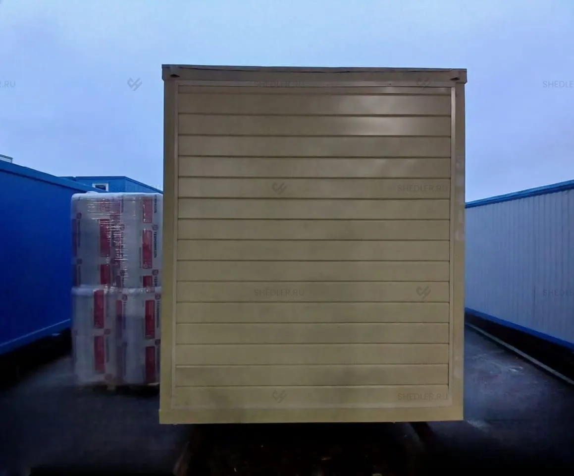С нижней части установлено из оцинкованного профлиста C8, гальваническое покрытие надежно защищает его от коррозии при контакте с влагой. Огораживающими элементами выступает плоская кровля из стального листа 0,7 мм с порошковым покрытием RAL1014 и фасад такого же цвета из ориентированно-стружечной плиты 9 мм, покрытой металлосайдингом. Идеально ровную поверхность сайдинга обеспечивает стартовая и финишная планка. Завершенному экстерьеру объекта способствуют оконные и дверные доборы.