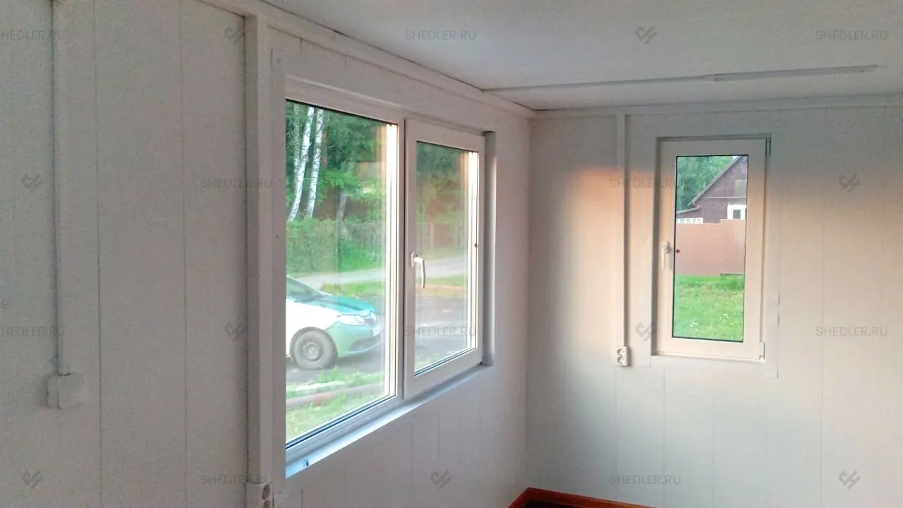 Модульное здание имеет несколько зон, разделенных перегородками из МДФ панелей. Также установлены межкомнатные двери и выделено помещение для санузла. В дачном домике имеется одно большое двухстворчатое ПВХ окно размером 180 х 120 см с поворотно-откидным механизмом. А также еще 5 окон разных размеров – 80 на 100 см, 60 на 120 см, 50 на 50 см с поворотно-откидным механизмом.