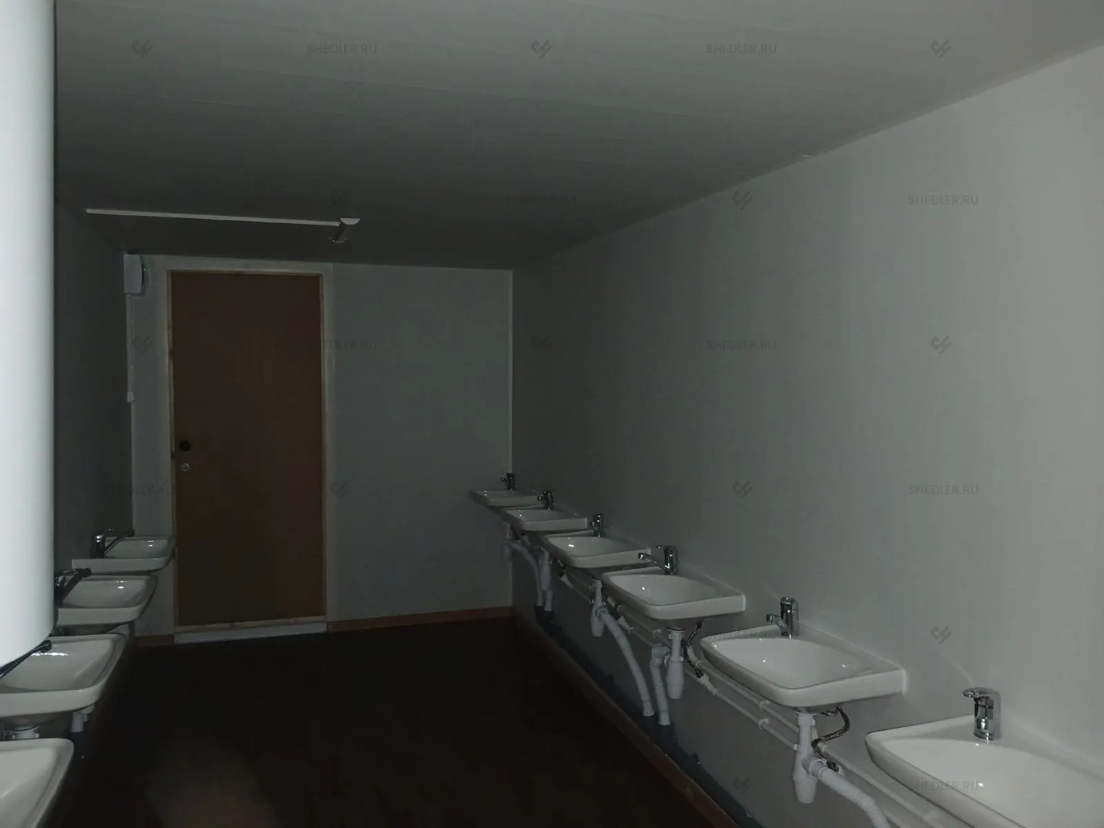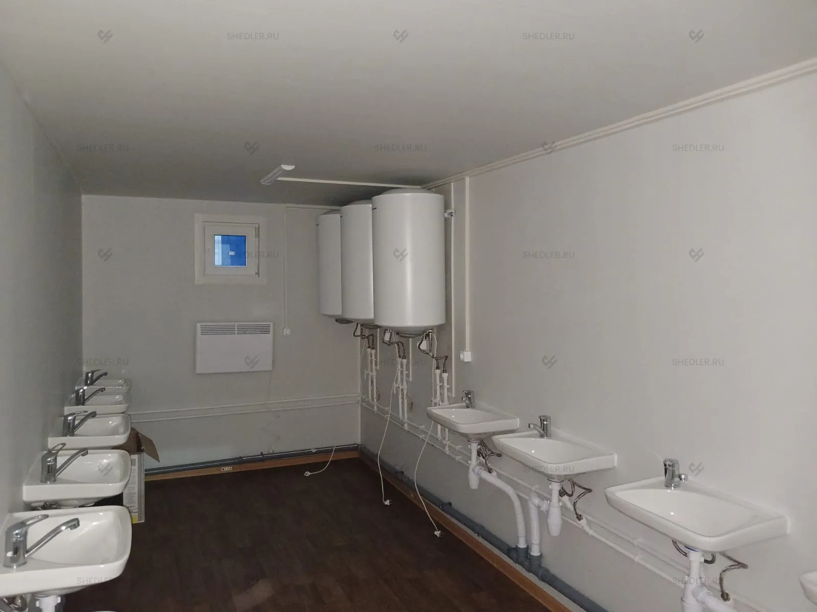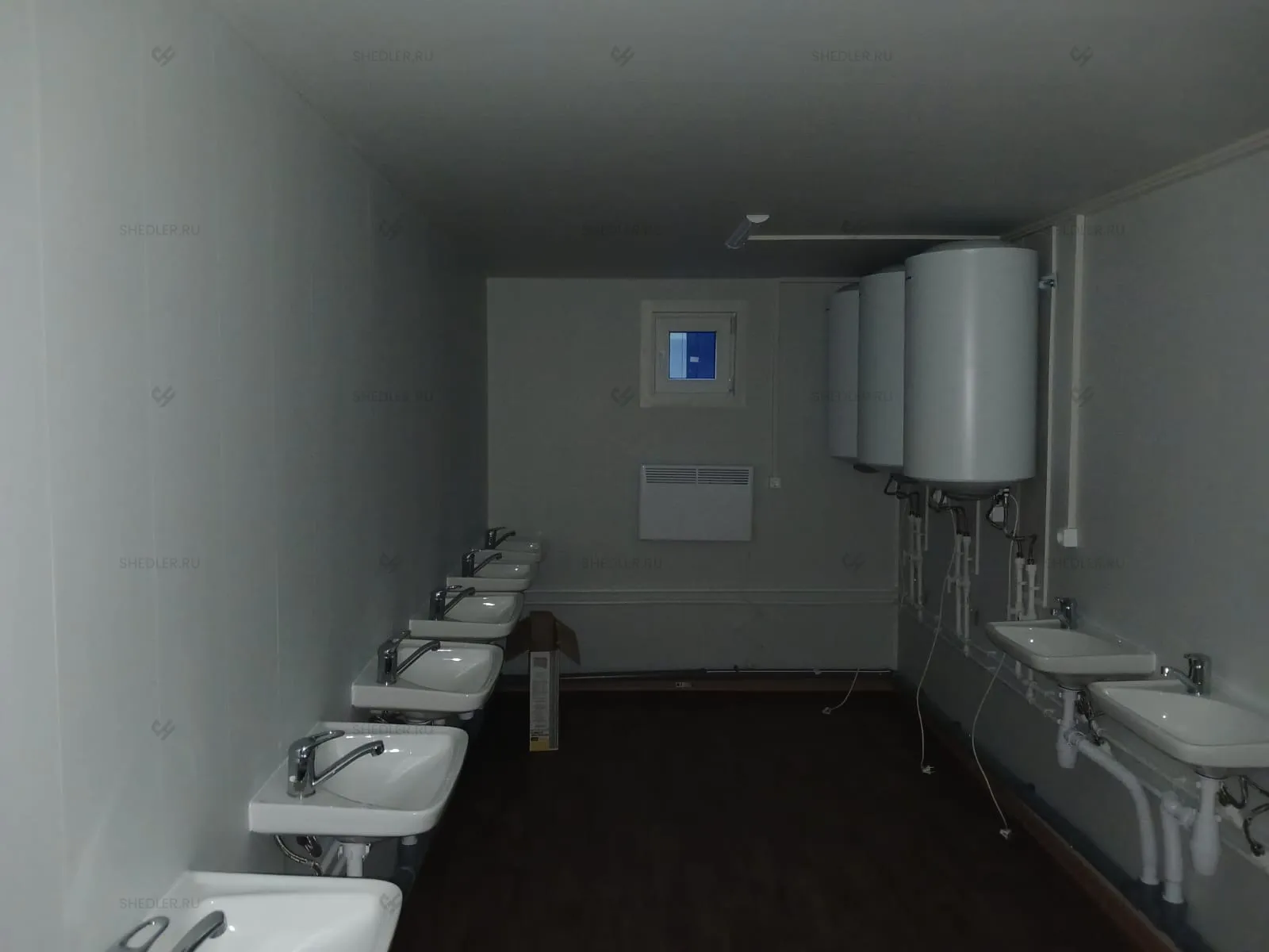 Отличаются модули наполнением: в одном установлено 4 раковины-тюльпан со смесителем, душевой поддон 800 х 800 мм со шторкой и бойлер на 150 л, а в другом – чаша Генуя, 4 умывальника со смесителями.