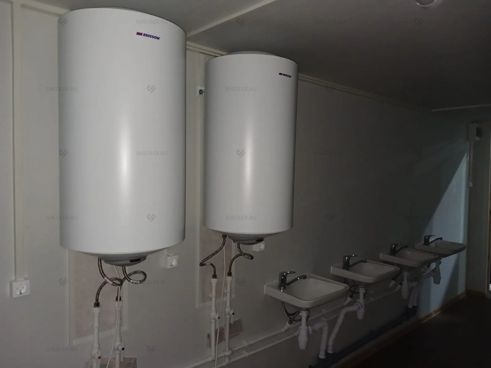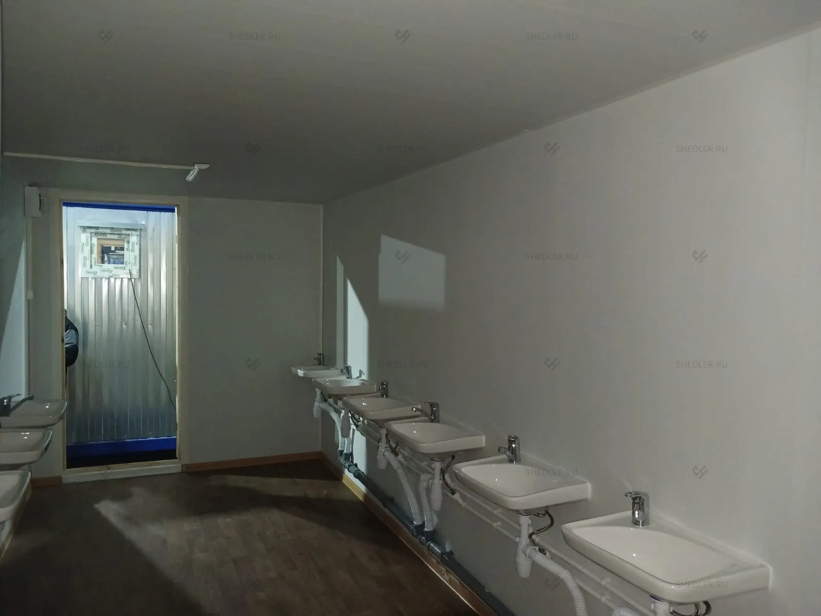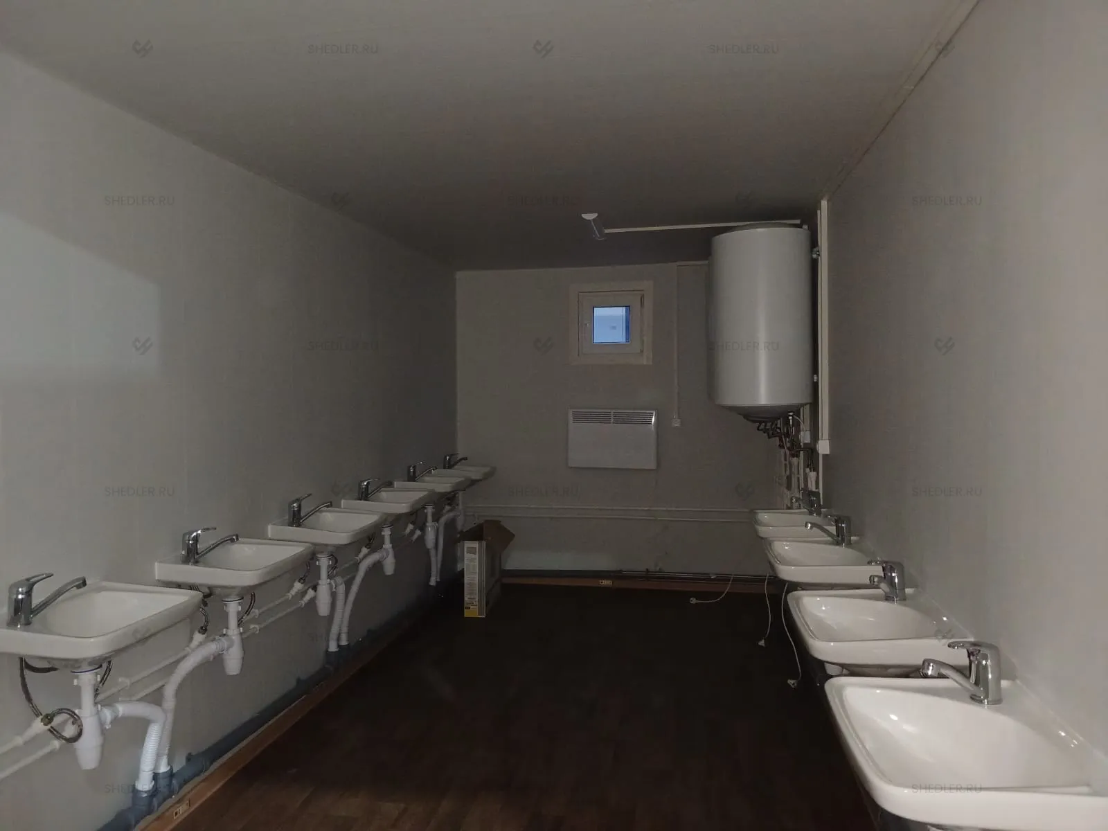 Отличаются модули наполнением: в одном установлено 4 раковины-тюльпан со смесителем, душевой поддон 800 х 800 мм со шторкой и бойлер на 150 л, а в другом – чаша Генуя, 4 умывальника со смесителями.