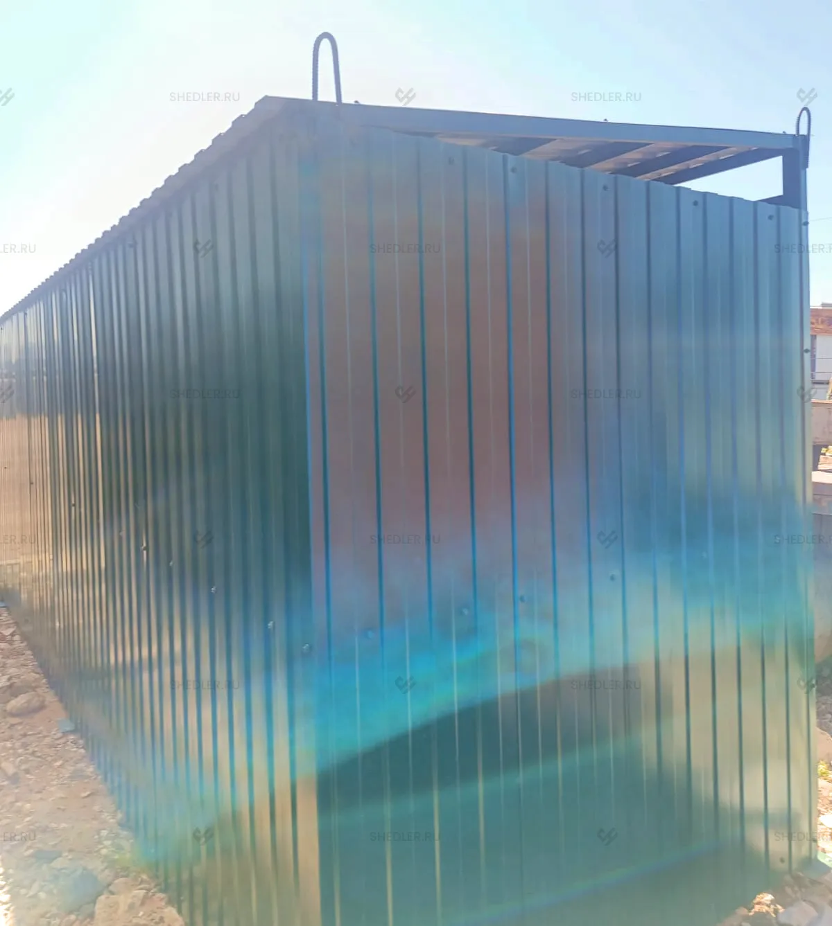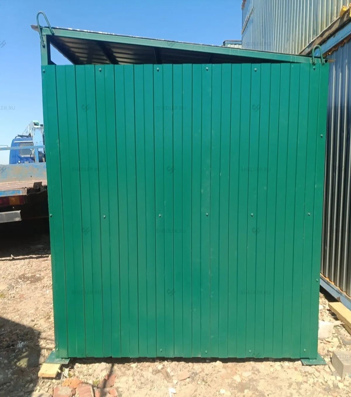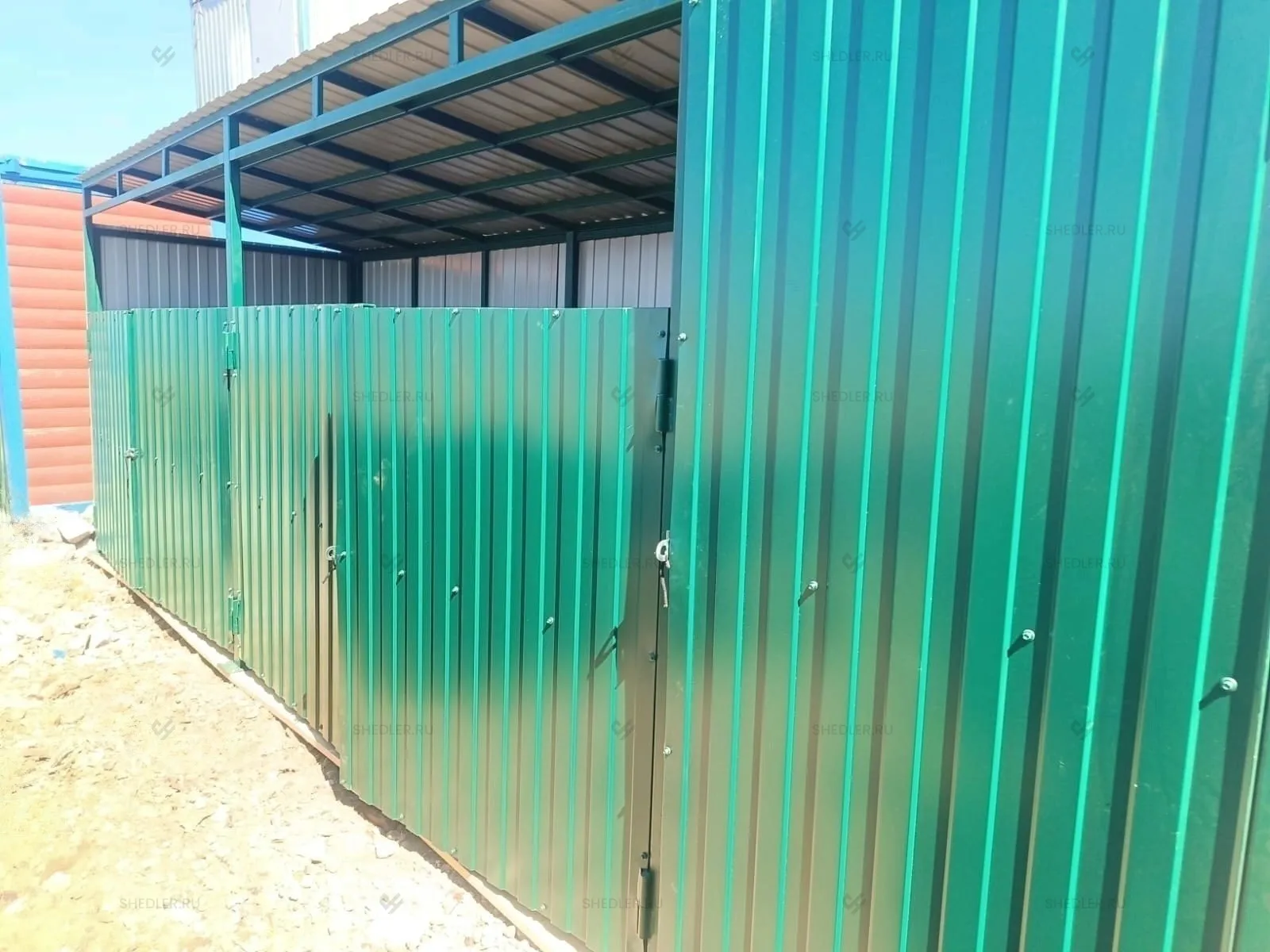 Заказ на изготовление контейнерной площадки SHEDLER для 3 мусорных контейнеров. В рамках проекта требовалось создать две площадки на 3 контейнера каждая (размером 6,0×1,7×2,2 м) и одну площадку на 4 контейнера (7,0×1,7×2,0 м). Обе конструкции изготовлены из профлиста с каркасом из металлической профтрубы, окрашенной в цвет RAL 6005, и оснащены воротами с фиксаторами, петлями под навесные замки, а также оголовками для крепления к фундаменту.