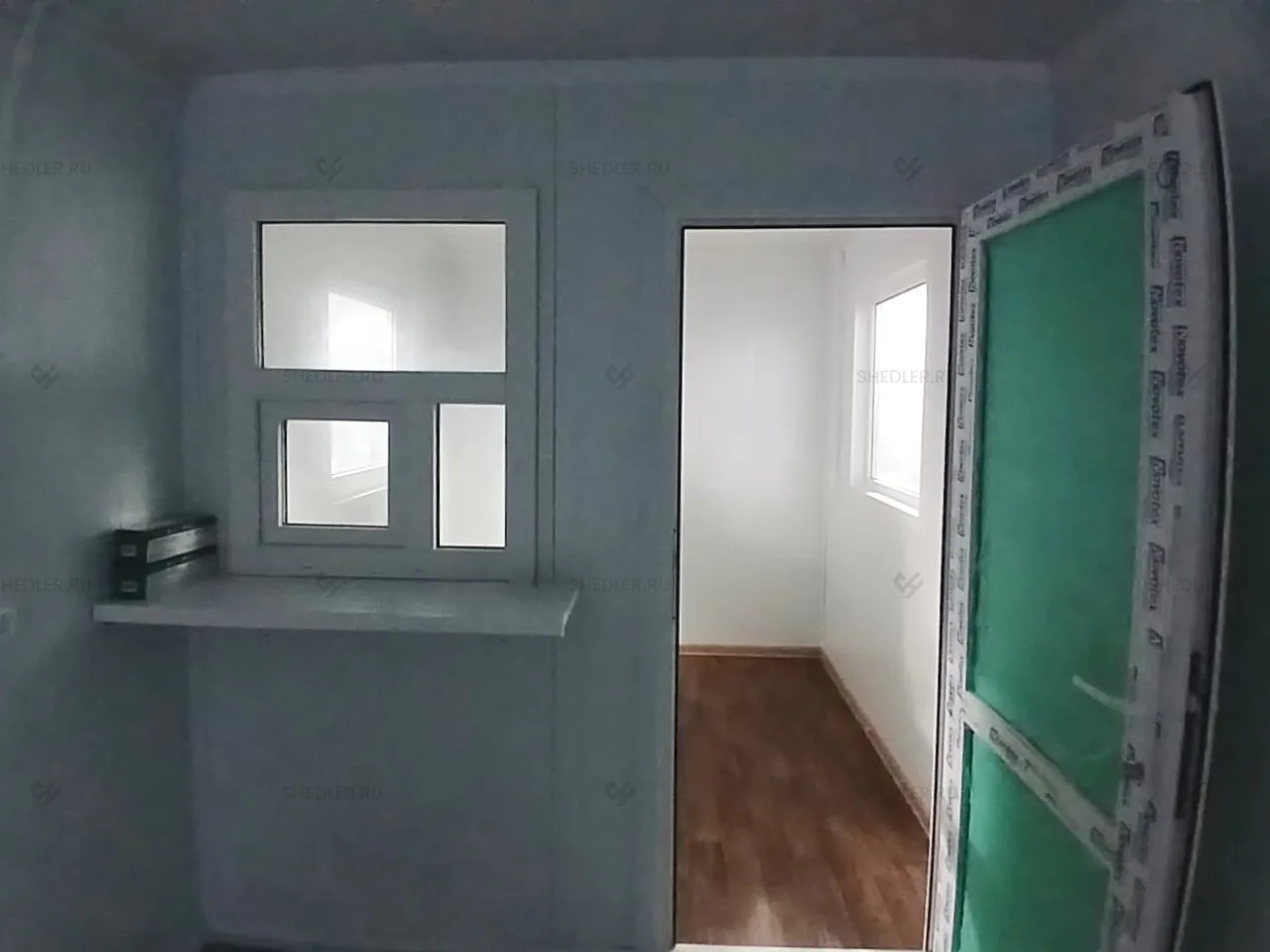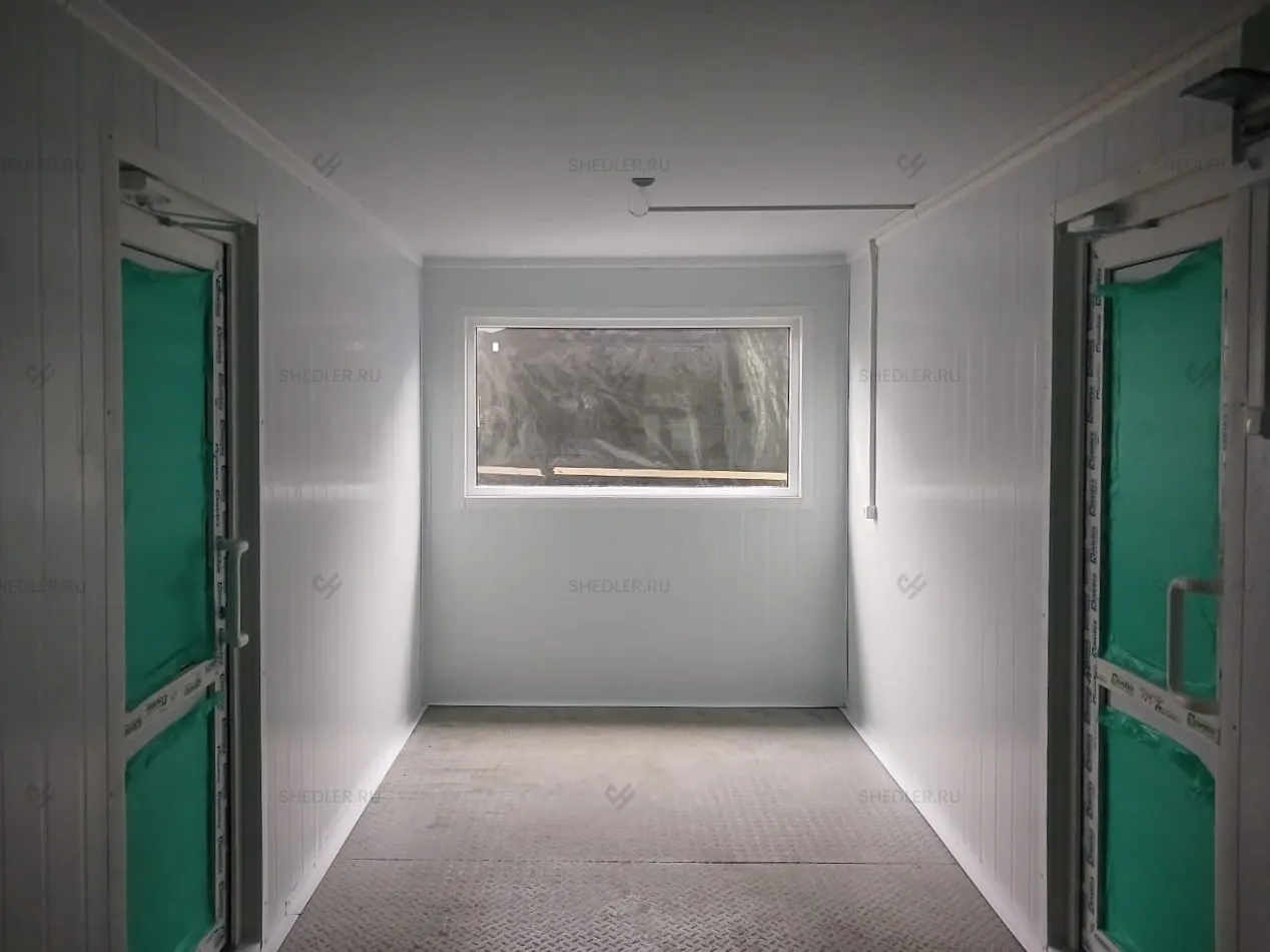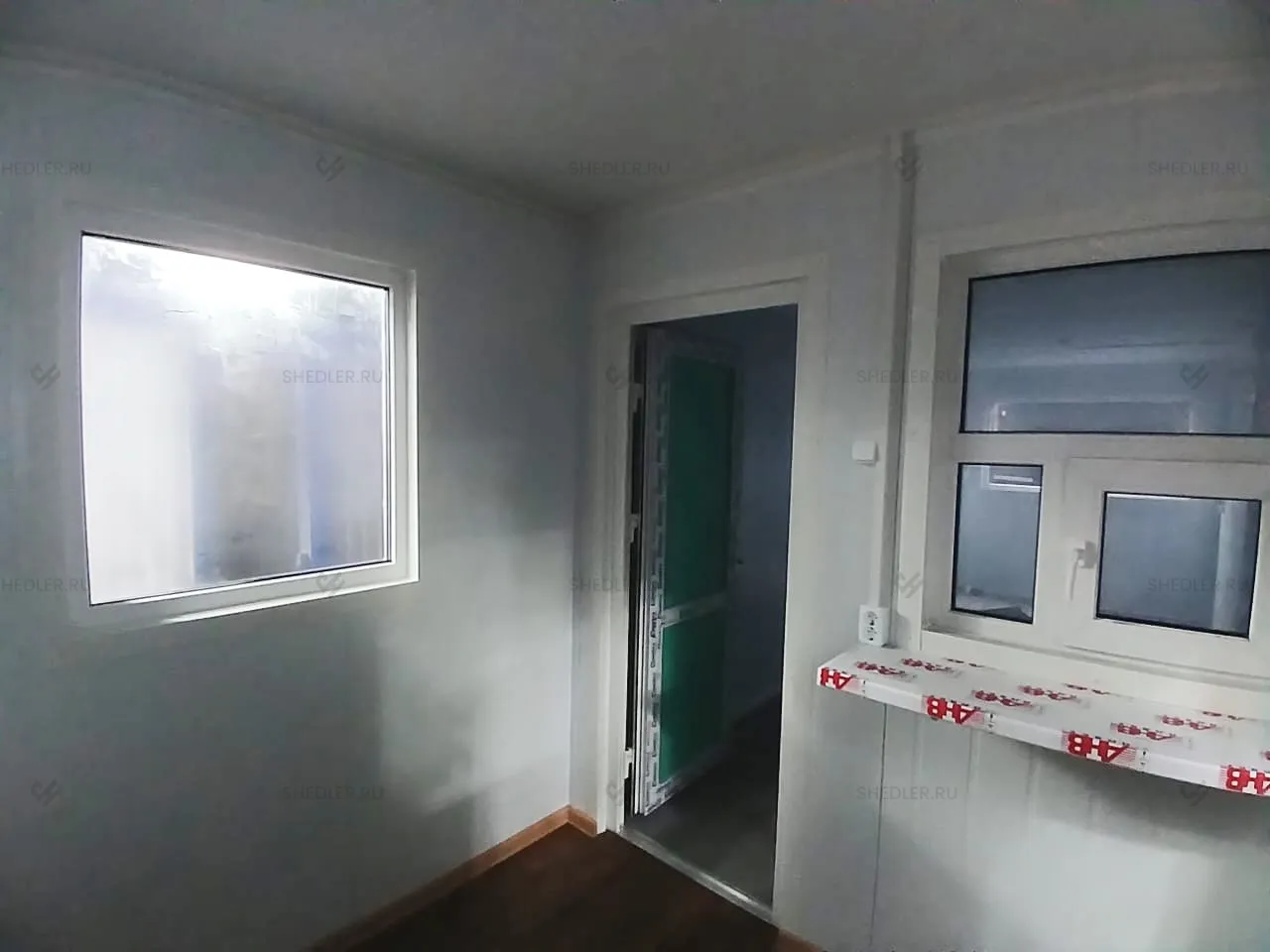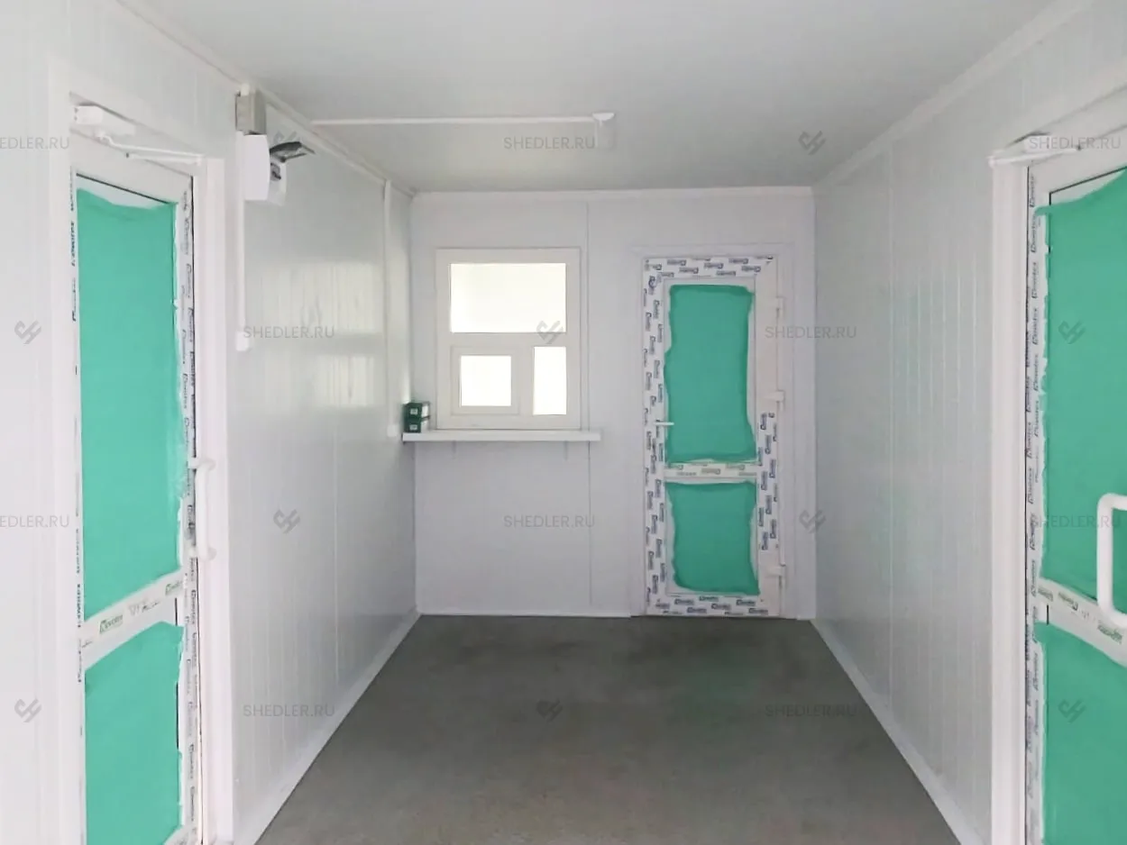 В конструкции предусмотрены входная и межкомнатная дверь, обе сделаны из сэндвич-панелей. Согласно проекту в модульной проходной установлены 3 окна окна – 1 глухое 0,8 х 1 м, 2 окна аналогичного размера с форточкой и подоконником и 1 глухое окно 1,8 х 1 м.