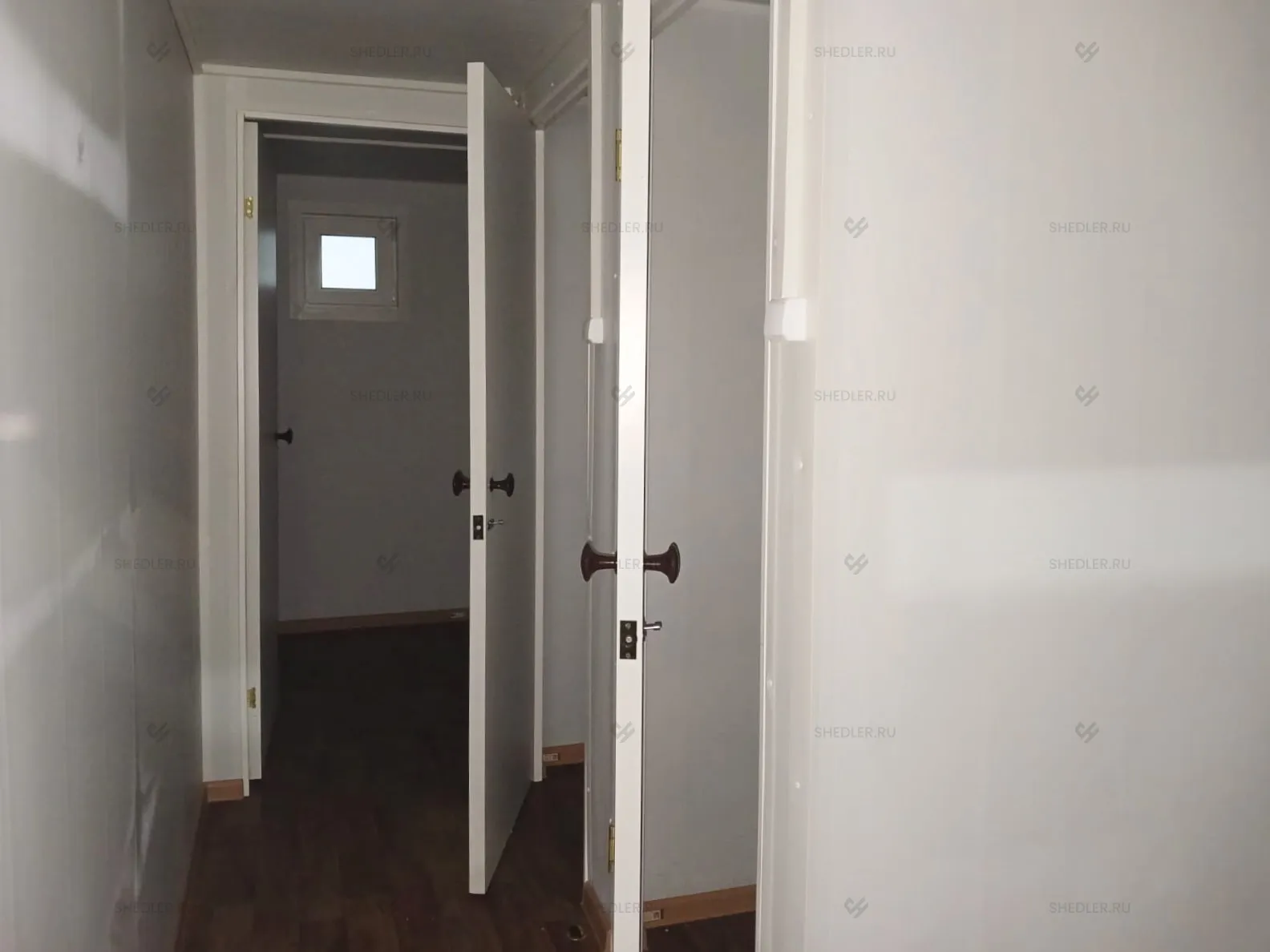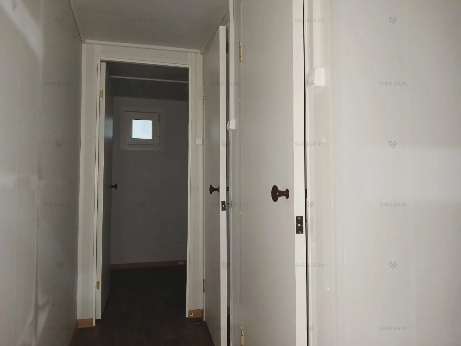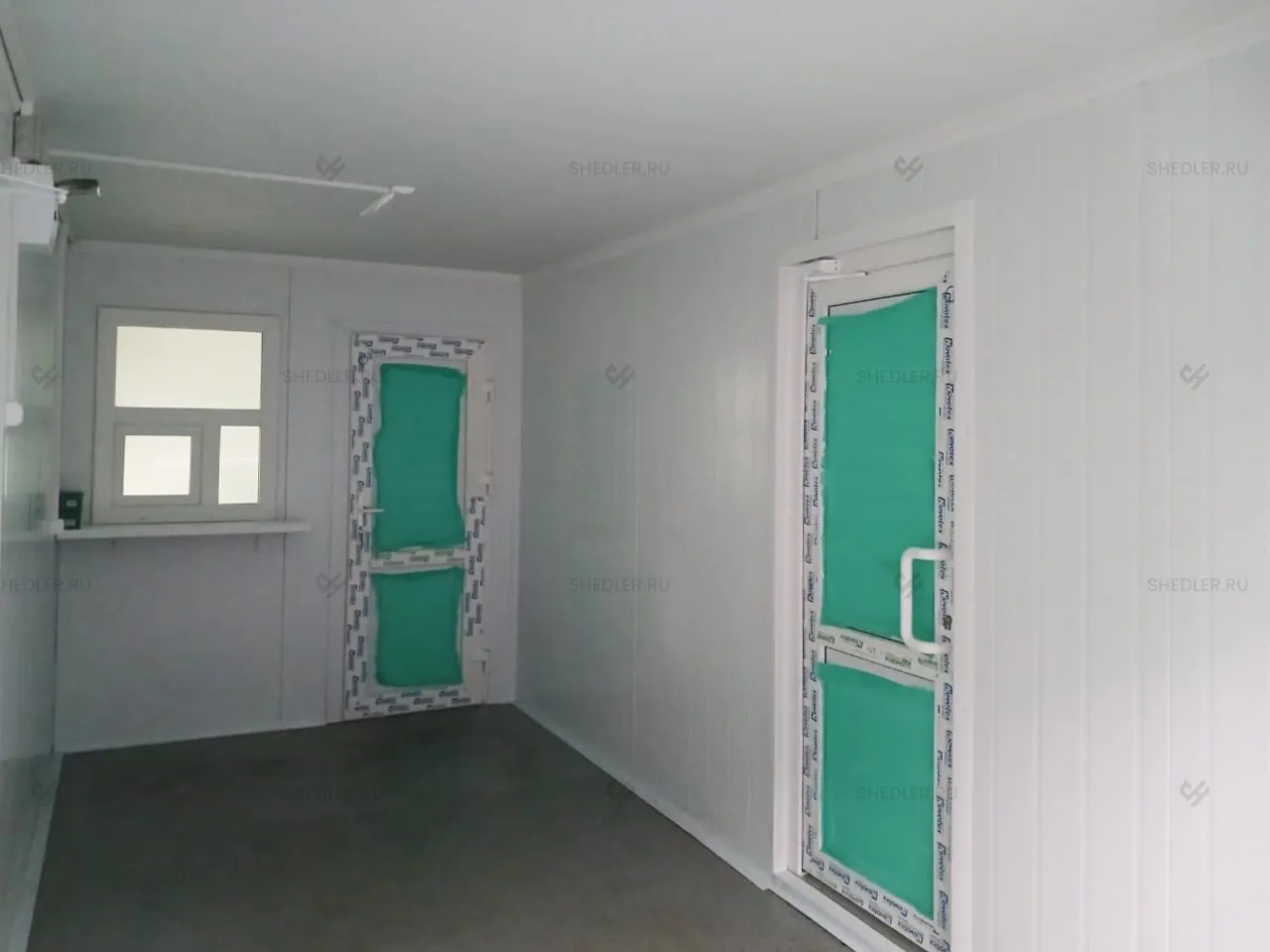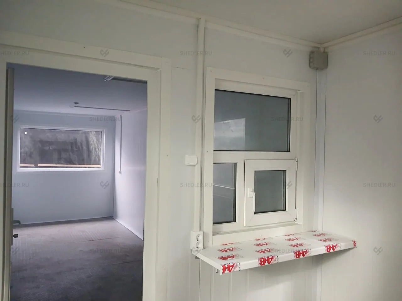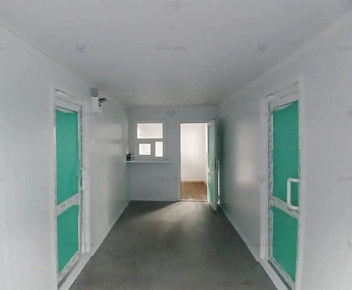 В конструкции предусмотрены входная и межкомнатная дверь, обе сделаны из сэндвич-панелей. Согласно проекту в модульной проходной установлены 3 окна окна – 1 глухое 0,8 х 1 м, 2 окна аналогичного размера с форточкой и подоконником и 1 глухое окно 1,8 х 1 м.