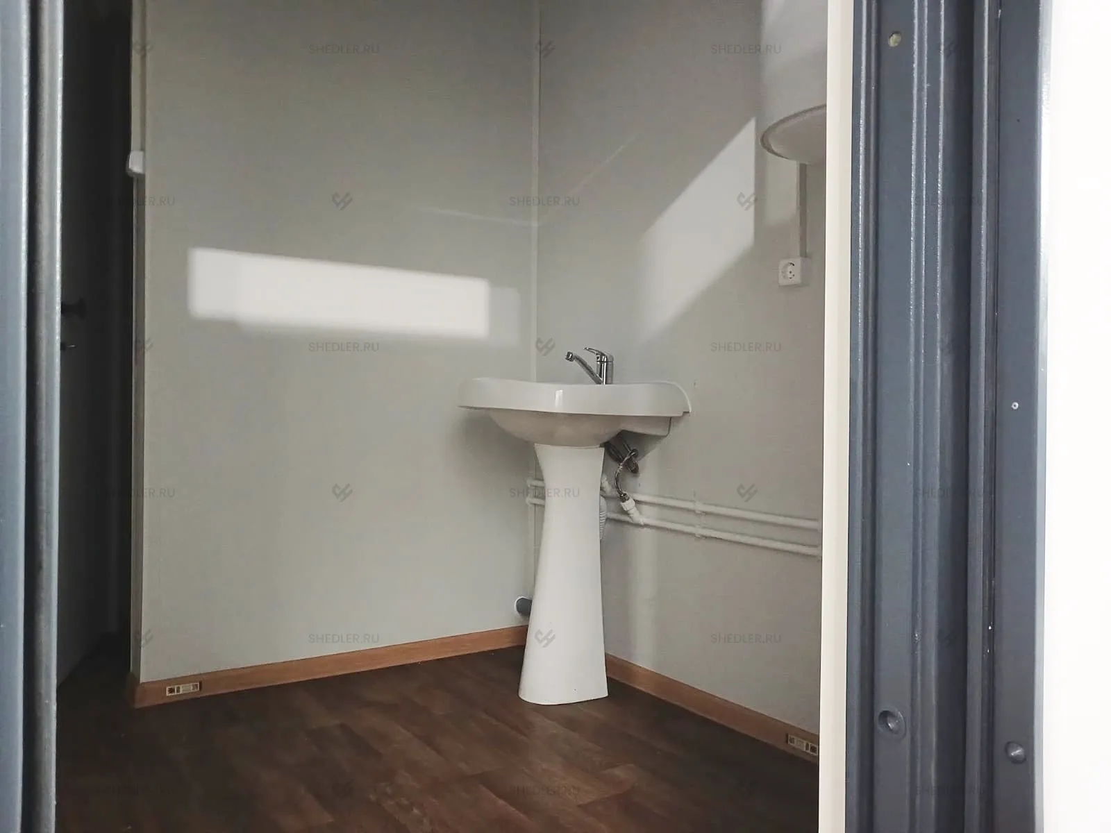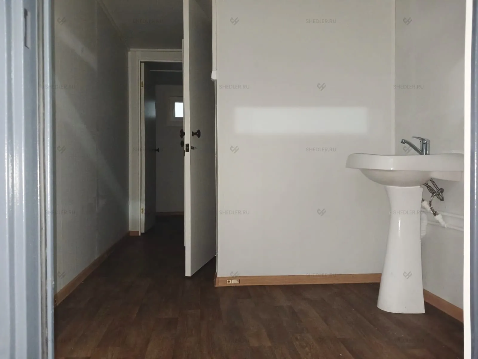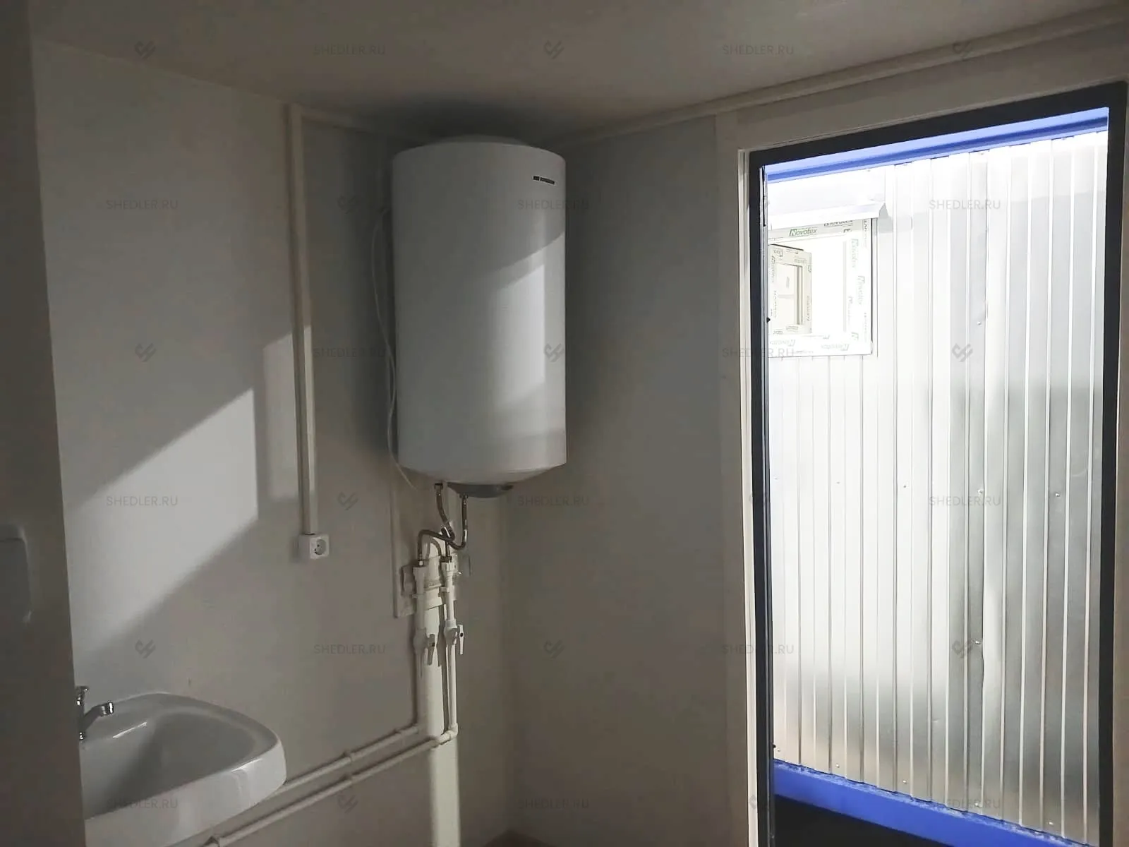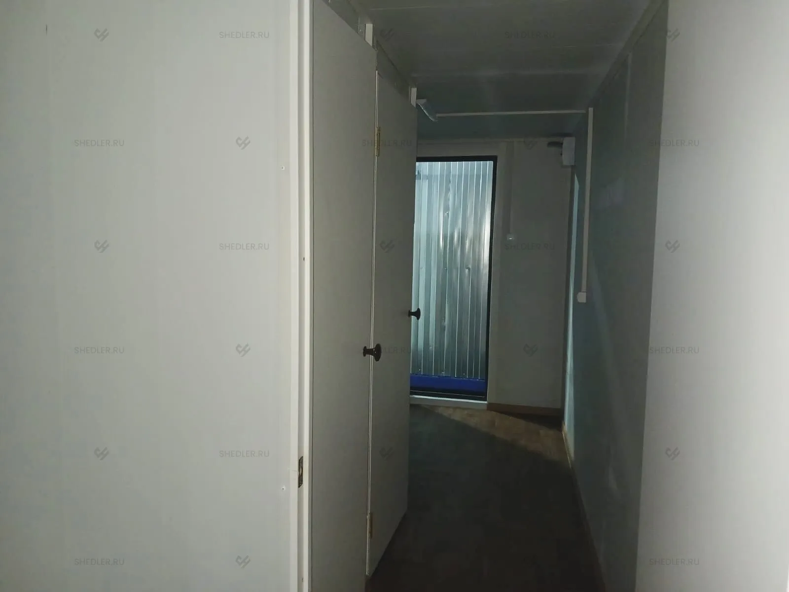 В конструкции предусмотрены входная и межкомнатная дверь, обе сделаны из сэндвич-панелей. Согласно проекту в модульной проходной установлены 3 окна окна – 1 глухое 0,8 х 1 м, 2 окна аналогичного размера с форточкой и подоконником и 1 глухое окно 1,8 х 1 м.