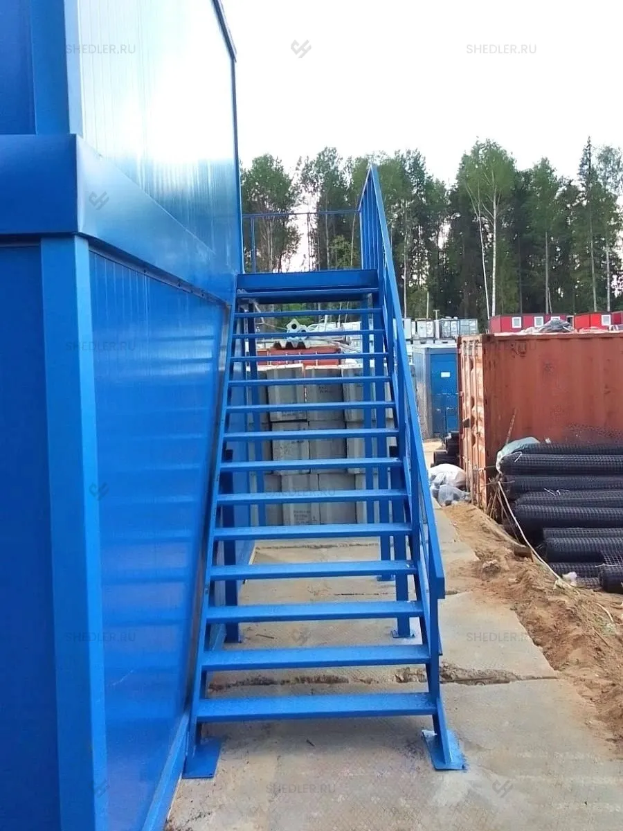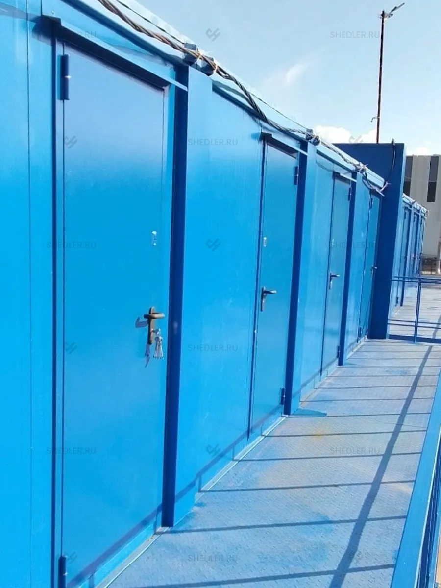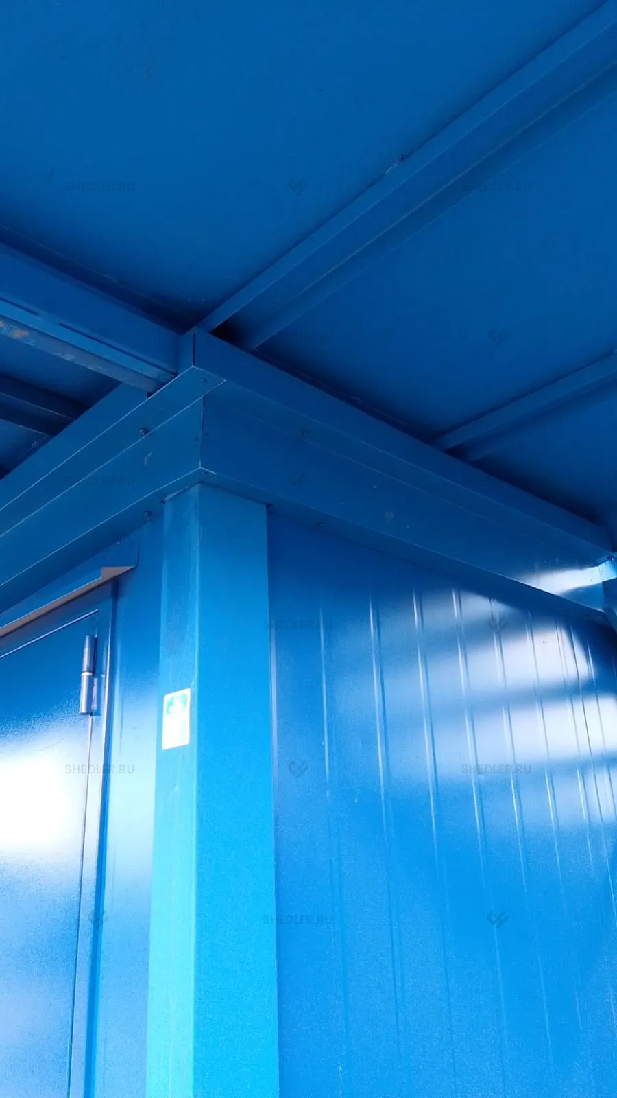 Каркас быстровозводимого здания выполнен из металла – швеллера 125 мм и уголка 140 х 100 мм. Стены обшиты сэндвич-панелями с окраской в синий цвет. Дно конструкции сделано из оцинкованного профлиста С8, способного выдержать большие нагрузки. Также дно усилено обрешеткой из бруса, ОСБ плитой 18 мм.