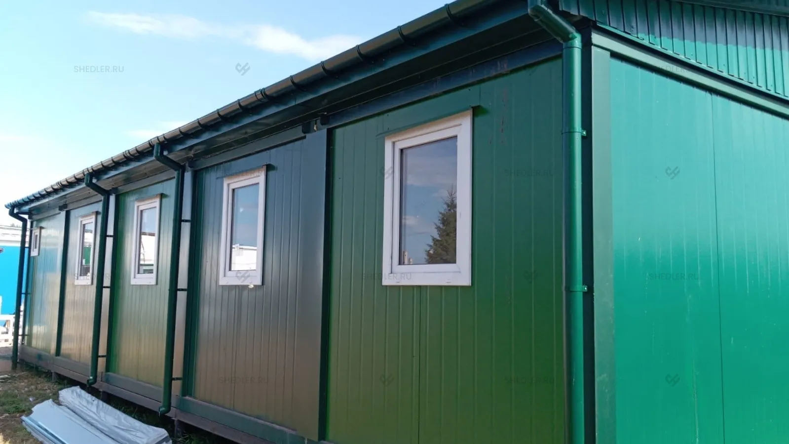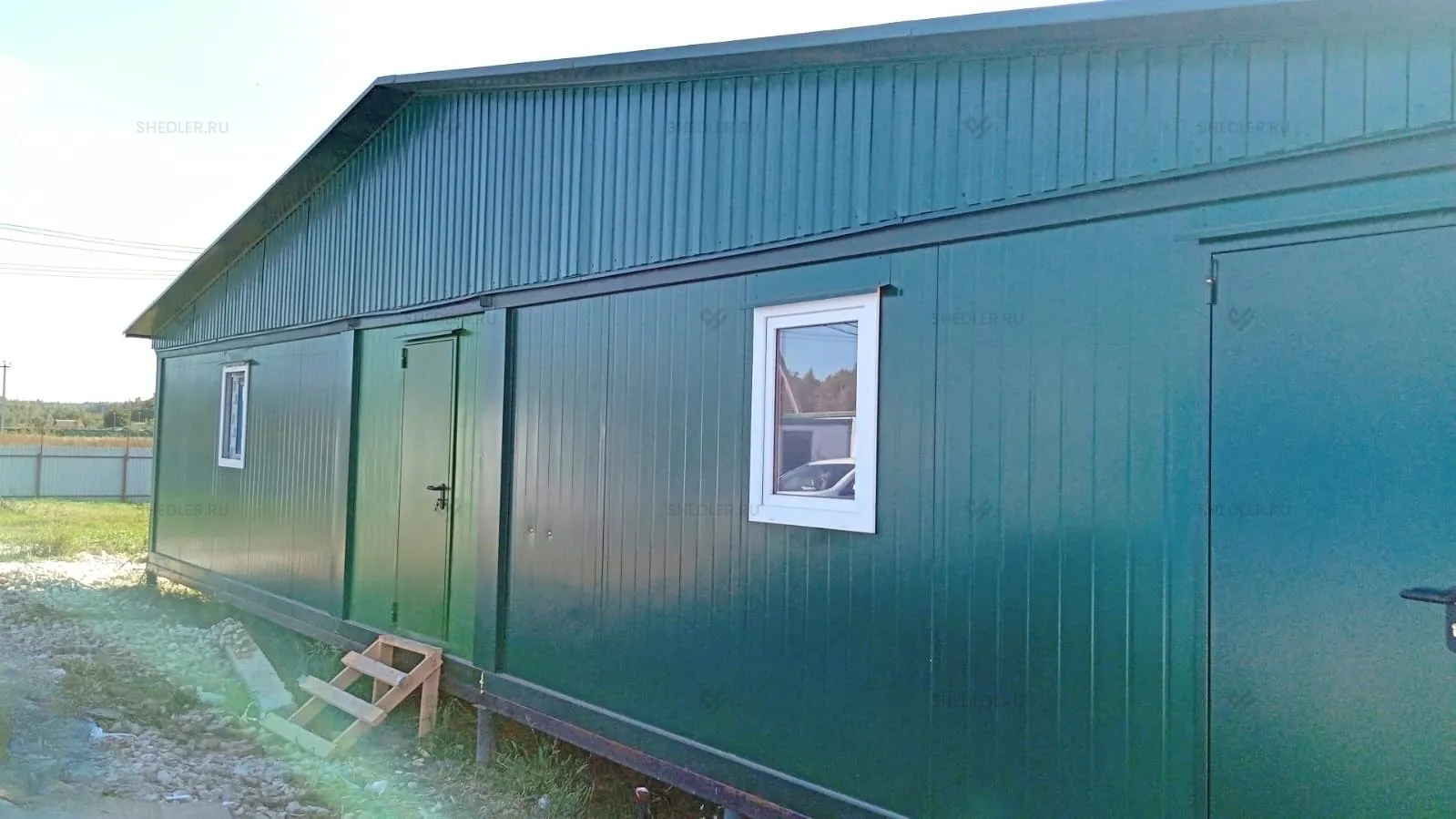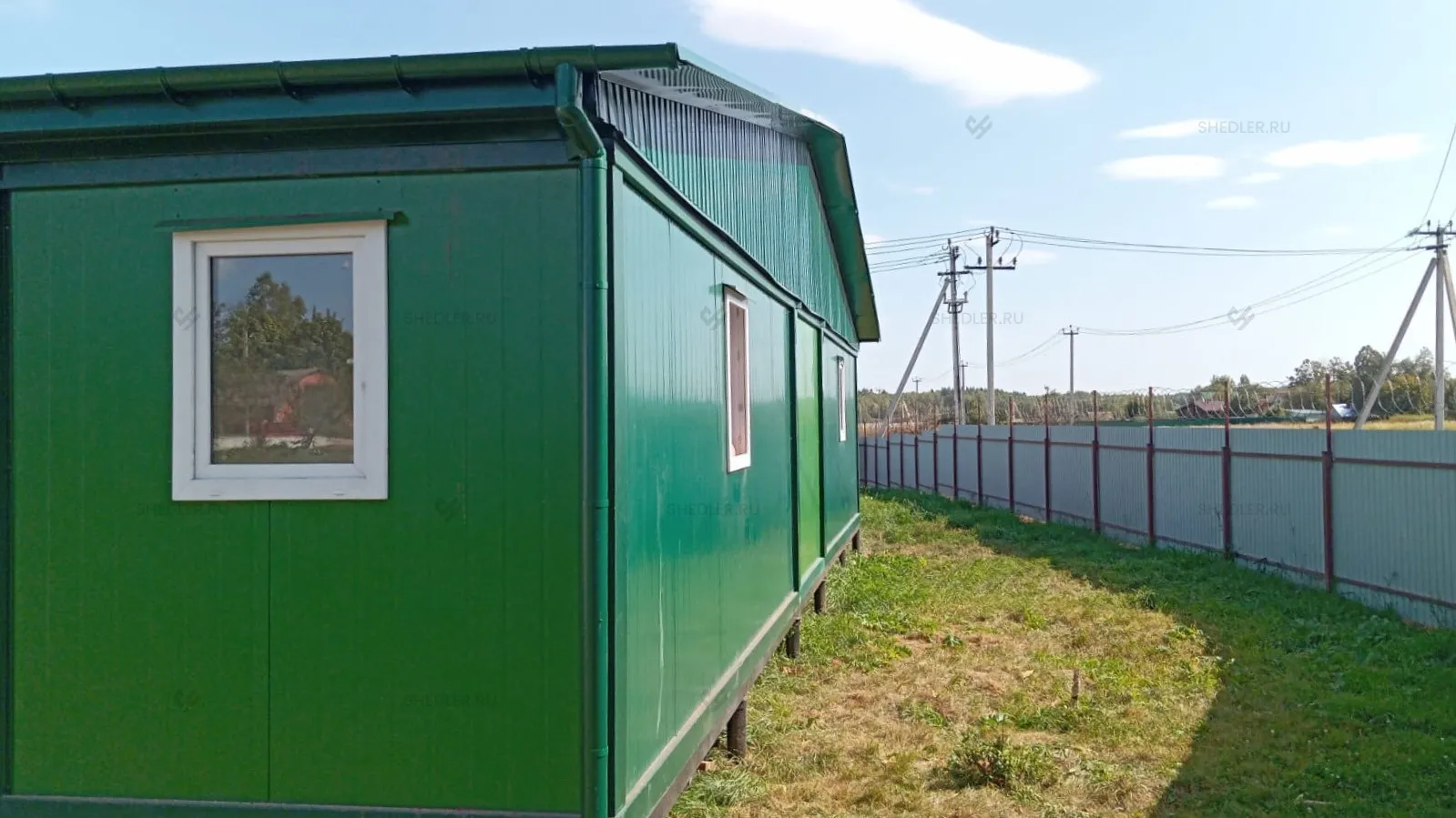 Наружная отделка выполнена из сэндвич-панелей Rockwool 100 мм в зеленом цвете. Внутренняя обрешётка выполнена из бруса 100 х 40 мм с обработкой ОБЗ, которая надежно защищает дерево от возгорания, а также заражения различными микроорганизмами. Выполнена тепло- звукоизоляция пола и потолка материалом УРСА 100 мм, что позволяет использовать здание даже в суровых климатических условиях. Также была выполнена пароизоляция материалом Гидропроф Б. Пол выполнен из ОСБ толщиной 18 мм.