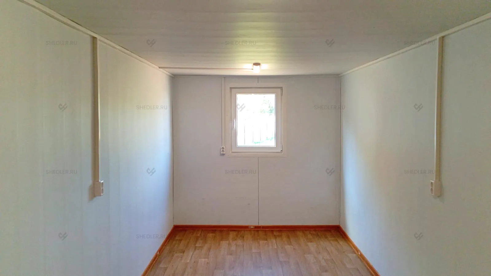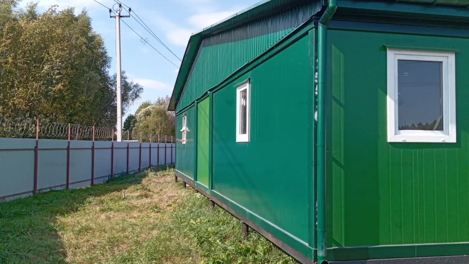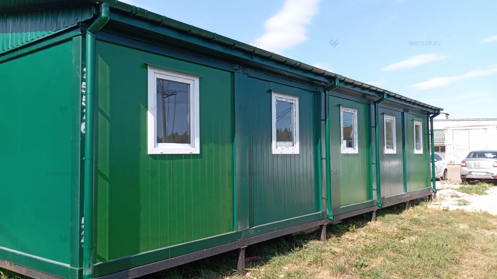 Наружная отделка выполнена из сэндвич-панелей Rockwool 100 мм в зеленом цвете. Внутренняя обрешётка выполнена из бруса 100 х 40 мм с обработкой ОБЗ, которая надежно защищает дерево от возгорания, а также заражения различными микроорганизмами. Выполнена тепло- звукоизоляция пола и потолка материалом УРСА 100 мм, что позволяет использовать здание даже в суровых климатических условиях. Также была выполнена пароизоляция материалом Гидропроф Б. Пол выполнен из ОСБ толщиной 18 мм.