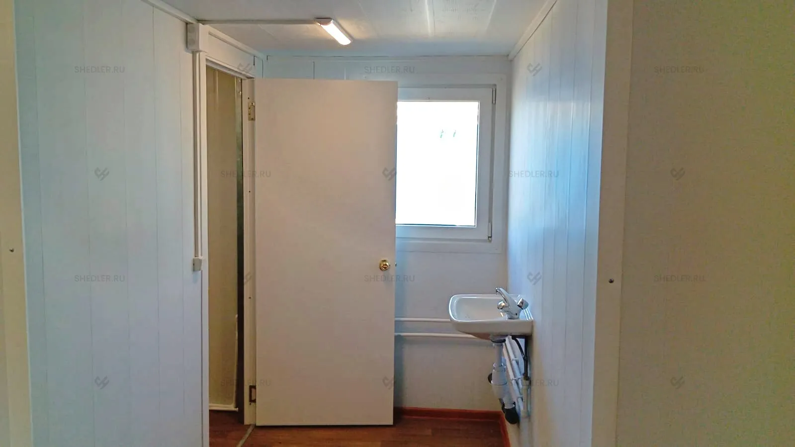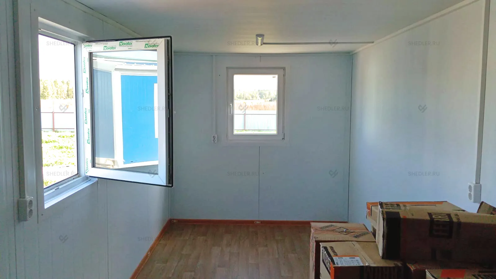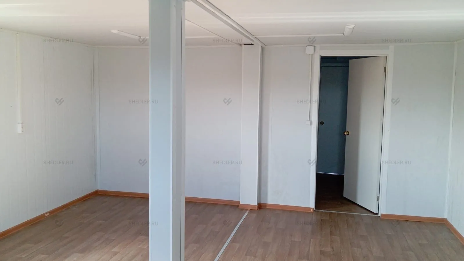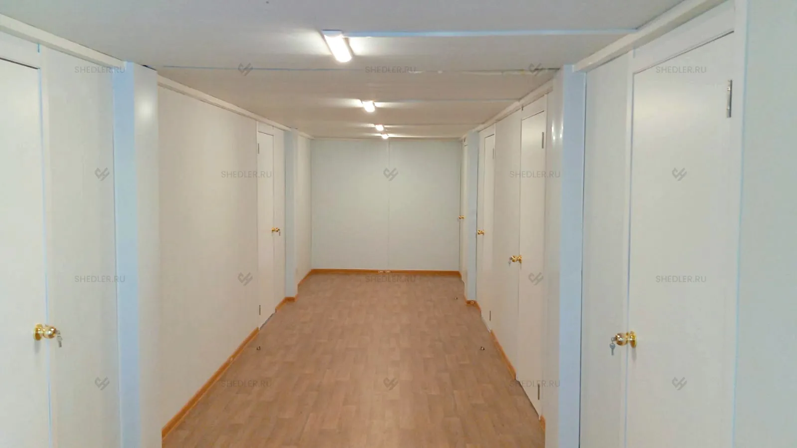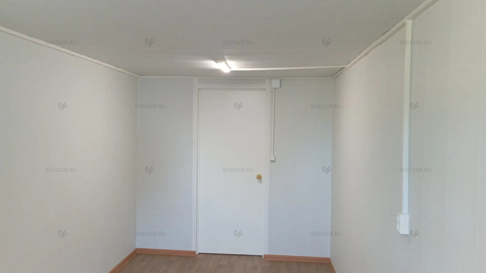 В здании были установлены две входные металлические утепленные двери размером 0,8 х 2 м, а также 9 внутренних дверей из МДФ белого цвета размером 0,8 х 2 м. Дополнительно здание оборудовано внутренними перегородками, обшитыми белыми ПВХ панелями и утепленные материалом УРСА 100 мм.