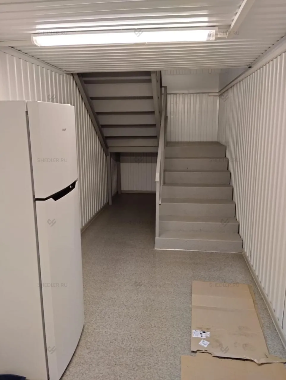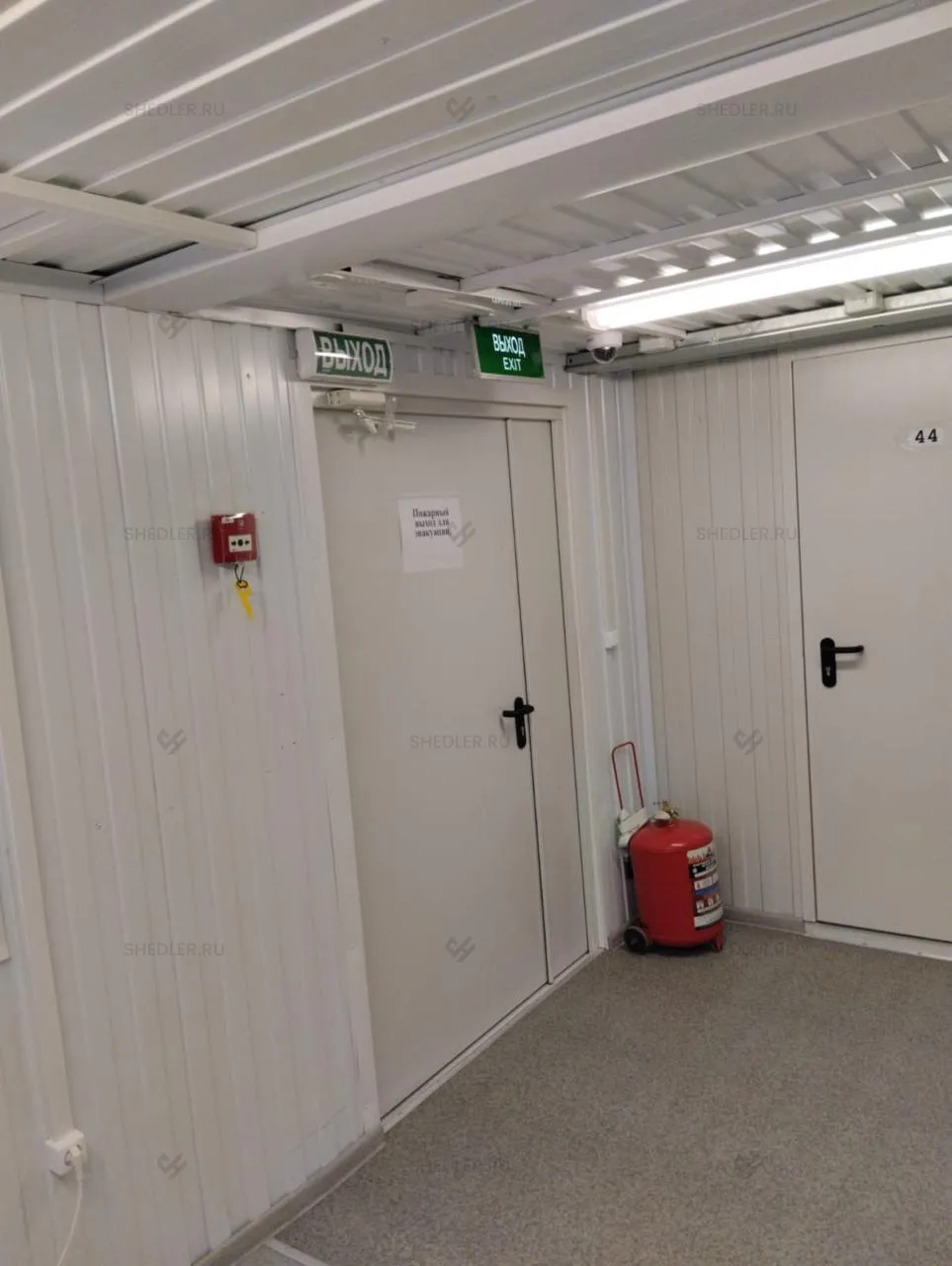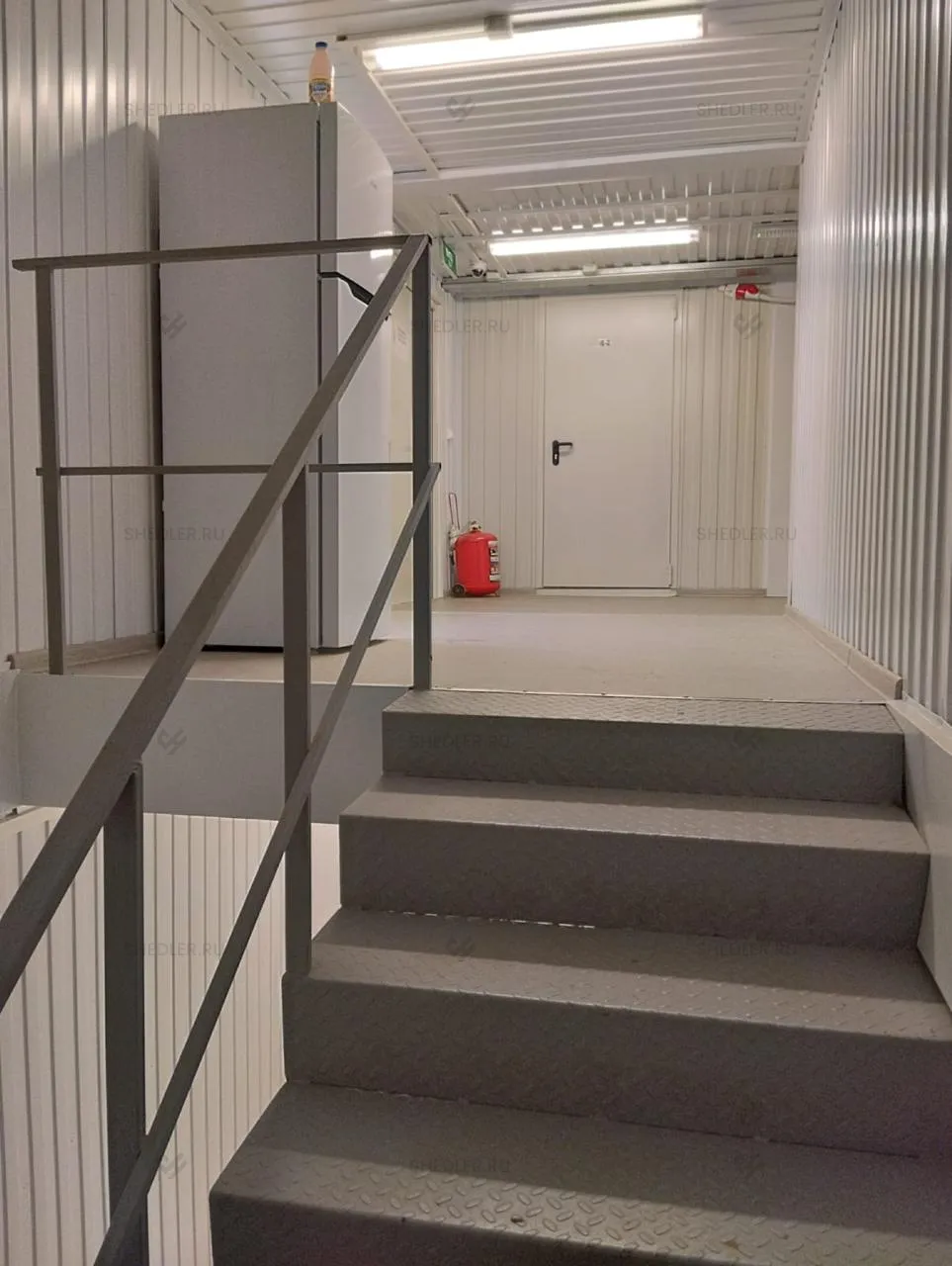 Внутри модульного здания смонтирована лестничная клетка из металла, она представляет собой отдельно стоящее помещение. Для запасного выхода, согласно правилам пожарной безопасности, есть наружная лестница.