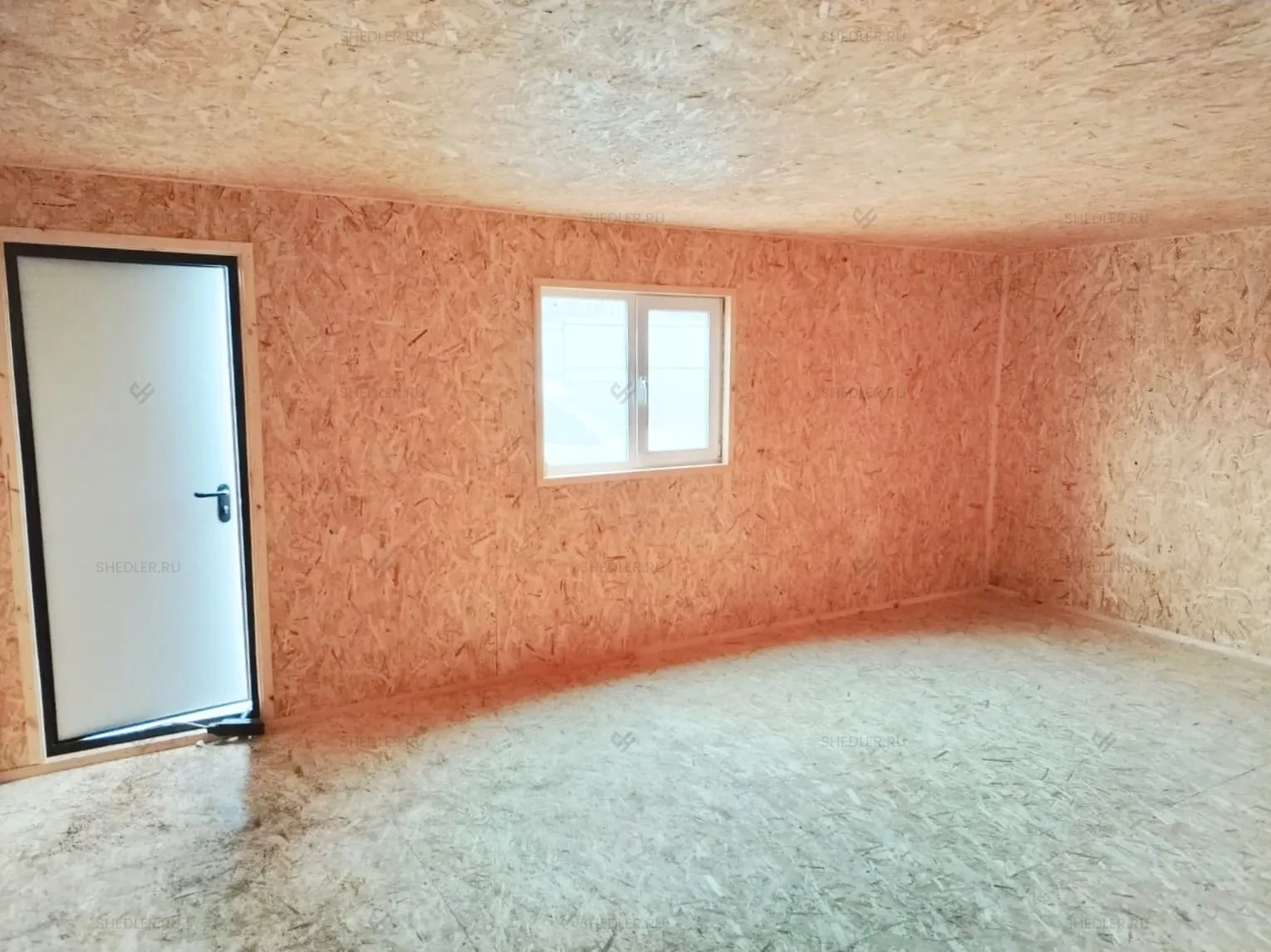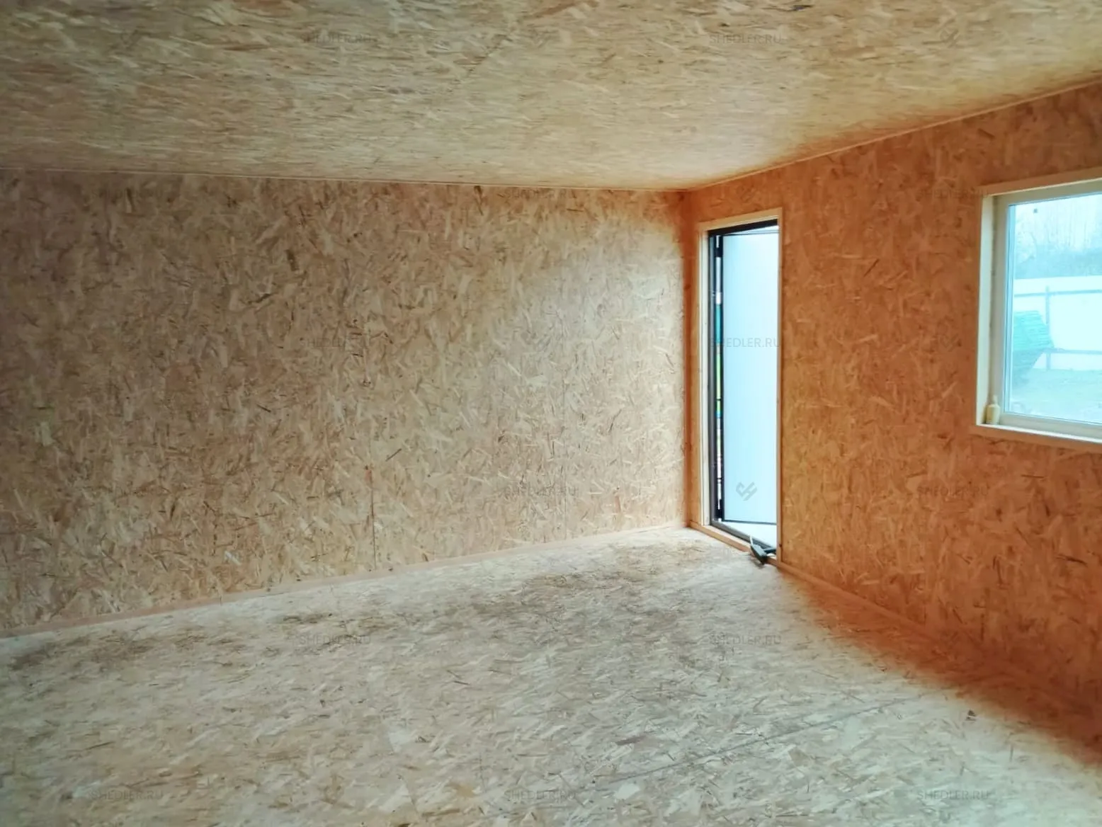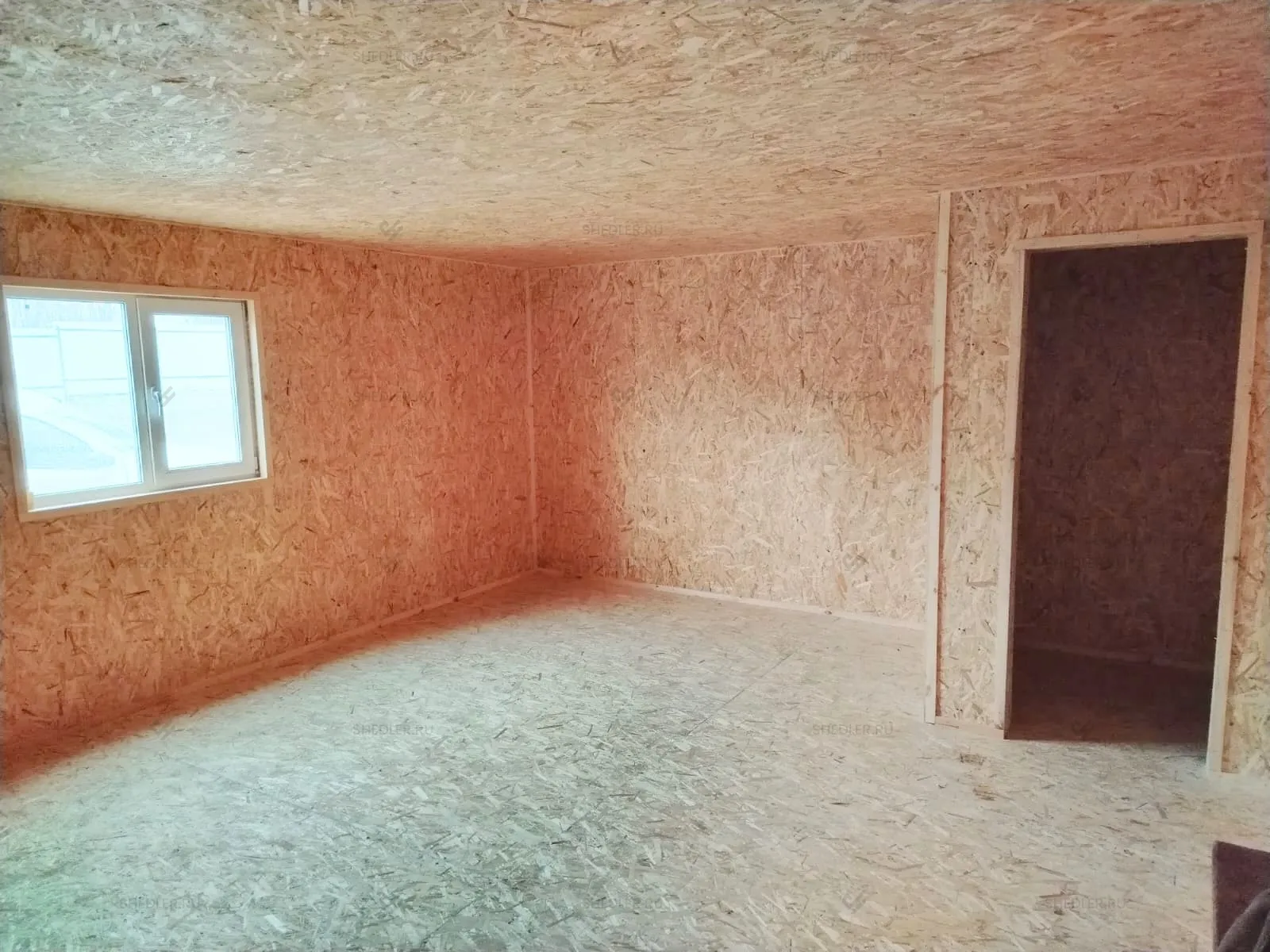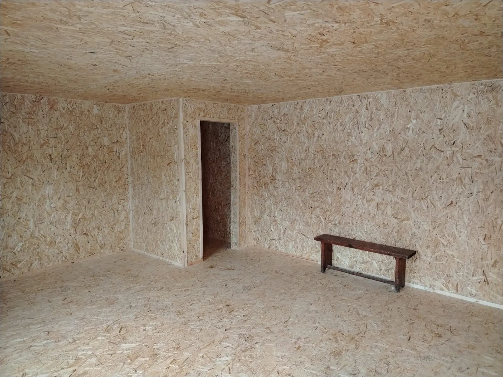 Внутри установлена каркасно-щитовая перегородка, обшитая ОСБ 9 мм. По желанию заказчика, стены и потолок облицованы ОСБ 9 мм, а на полу ОСБ 12 мм. От внутренних дверей и электропроводки клиент отказался.