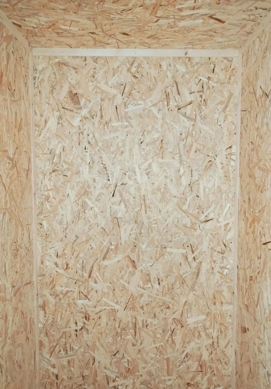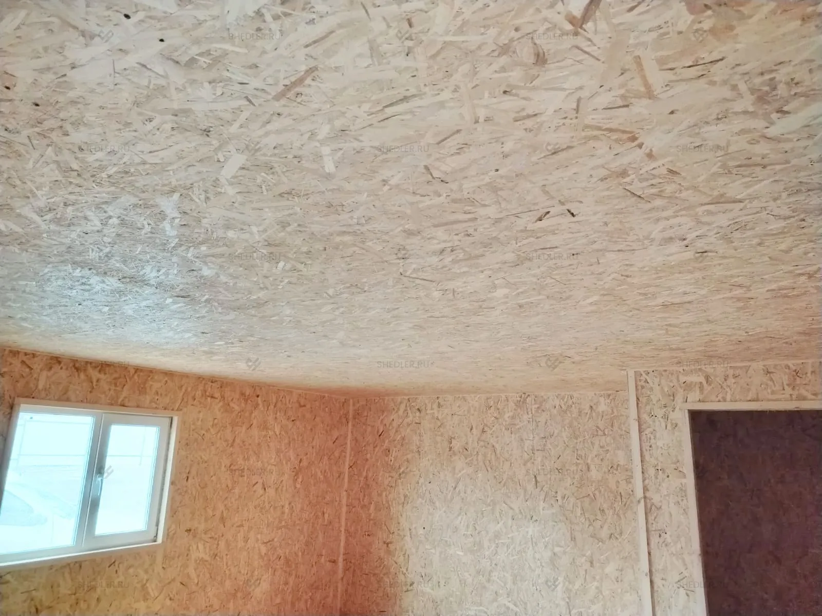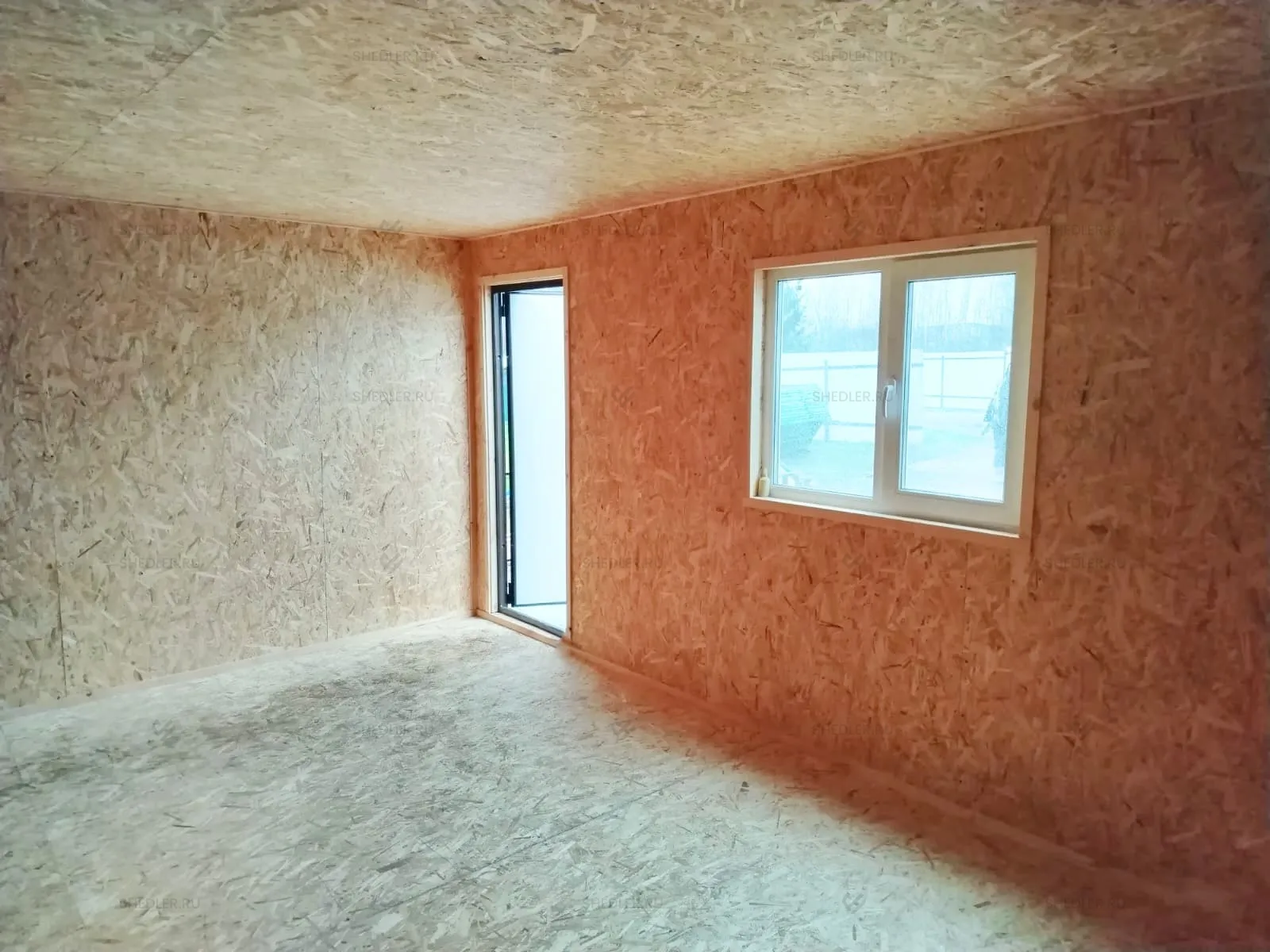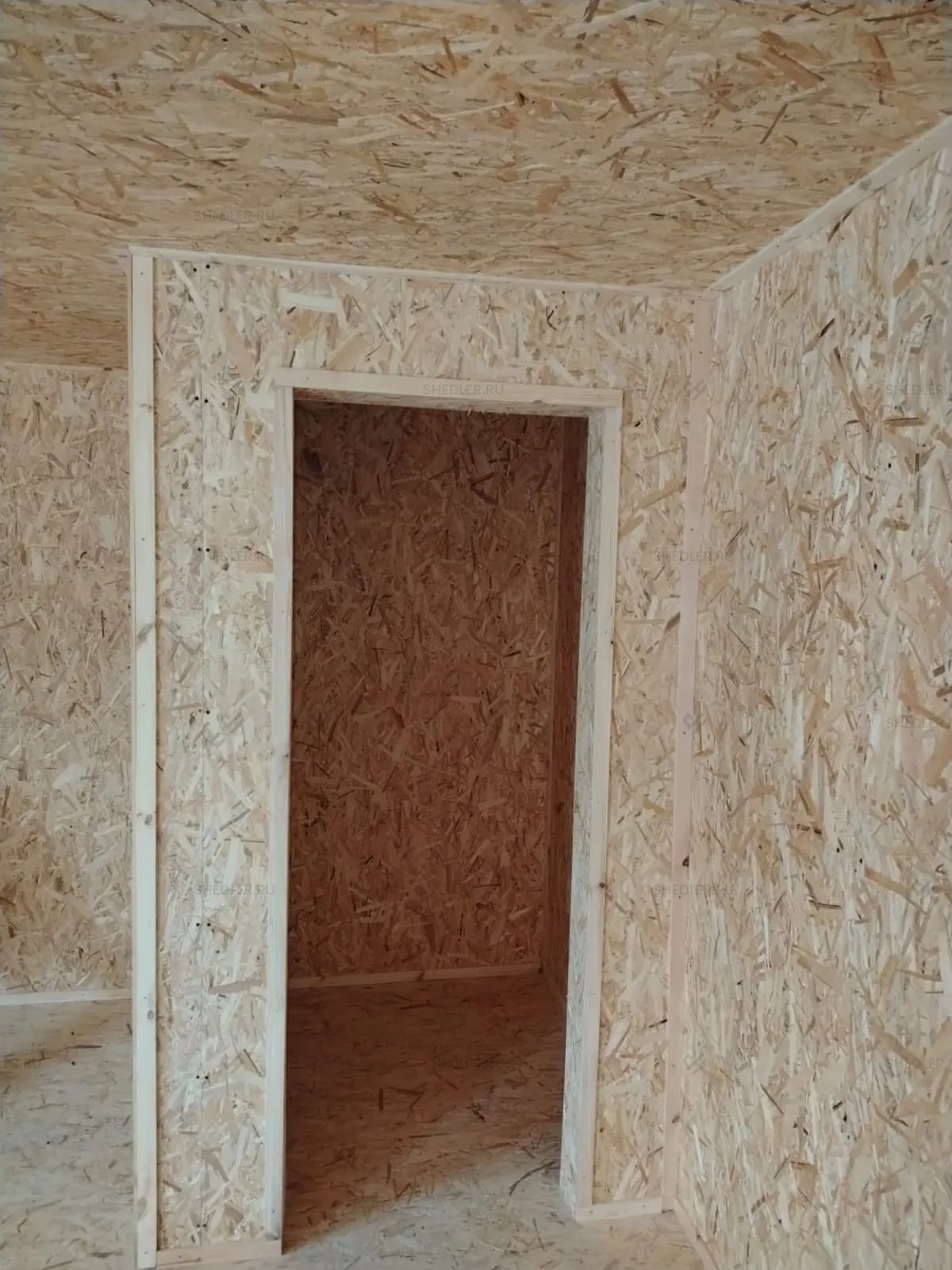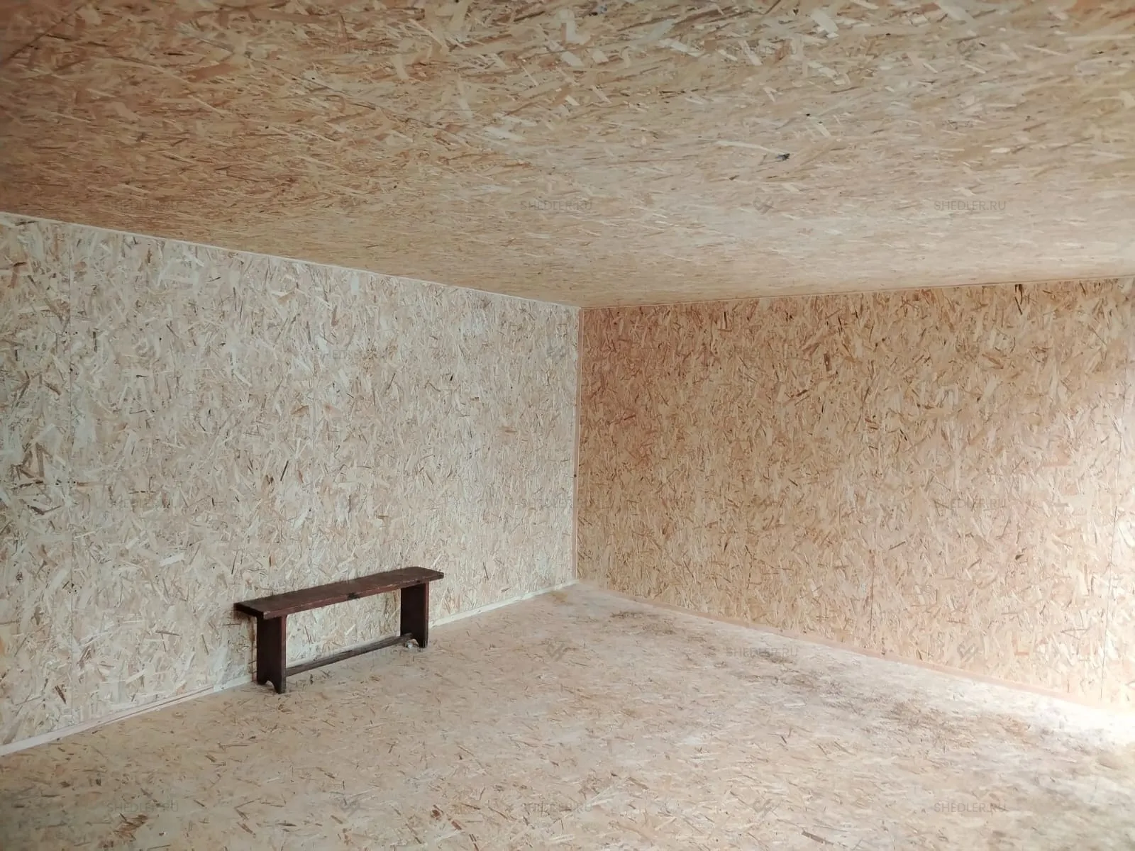 Внутри установлена каркасно-щитовая перегородка, обшитая ОСБ 9 мм. По желанию заказчика, стены и потолок облицованы ОСБ 9 мм, а на полу ОСБ 12 мм. От внутренних дверей и электропроводки клиент отказался.