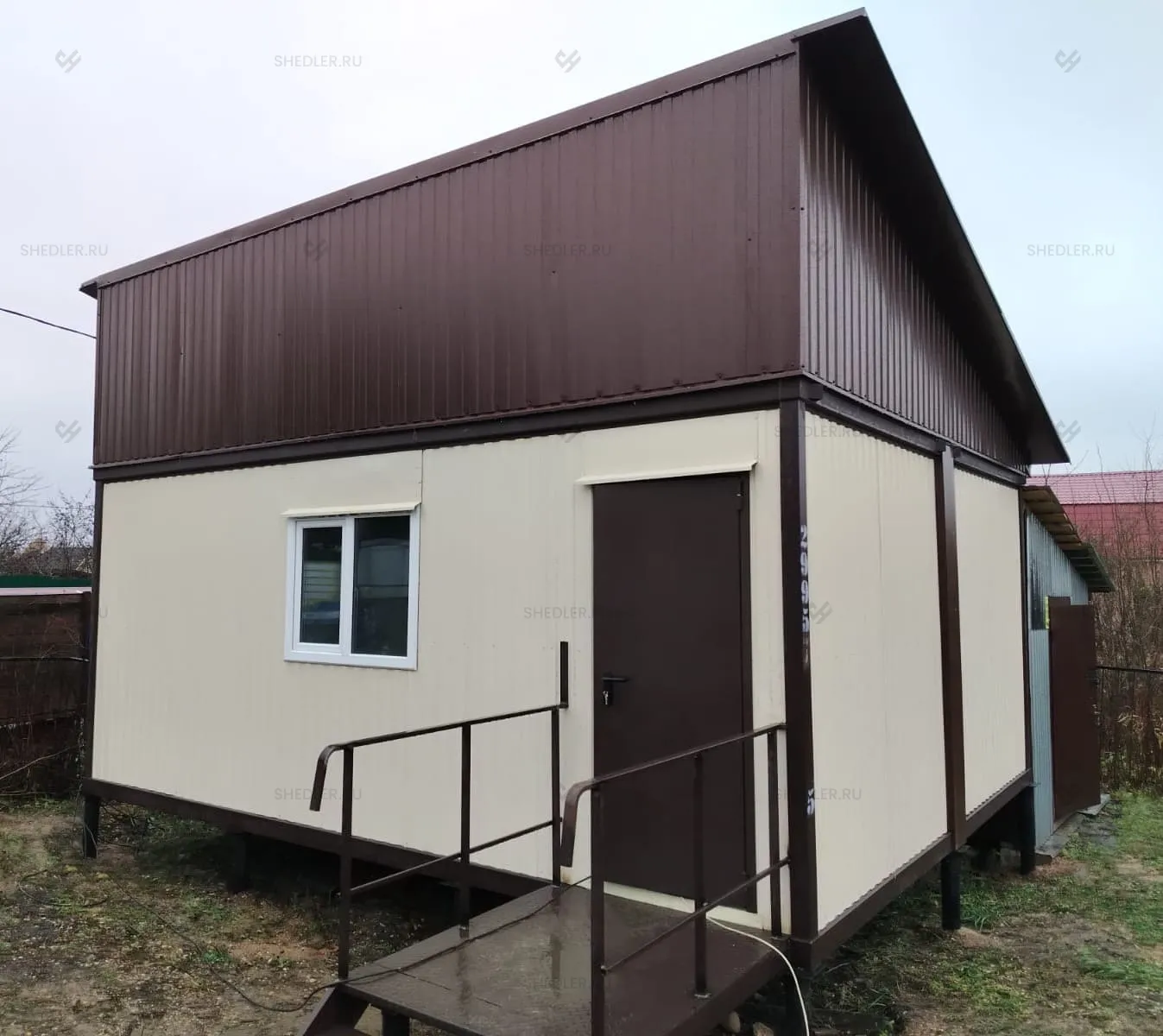 Домик установлен на сваи. Чтобы вход был комфортным, мы сделали небольшое крыльцо. Оно состоит из металлической площадки 1,25 х 1,25 мм с перилами и лестницы из двух ступеней.