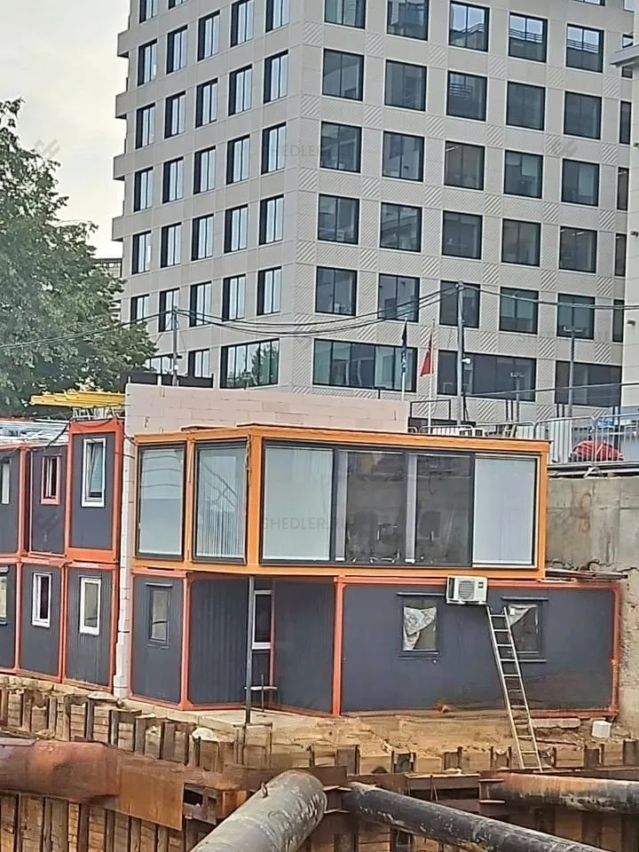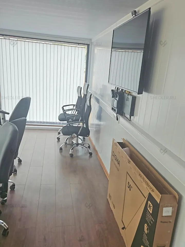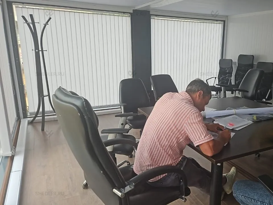 В модульном здании установлены панорамные окна, утепленная входная металлическая дверь 0,9 х 2 м с двумя замками.