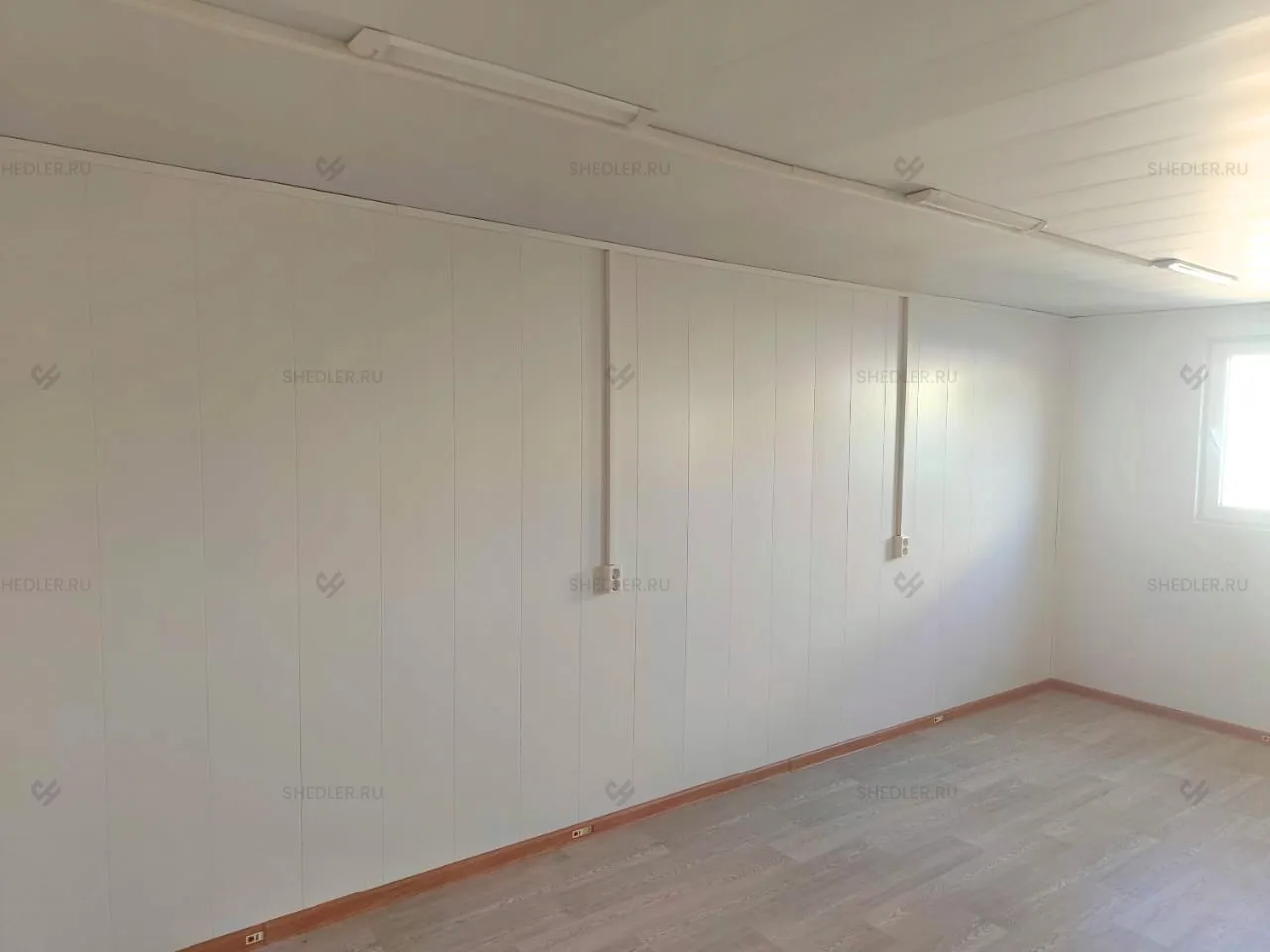 Наружная отделка была выполнена из профлиста С8 в светло-сером цвете RAL 7035. Внутреннюю отделку стен сделали из МДФ, потолка - ПВХ.