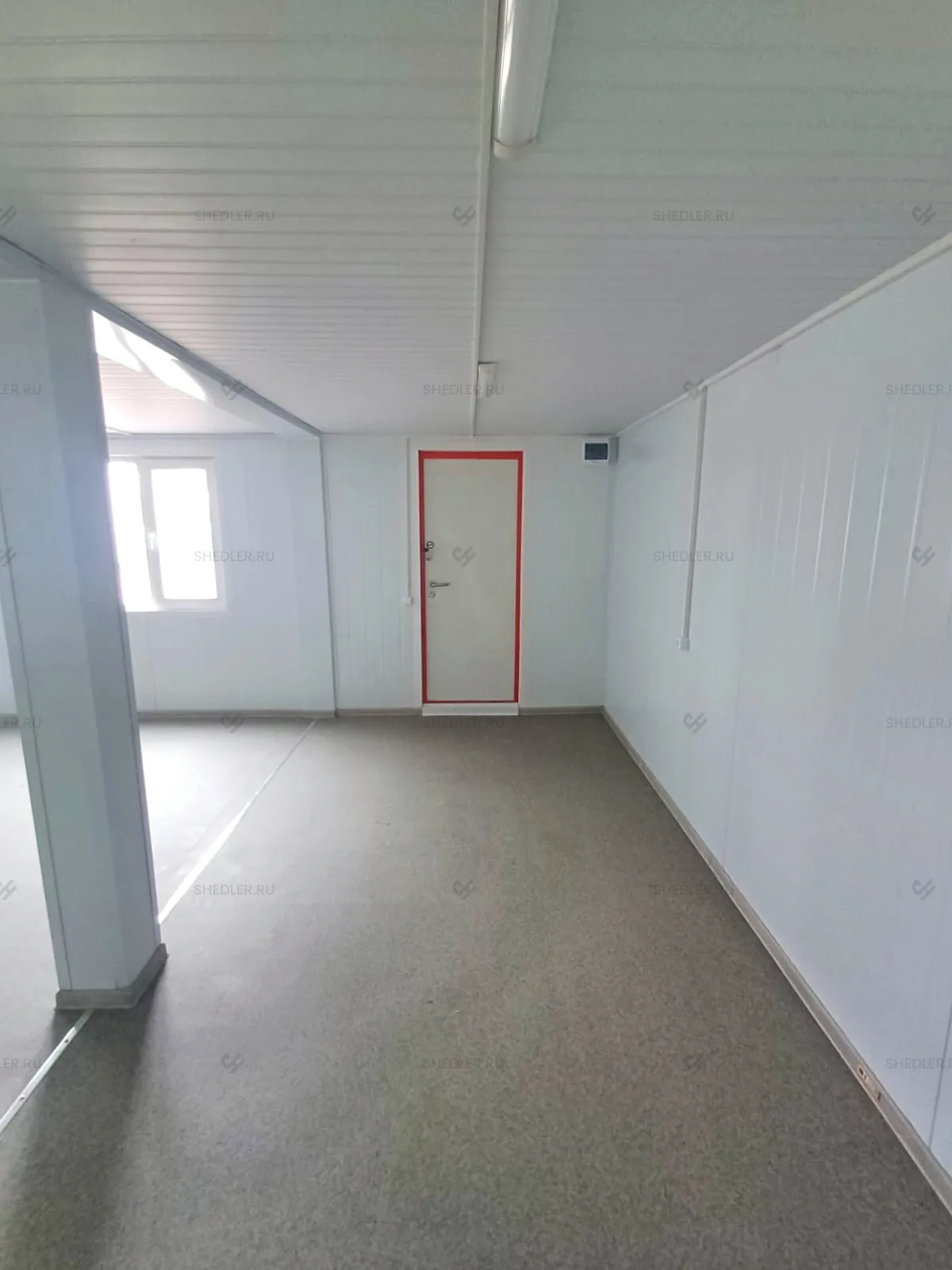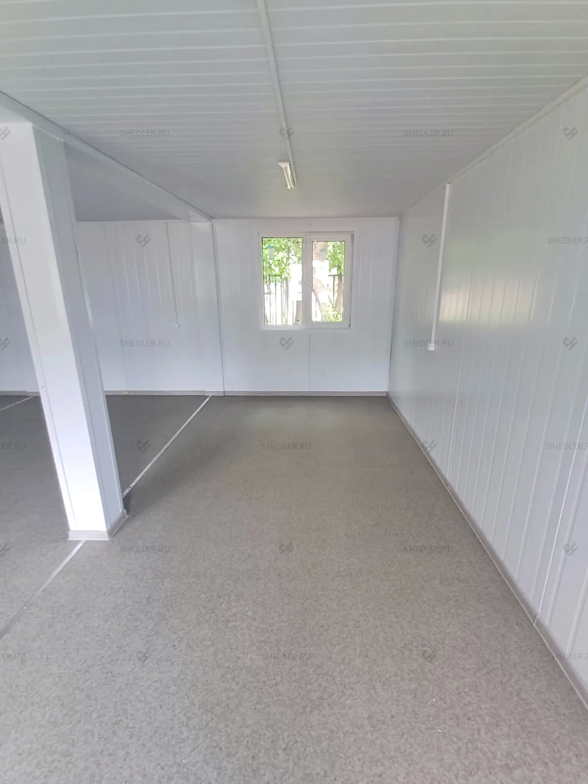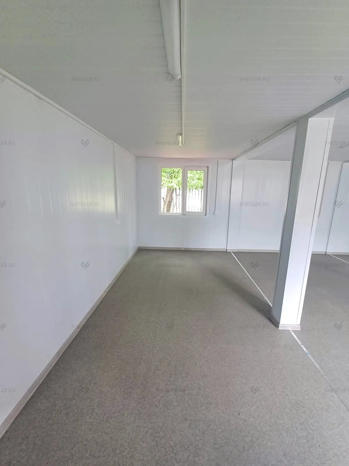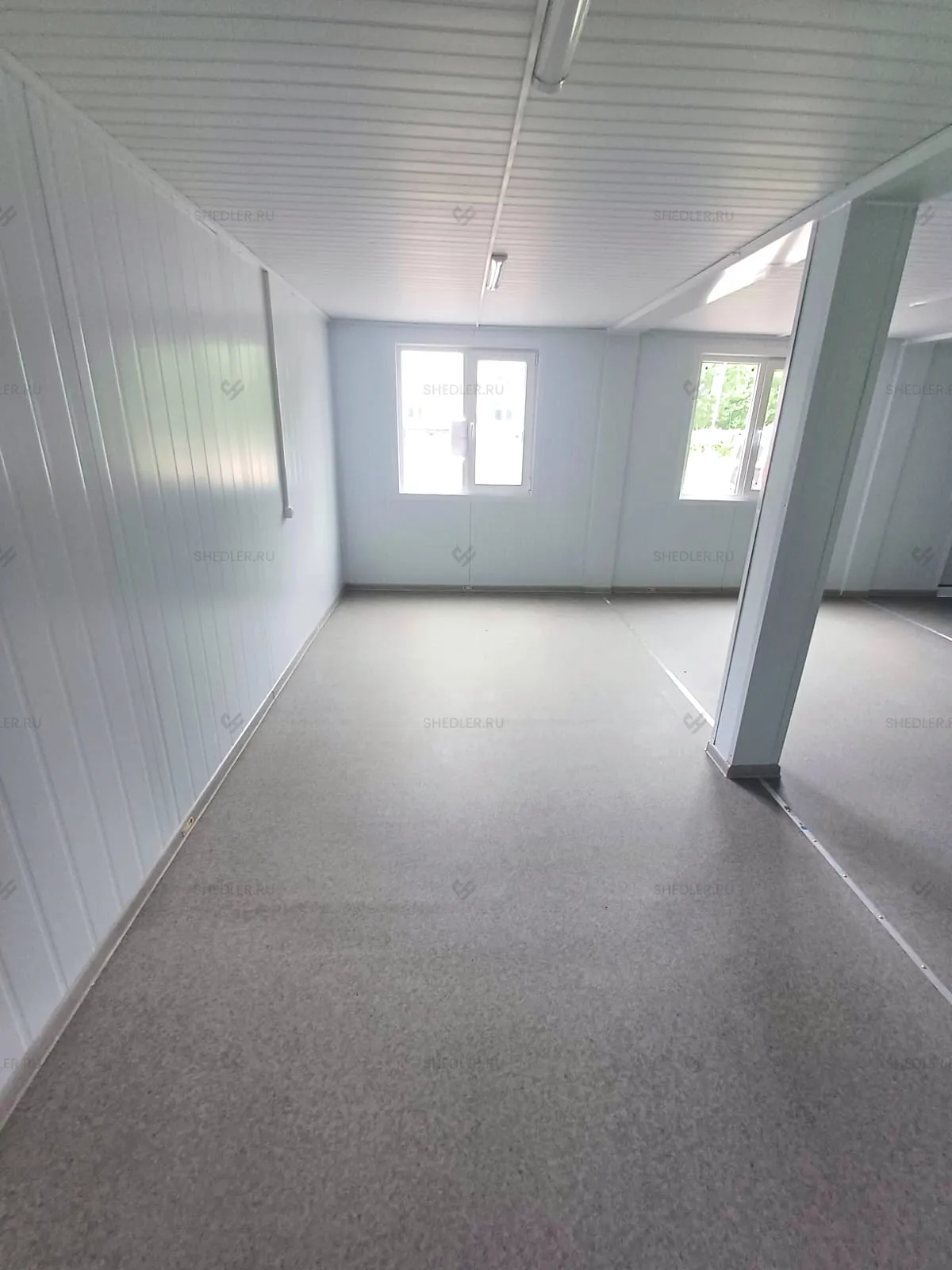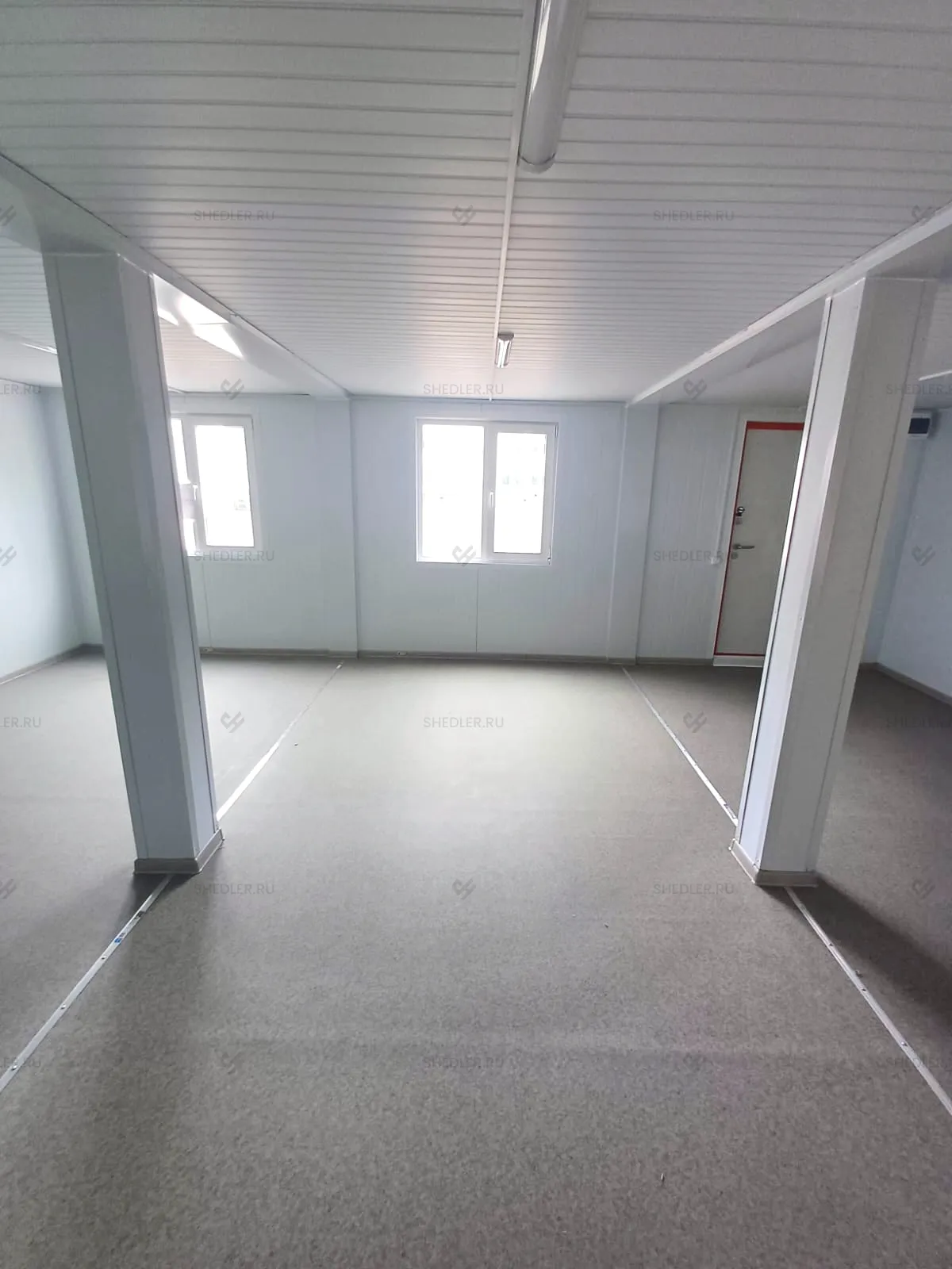 В модуле установлена утеплённая металлическая дверь с отделкой МДФ. Освещение и электроснабжение реализованы по евростандарту: установлен щиток, розетки, выключатели, светильники — всё смонтировано аккуратно в кабель-канале, рассчитано на мощность до 5 кВт. Окна — четыре пластиковых двухстворчатых блока 1,2 × 1,2 м, одна из створок у каждого окна — поворотно-откидная, что обеспечивает проветривание и комфорт внутри помещения.