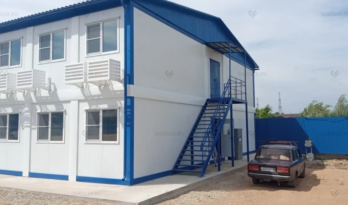 Входная группа с навесом, наружная и внутренняя лестницы, вентиляционные решетки, короб для кондиционера, крыльцо — все предусмотрено. Это не просто модульное здание, а комплекс, готовый к полноценной эксплуатации.