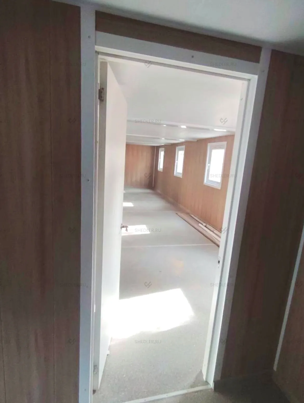 Крыша конструкции сделана плоской, толщина стального листа 0,7мм - этого достаточно чтобы выдержать снеговую нагрузку. В модульном здание устанволено 13 ПВХ окон размером 80 на 100мм, с повородно-откидным механизмом.