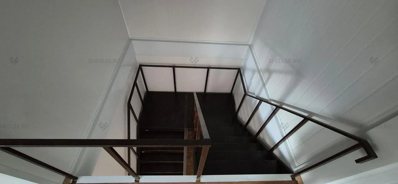 - Просторной поворотной лестницей на второй этаж с ограждениями.