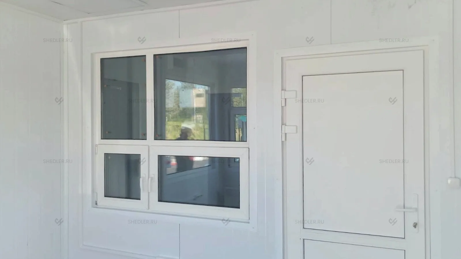 Здание оборудовано двумя входными металлическими дверями размером 96 х 207 см с врезными замками и усиленным доводчиком, а также двумя глухими ПВХ окнами с импостом размером 155 х 143 см, одним ПВХ окном размером 155 х 143 см с двумя створками и двумя форточками и одним ПВХ окном размером 313 х 143 см с тремя створками и двумя форточками.