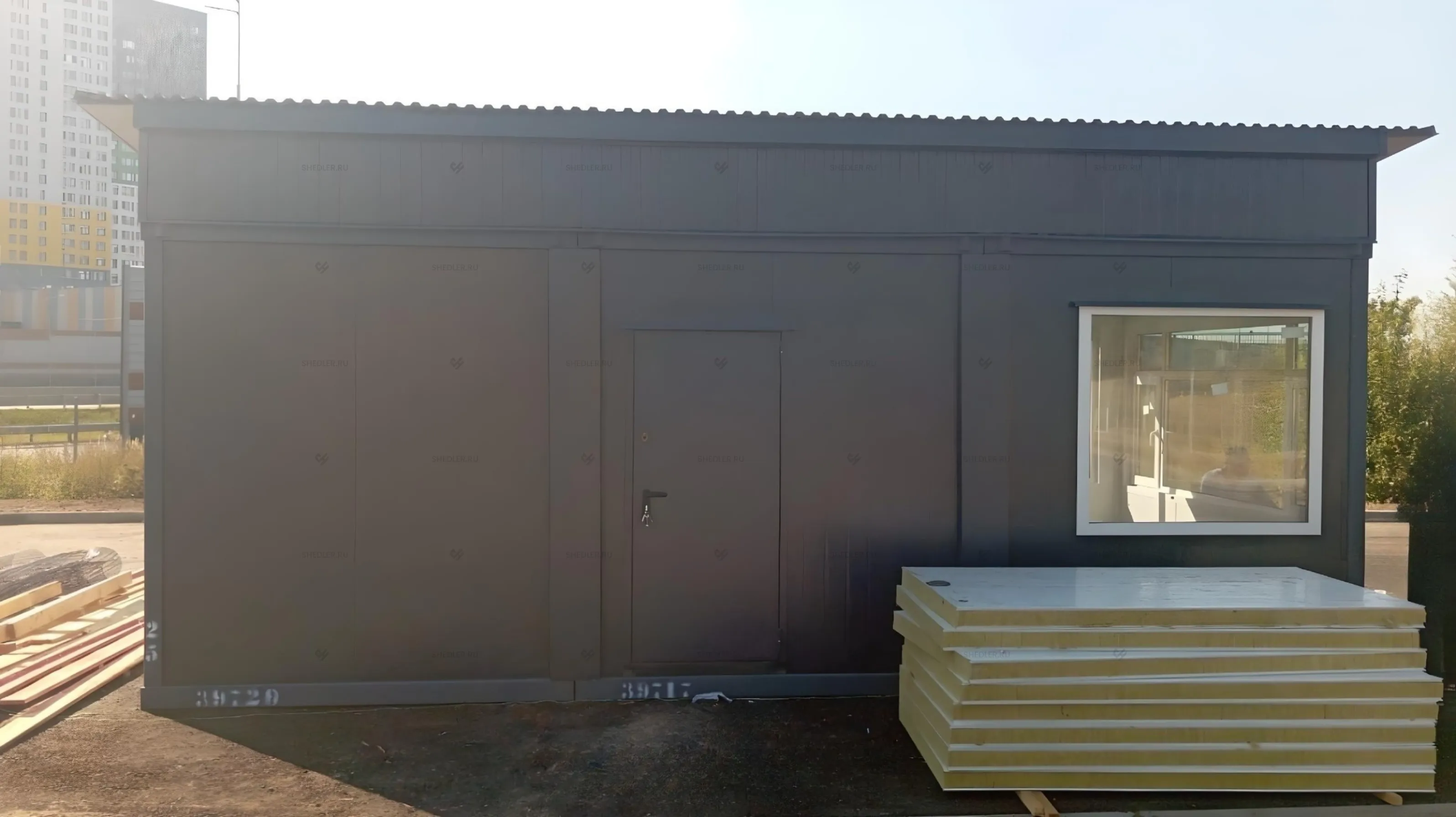 Крыша была выбрана односкатная в графитовом цвете RAL 7024. Наружная отделка здания была выполнена из сэндвич-панелей Rockwool 100 мм также в цвете RAL 7024. Внутренняя обрешетка выполнена из бруса 100 х 40 мм естественной влажности. Внутренняя отделка стен сделана из сэндвич-панелей Rockwool 100 мм белого цвета RAL 9003, потолка - из белых ПВХ панелей. На полу уложена ОСБ толщиной 18 мм с покрытием полукоммерческим линолеумом.