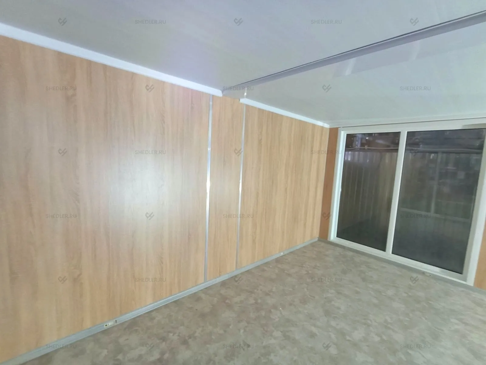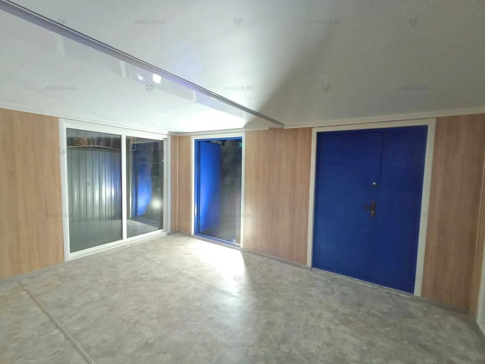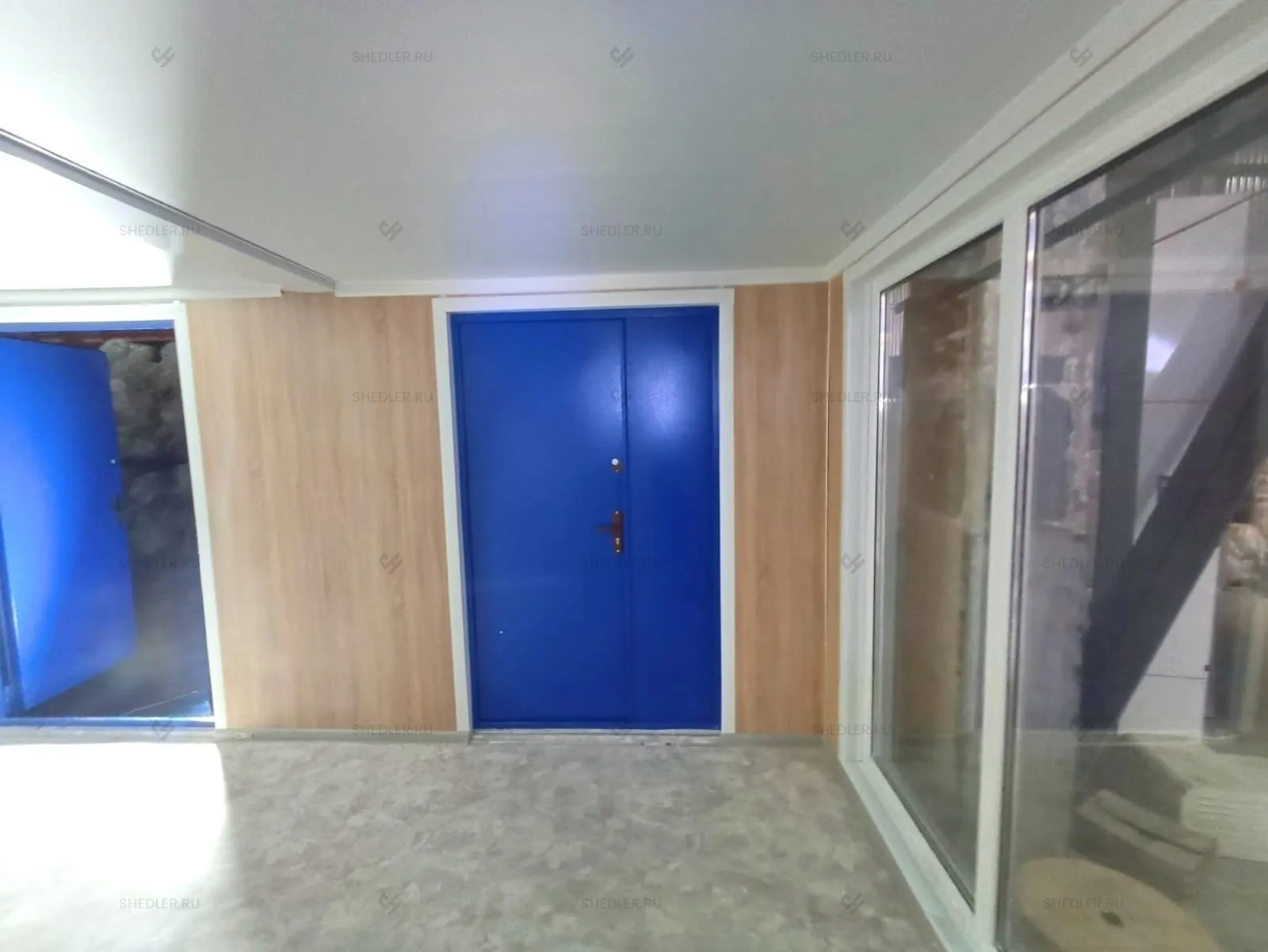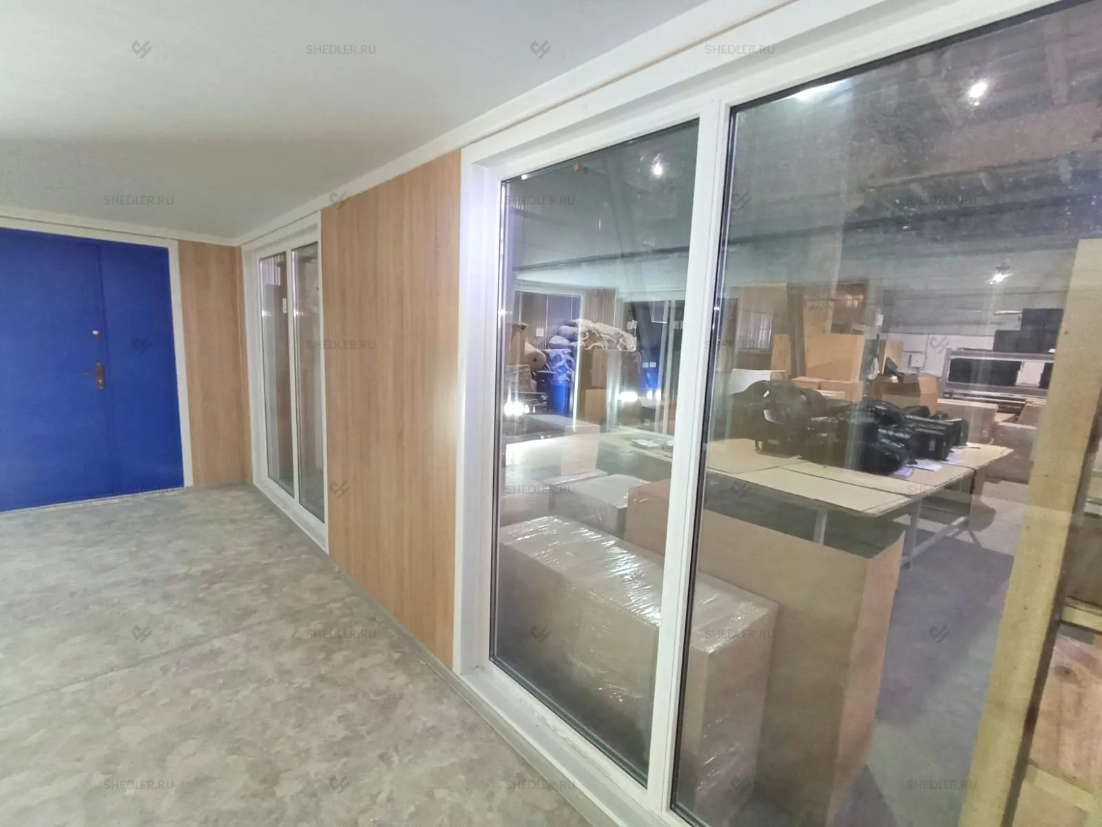 Дополнительно здание оборудовали внутренней неутепленной перегородкой с отделкой ЛДСП белого цвета, двумя металлическими входными дверями в синем цвете, межкомнатной дверью из МФД, 4-мя глухими ПВХ окнами с двойным остеклением. На пол постелили антистатический линолеум.