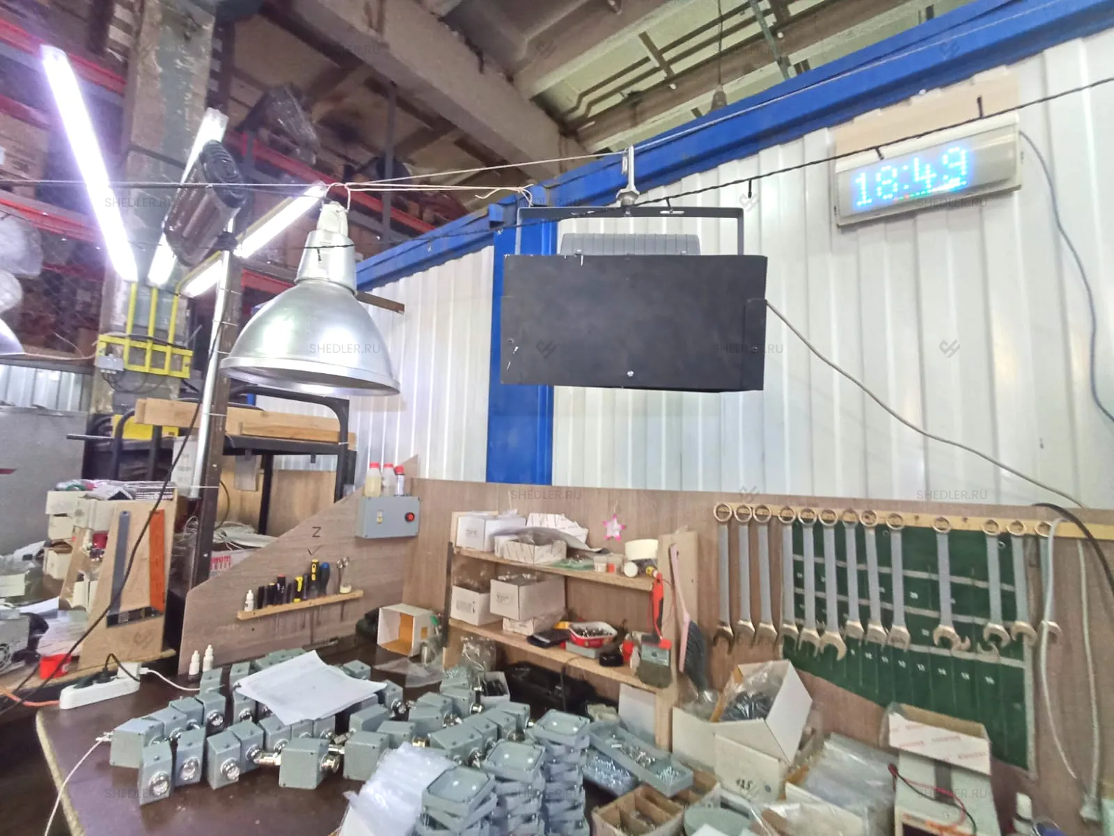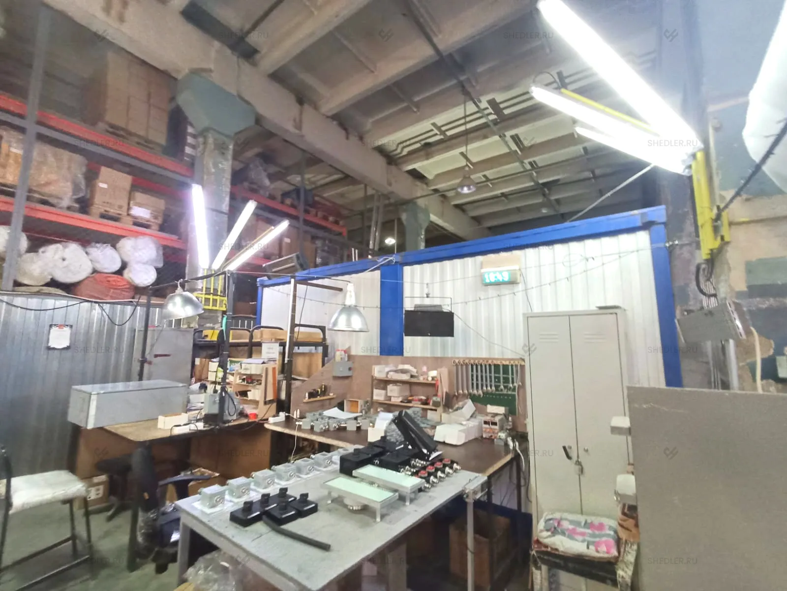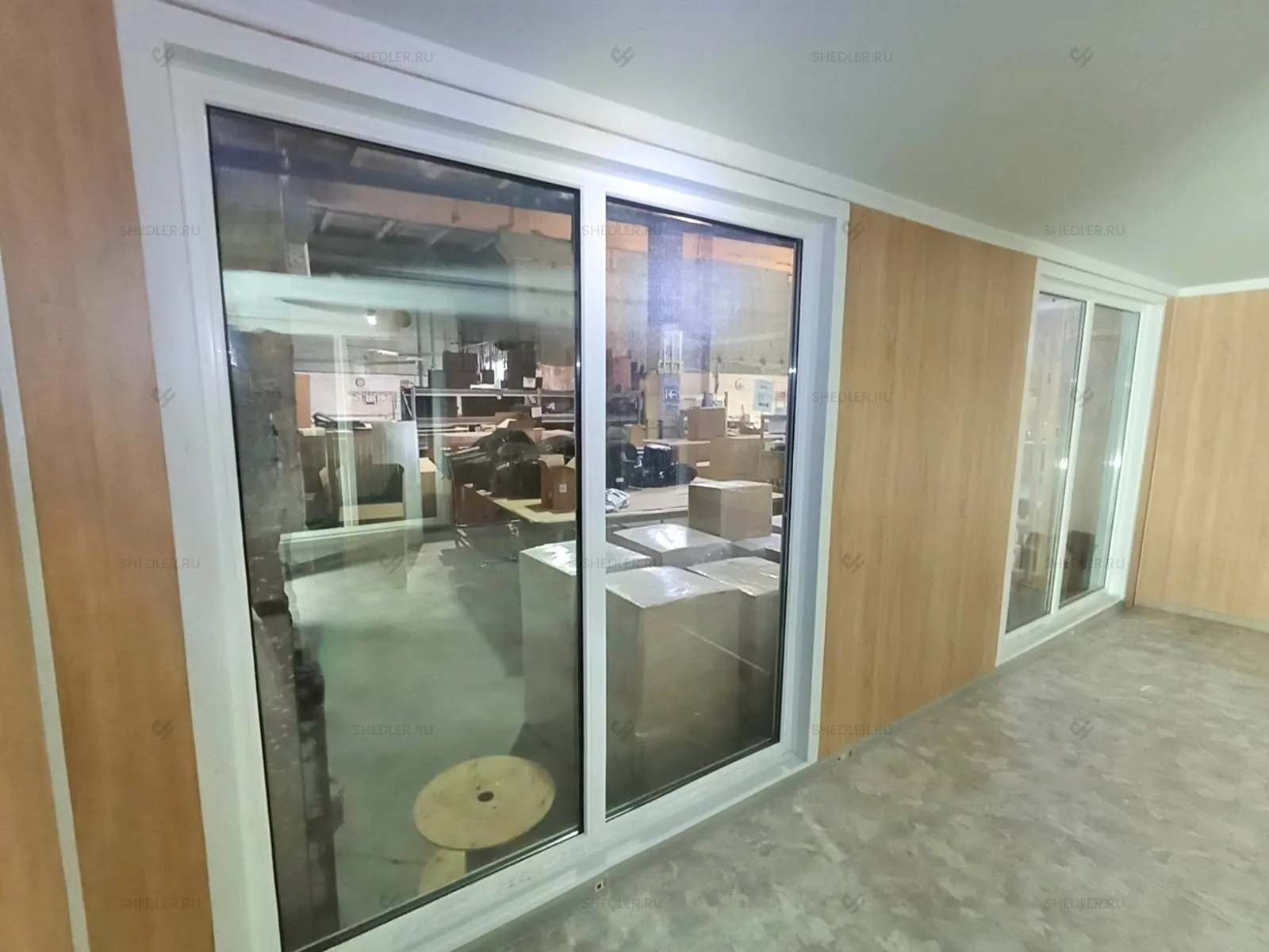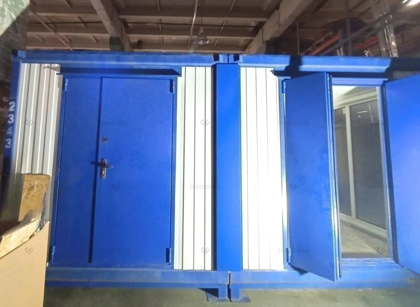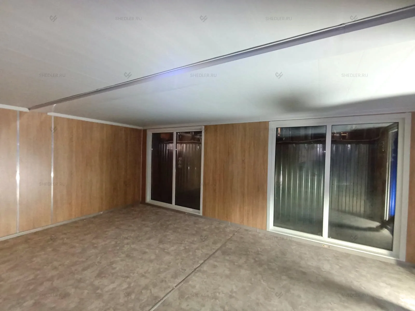 Дополнительно здание оборудовали внутренней неутепленной перегородкой с отделкой ЛДСП белого цвета, двумя металлическими входными дверями в синем цвете, межкомнатной дверью из МФД, 4-мя глухими ПВХ окнами с двойным остеклением. На пол постелили антистатический линолеум.