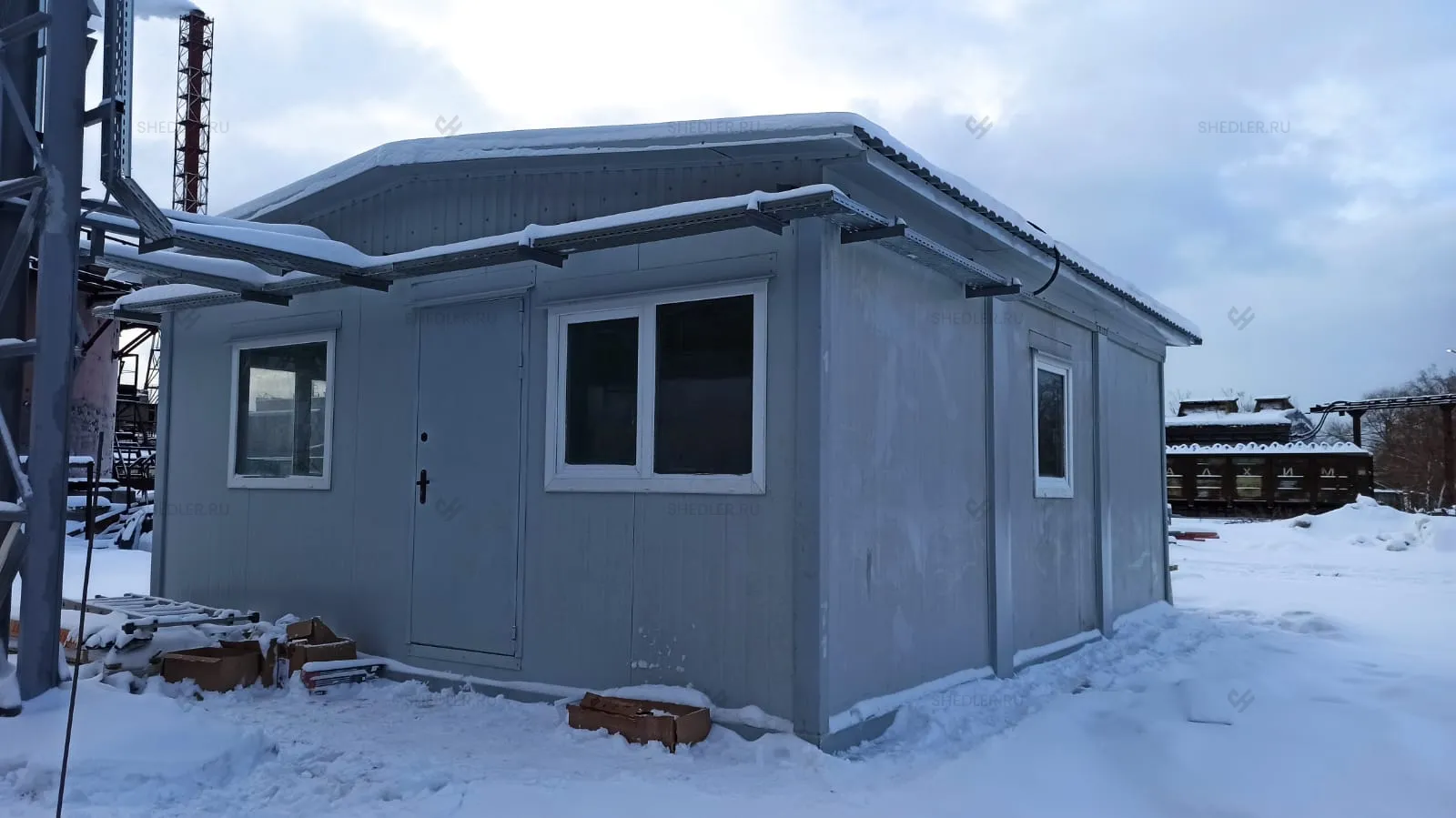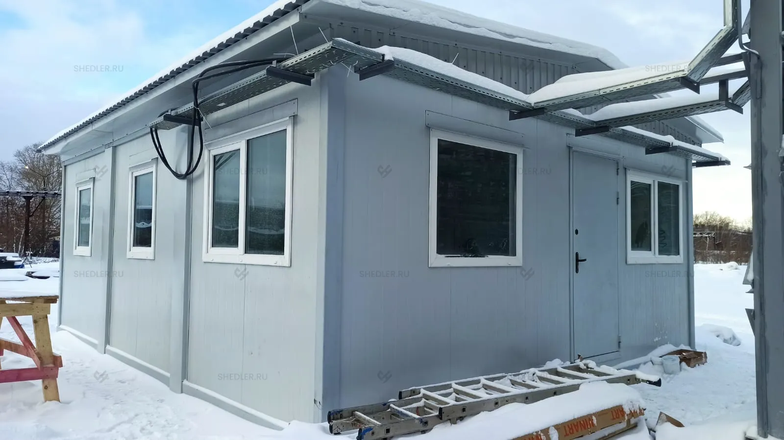 На изготовление модульного здания ушло 10 дней. Доставляли заказчику постройку 4-мя манипуляторами.