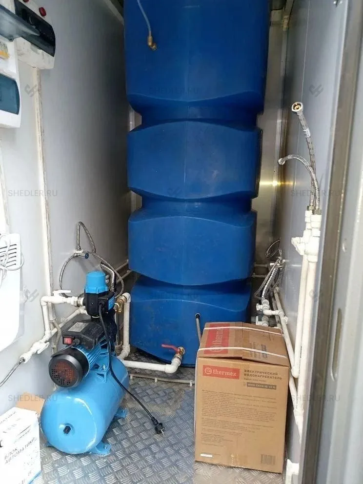 Наличие отопления, вентиляции и водоснабжения обеспечивает городской уровень комфорта для всех посетителей. Чистой водой в автономном режиме обеспечивает полиэтиленовый бак на 100 л и встроенная насосная система мощностью 0,6 кВт, которая прокачивает воду по полипропиленовым трубам. Неприятные запахи и водяной пар из помещения удаляет принудительная вентиляция, а за подогрев воды отвечает бойлер. Поддерживать комфортную температуру воздуха помогают 3 конвектора суммарной мощностью 3 кВт.