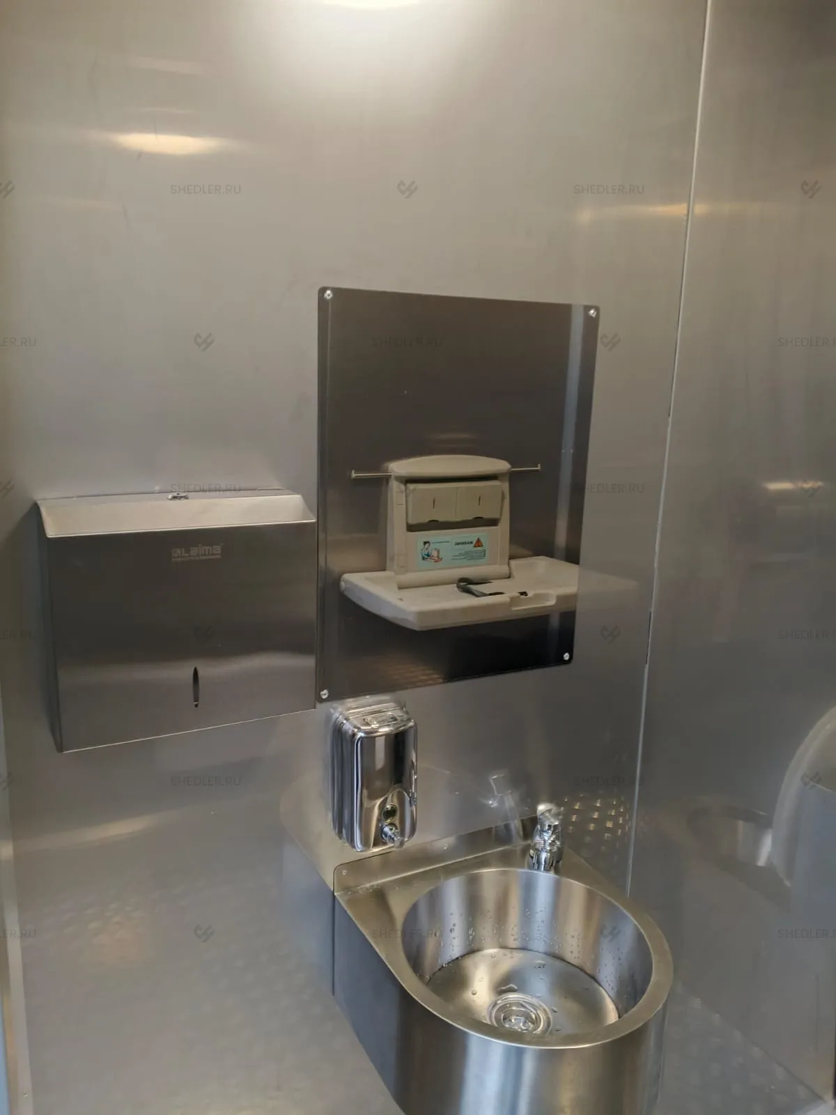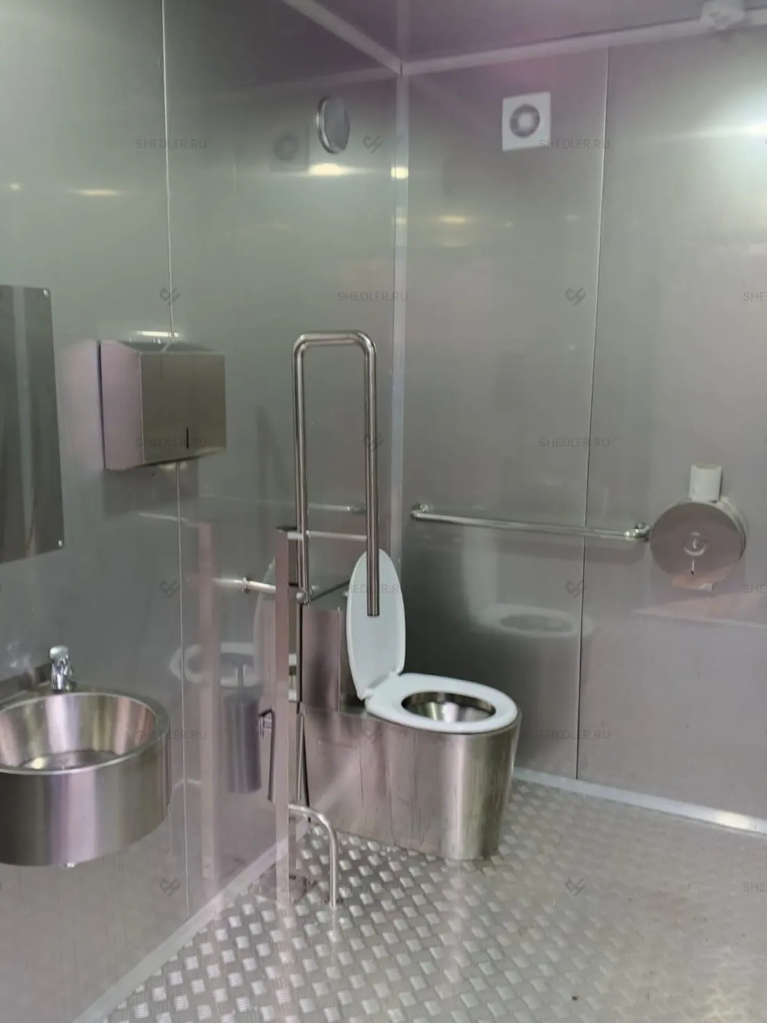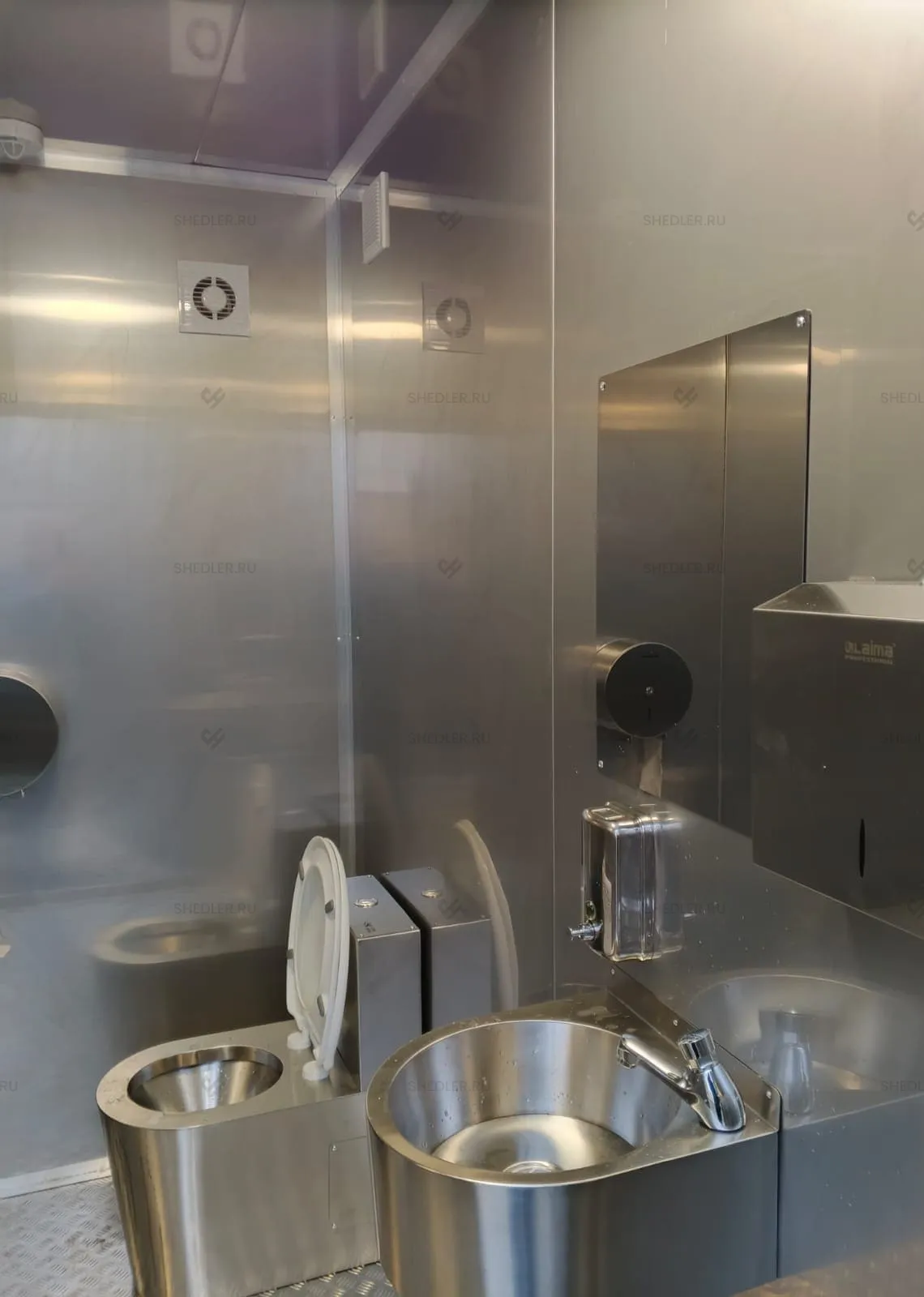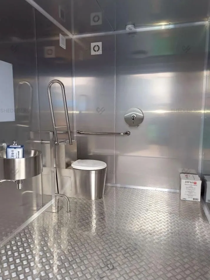 Мы также включили полный комплект сантехники, светотехники и электротехники в качестве дооснащения туалетного модуля. В базовой комплектации есть антивандальные унитазы раковина, зеркало, диспенсеры для туалетной бумаги, жидкого мыла и бумажных полотенец. Также есть сушилка для рук, крючки для одежды и другие аксессуары – оснащение продумано до мелочей.