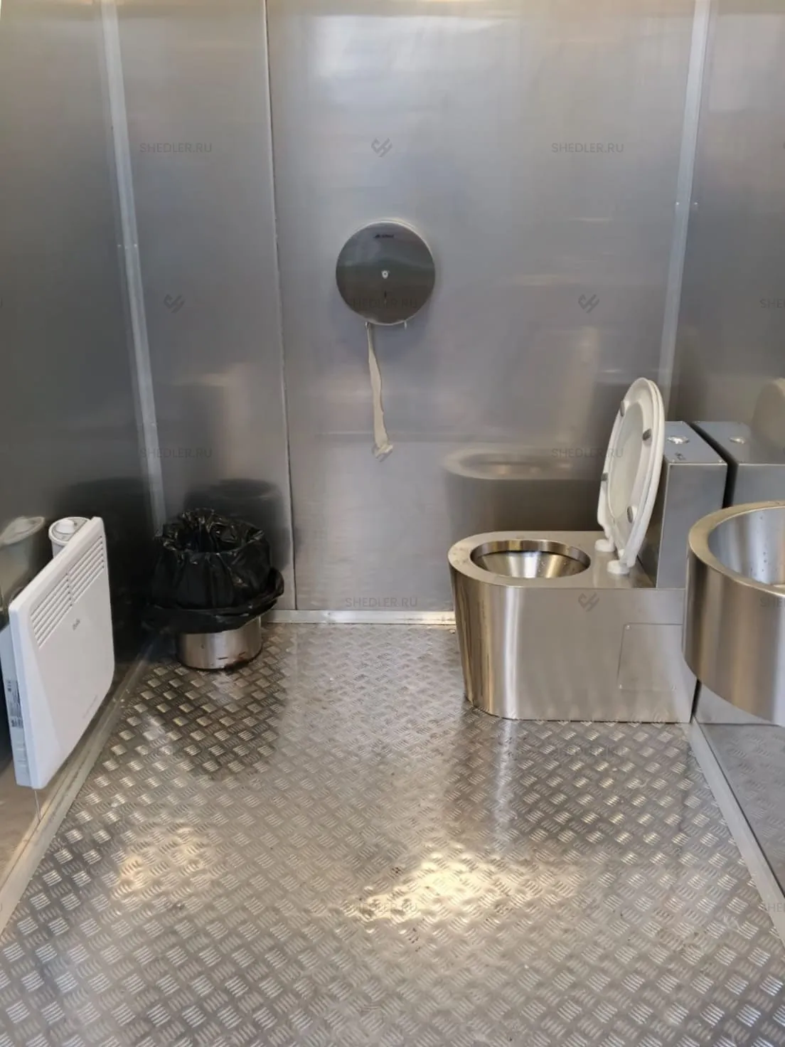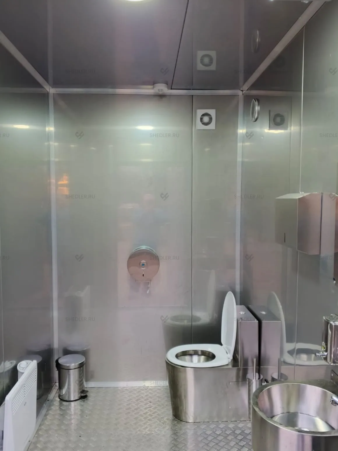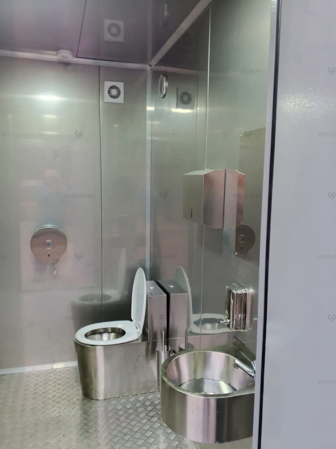 Мы также включили полный комплект сантехники, светотехники и электротехники в качестве дооснащения туалетного модуля. В базовой комплектации есть антивандальные унитазы раковина, зеркало, диспенсеры для туалетной бумаги, жидкого мыла и бумажных полотенец. Также есть сушилка для рук, крючки для одежды и другие аксессуары – оснащение продумано до мелочей.