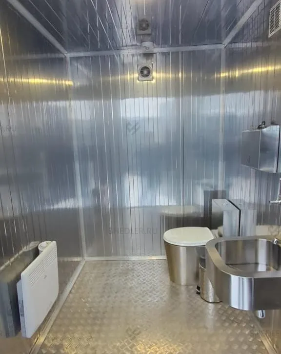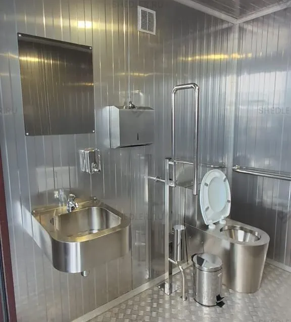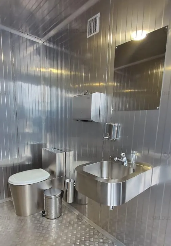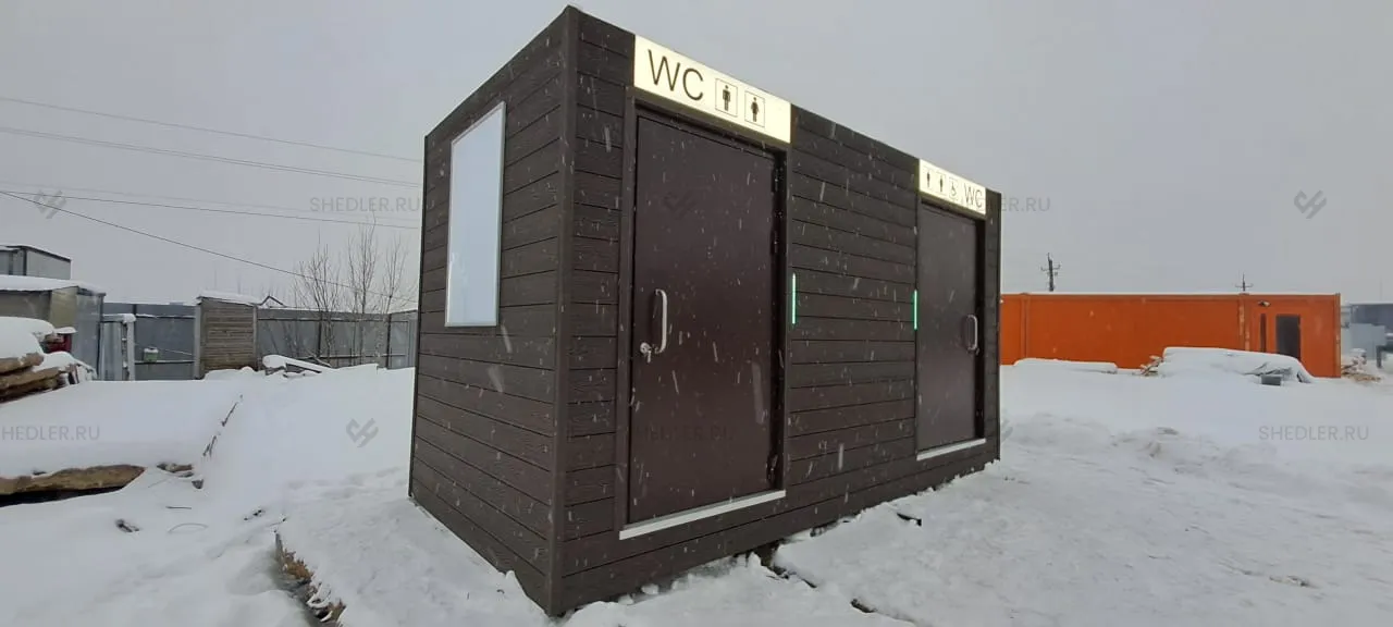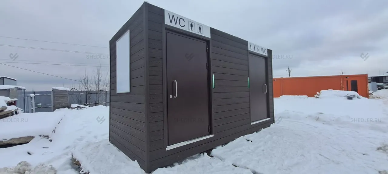 Изготовили модульный туалет SHEDLER TM-2-H-A размером 2,3 х 4,8 х 2,7 м из сэндвич-панелей. Общая площадь здания 11,04 кв.м.