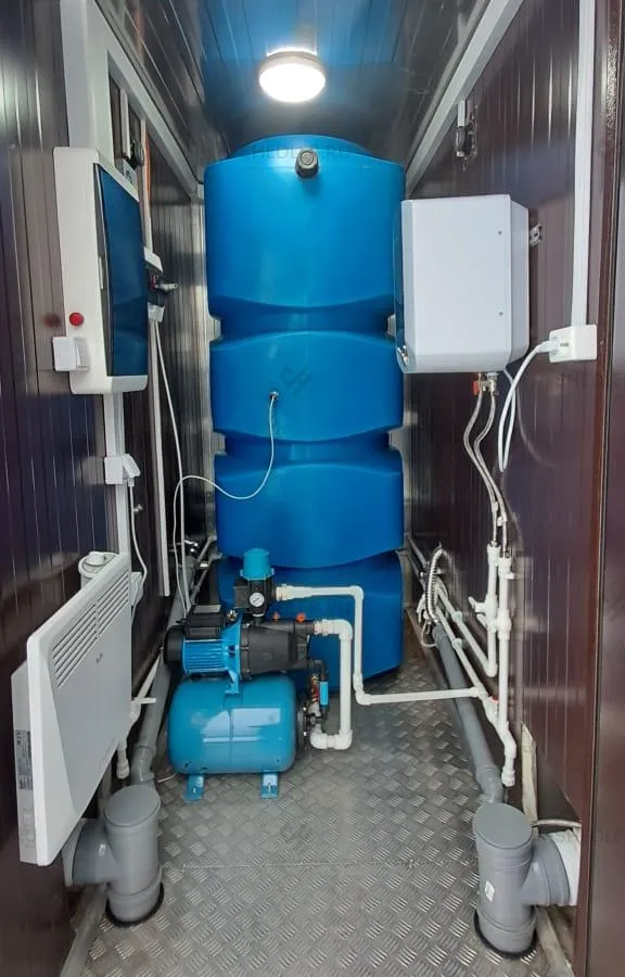 Также в модульном туалете установили вытяжной вентилятор, канализационный бак, бак для воды, насосную станцию, фильтр для очистки воды, бойлер на 10 литров, три конвектора, проведена электрика.