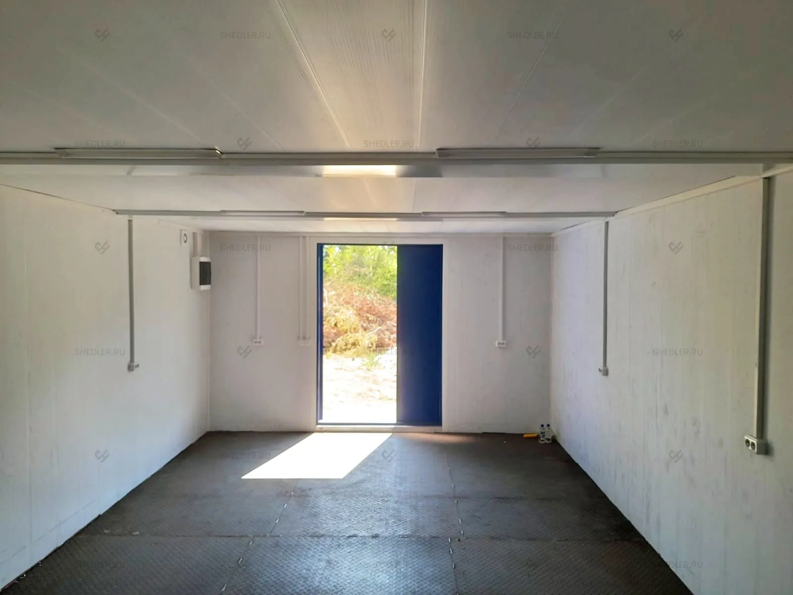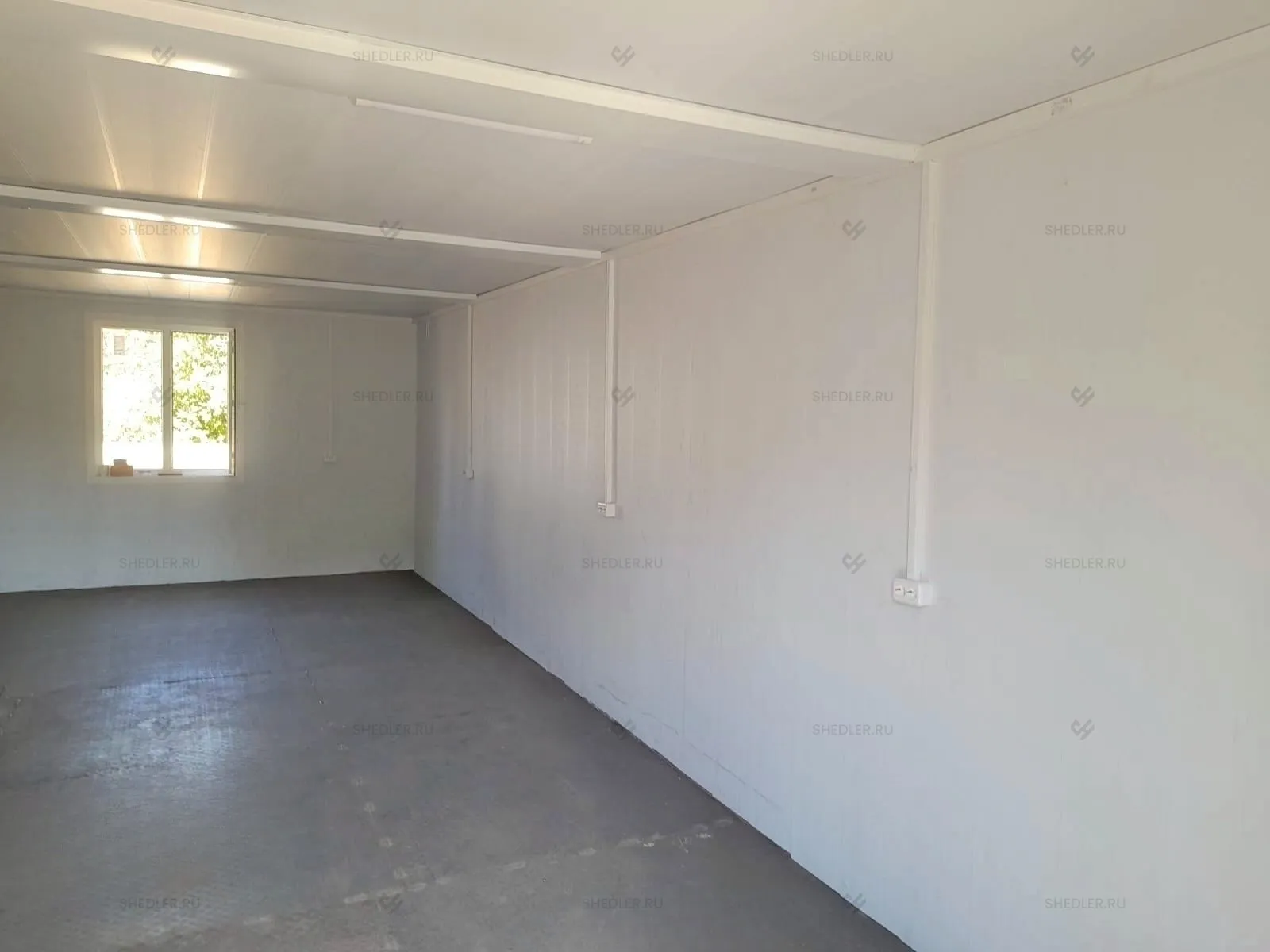Наружную отделку выполнили из профлиста, а внутреннюю отделку потолков, пола и стен - из ПВХ панелей белого цвета. Дополнительно была сделана тепло- звукоизоляция материалом УРСА 100 мм, что позволит использовать здание даже при суровых температурных условиях. Также была выполнена пароизоляция пленкой 40 мкм. На полу уложена чечевица толщиной 3 мм.