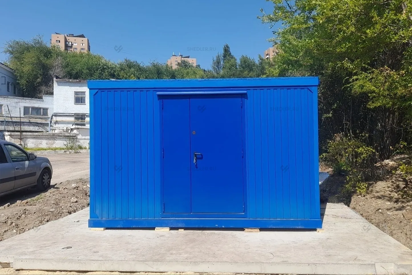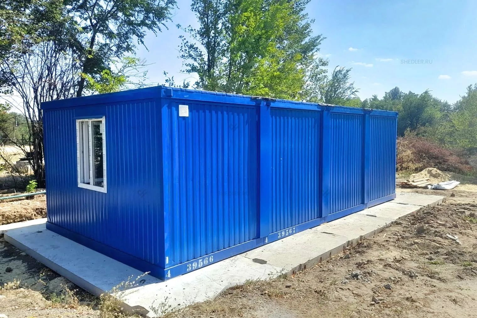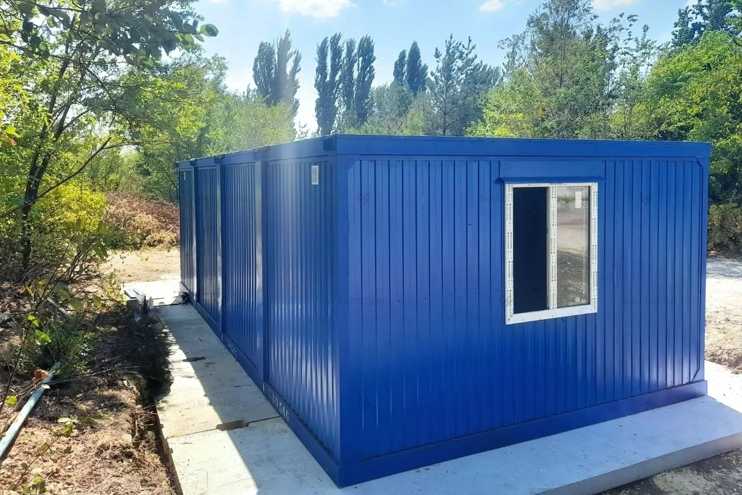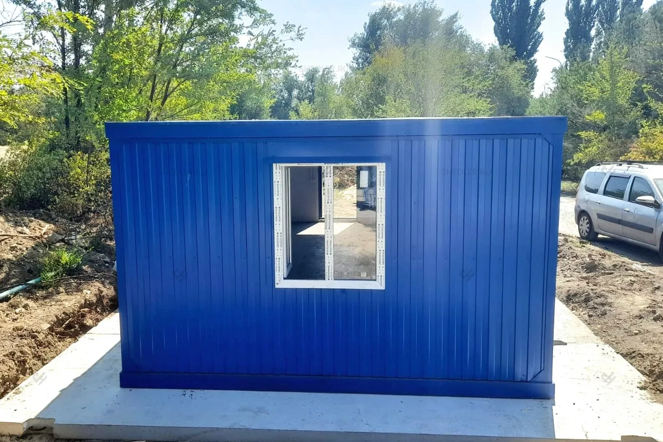 Нами была изготовлена конструкция размером 8 х 4 м общей площадью 32 кв.м с плоской крышей в популярном синем цвете RAL 5005.