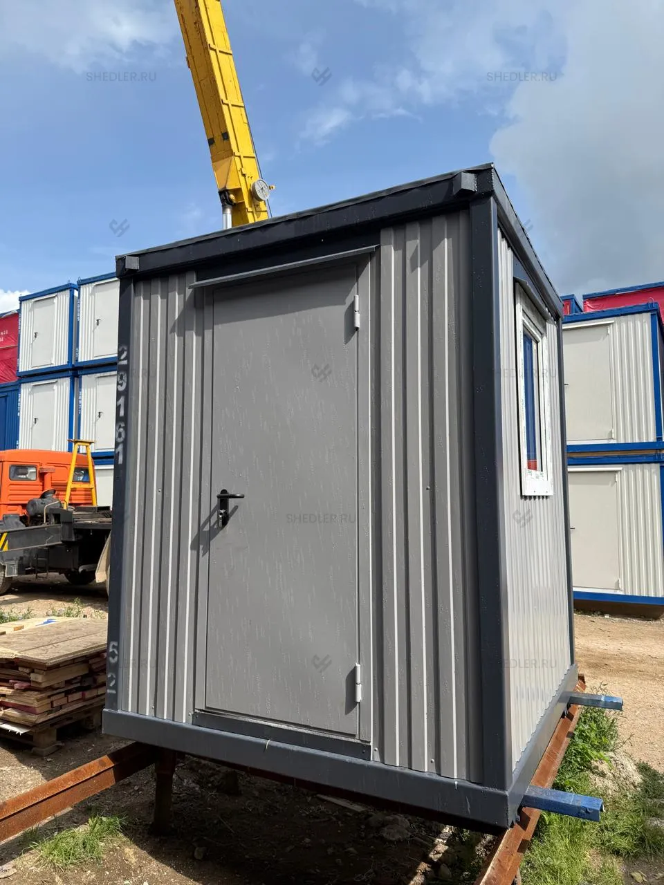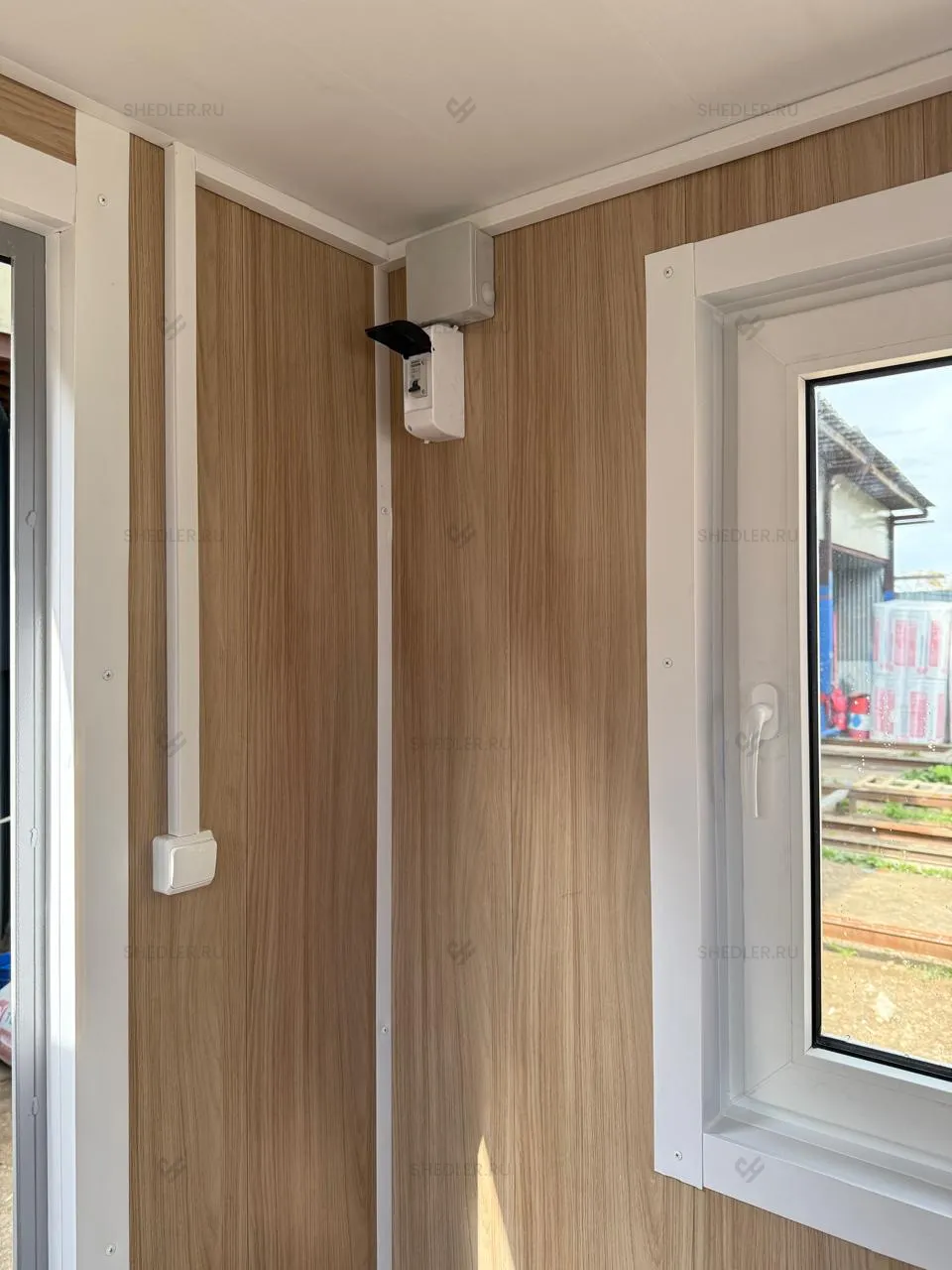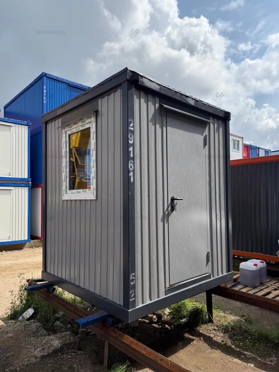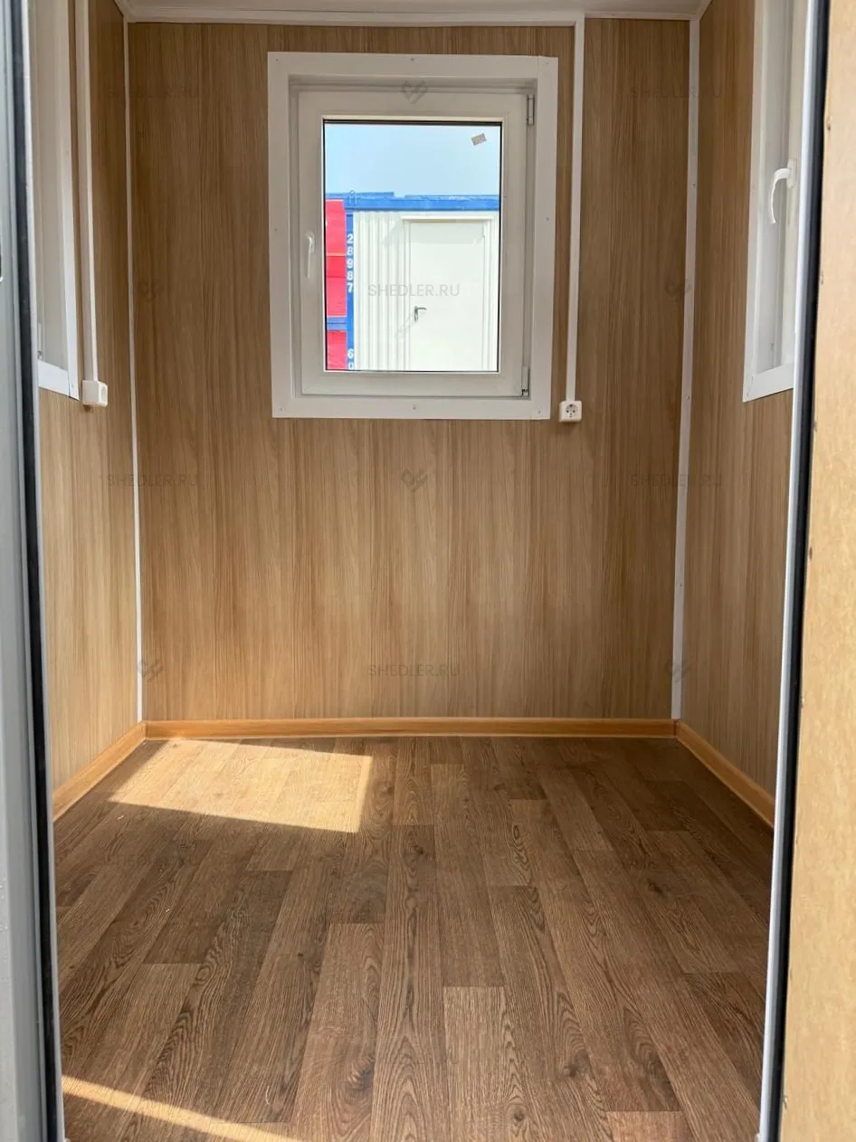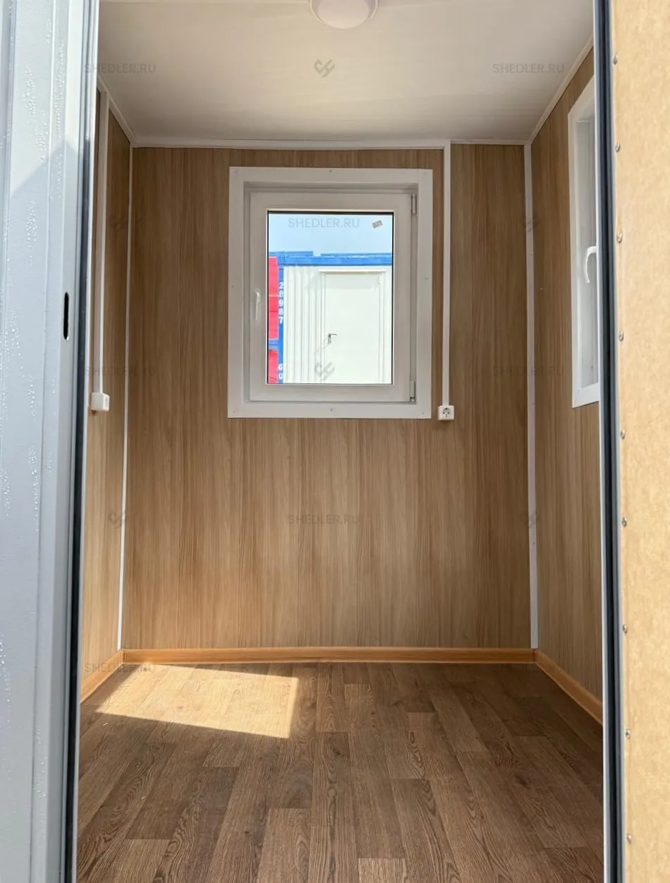Для естественного освещения и обзора территории предусмотрены три пластиковых окна размером 0,9 х 0,9 м с двойным остеклением, а входная дверь оснащена замком, обеспечивающим безопасность и удобный доступ.