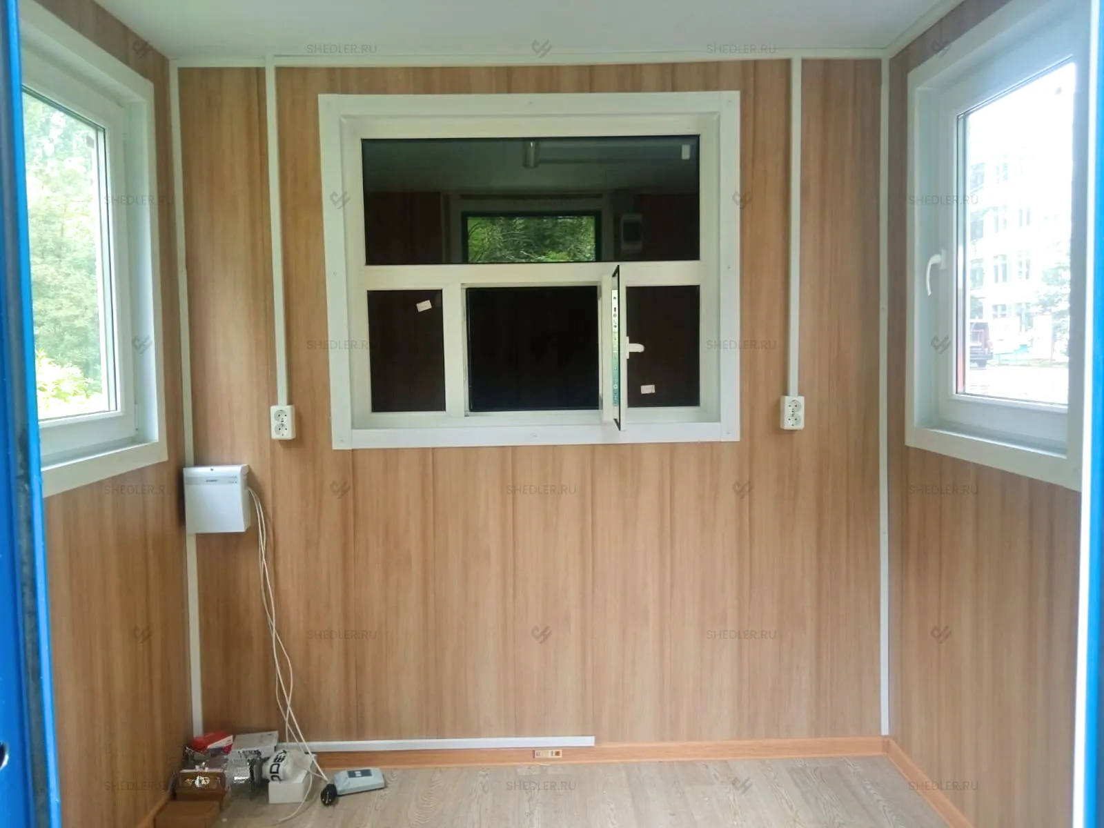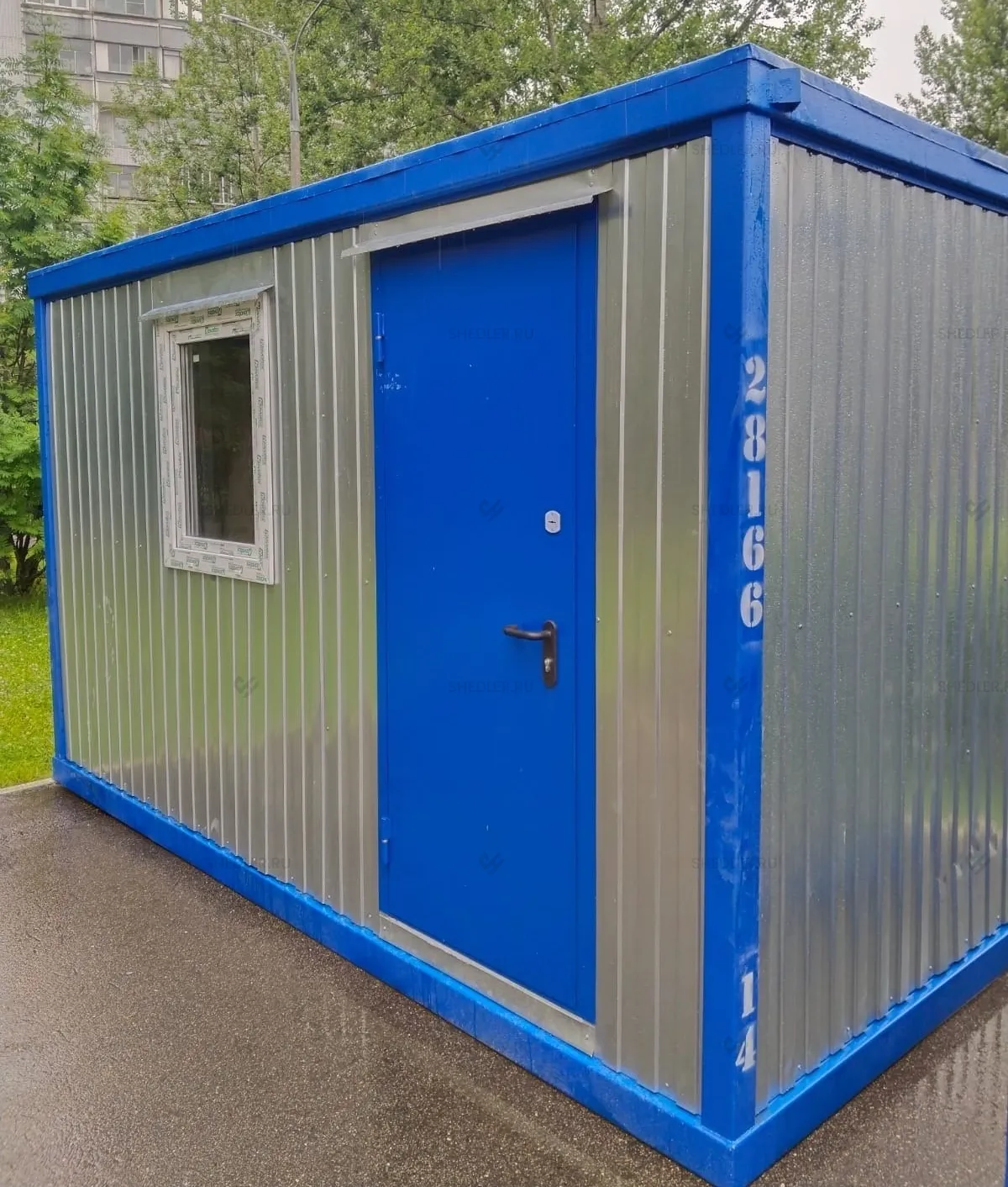 Недавно к нам обратился заказчик, которому было необходимо небольшое здание проходной. Под эту задачу отлично подошел блок-контейнер БК-012 размером 4 х 2,45 х 2,45 м и общей площадью 9,8 кв.м с плоской крышей, сварной из стального листа 0,7 мм.
