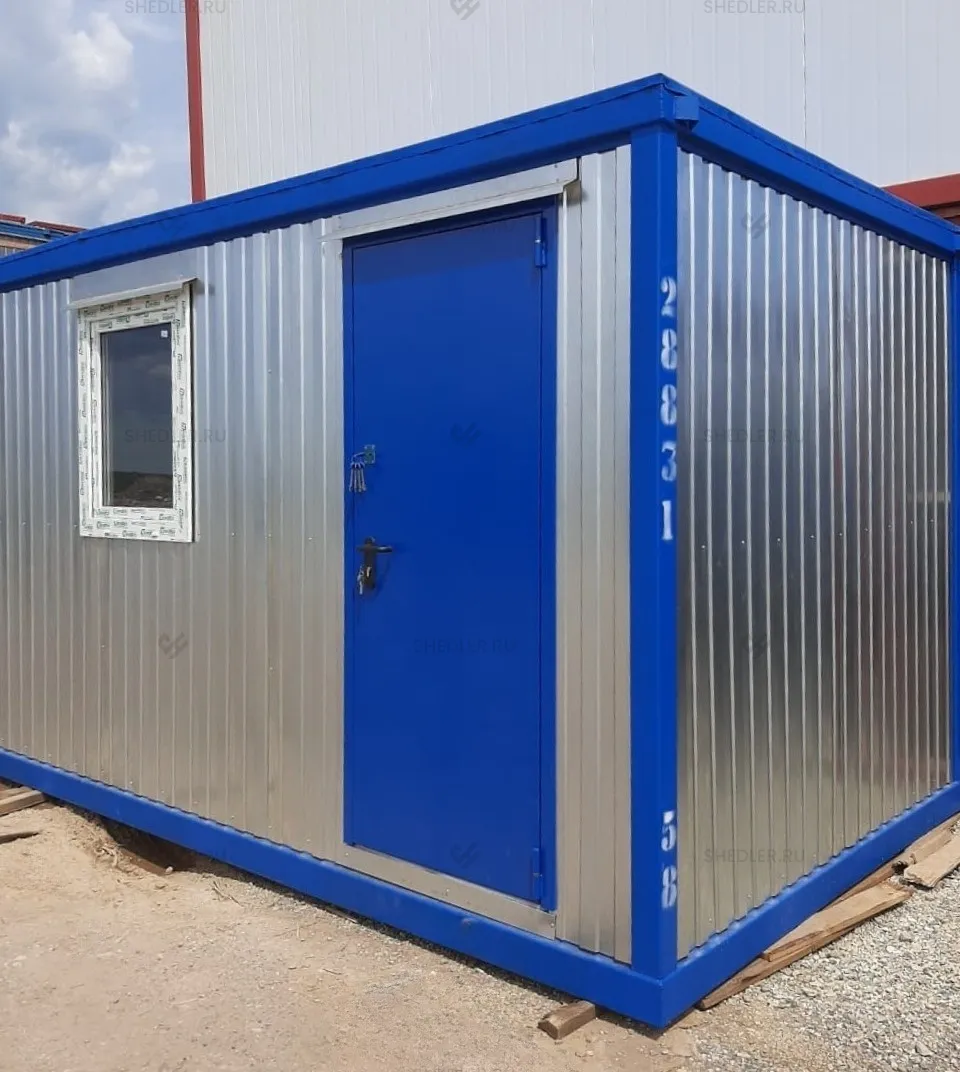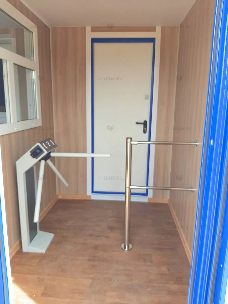 Контейнер получился компактный и функциональный: его габариты — 2,4×3,0 м — позволяют разместить проходную даже в самом стесненном пространстве. Конструкция собрана на прочном металлокаркасе с жёсткими угловыми стойками. Снаружи — оцинкованный профлист с полимерным покрытием, а акценты в синих тонах (RAL 5005) добавляют эстетики. Крыша сварная, утеплённая, с защитой от осадков.