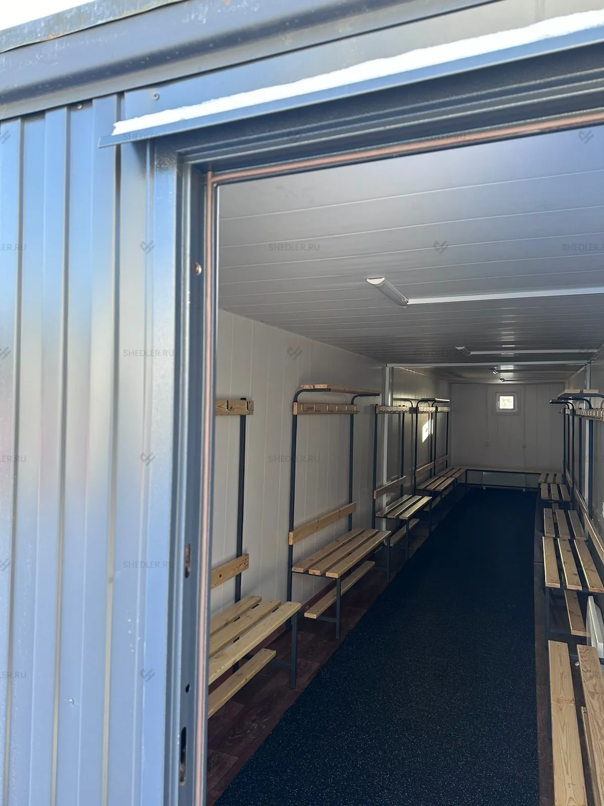 На изготовление потребовалось 10 дней. Доставляли модульную раздевалку заказчику двумя манипуляторами.