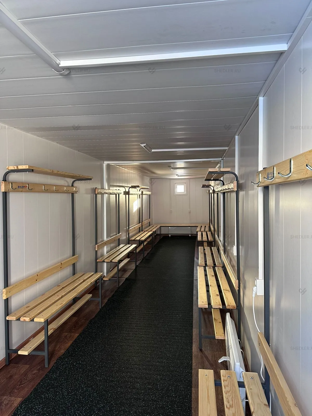 На пол модульной раздевалки была уложена OSB-плита 12 мм и бытовой линолеум. Внутренняя отделка выполнена из МФД панелей в цвете ясень классик для стен и белый – для потолка.