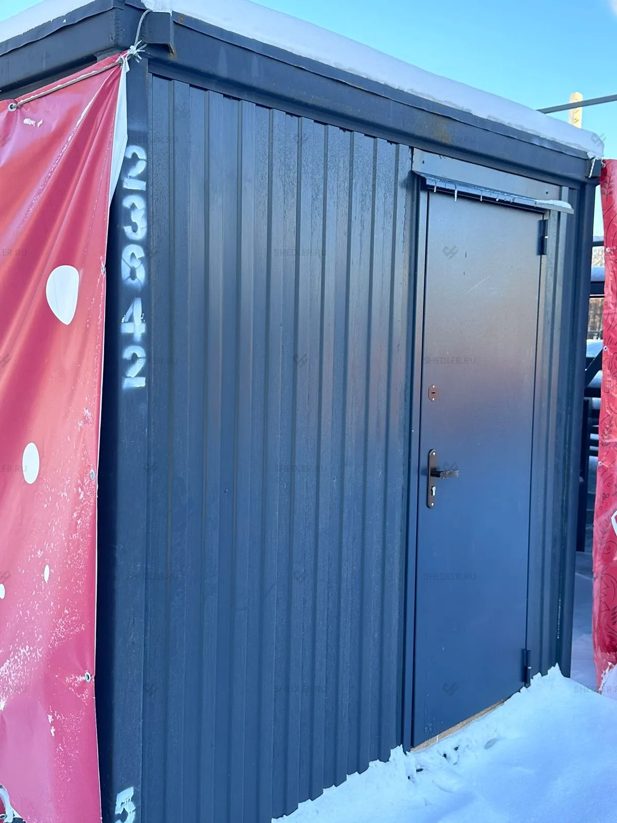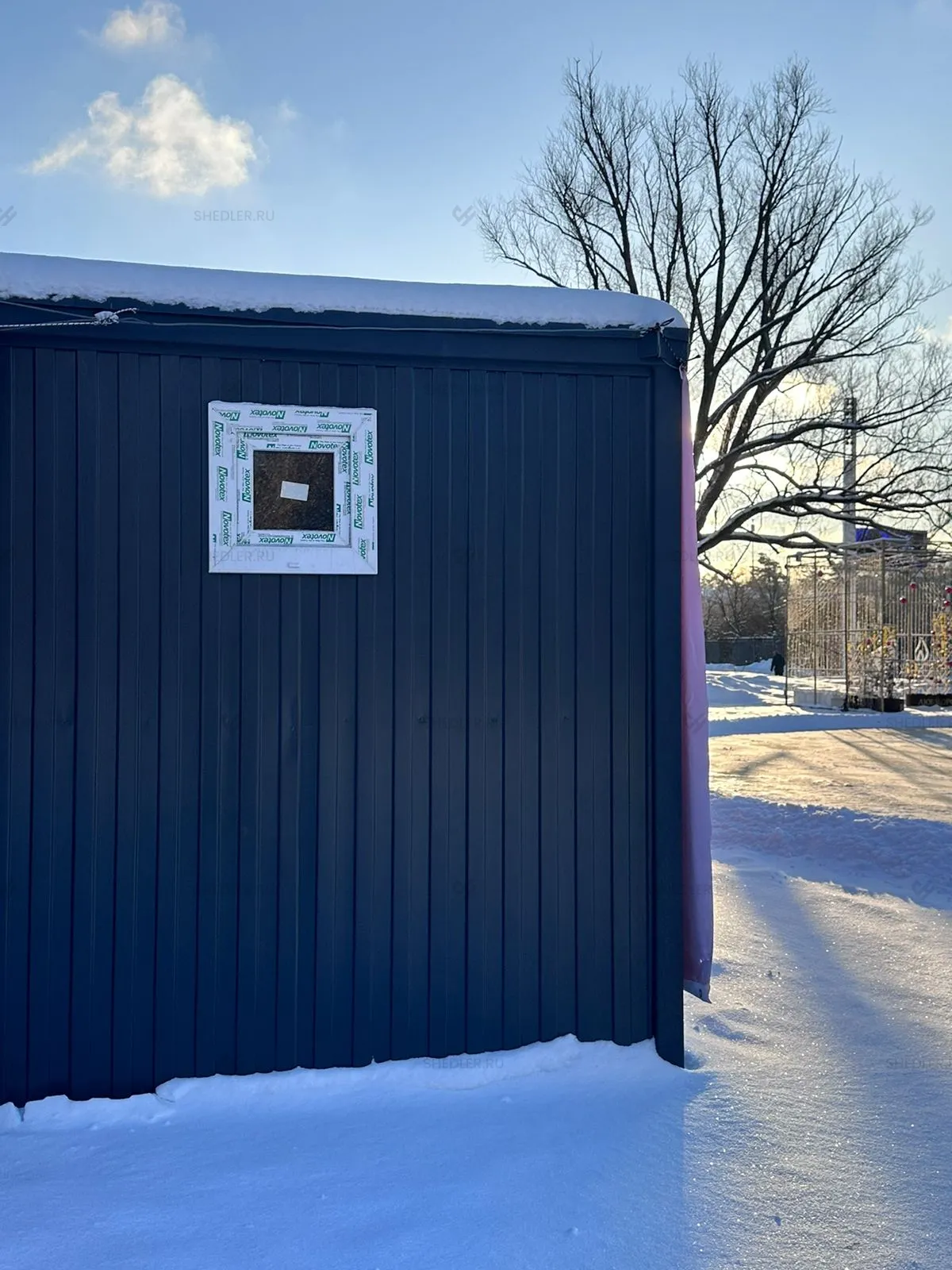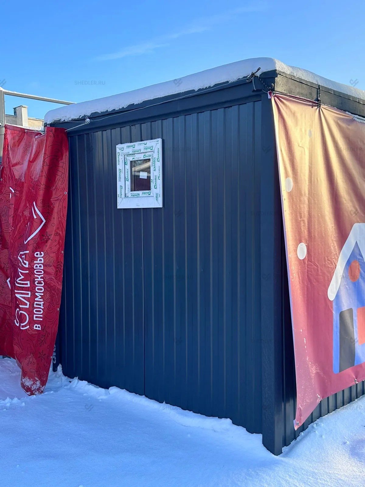 Дополнительно были установлены металлическая утепленная дверь с врезными замками в графитовом цвете и поворотное ПВХ окно 50 х 50 см.